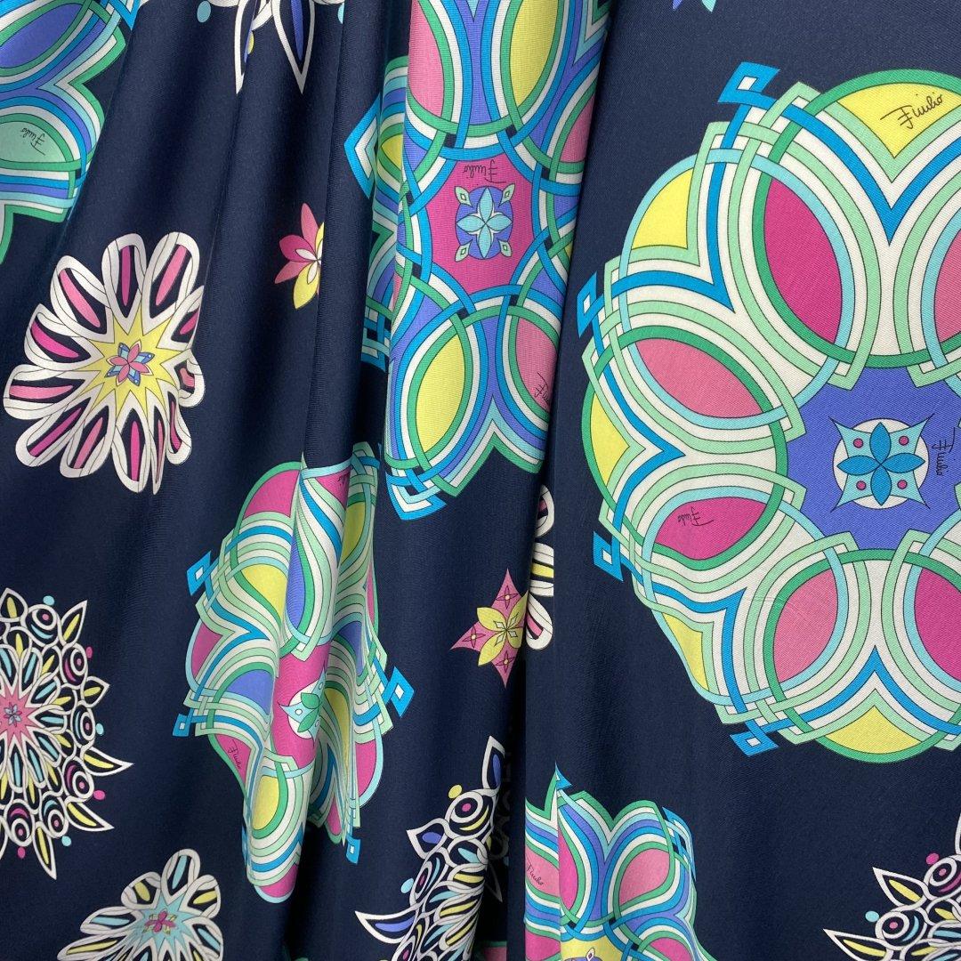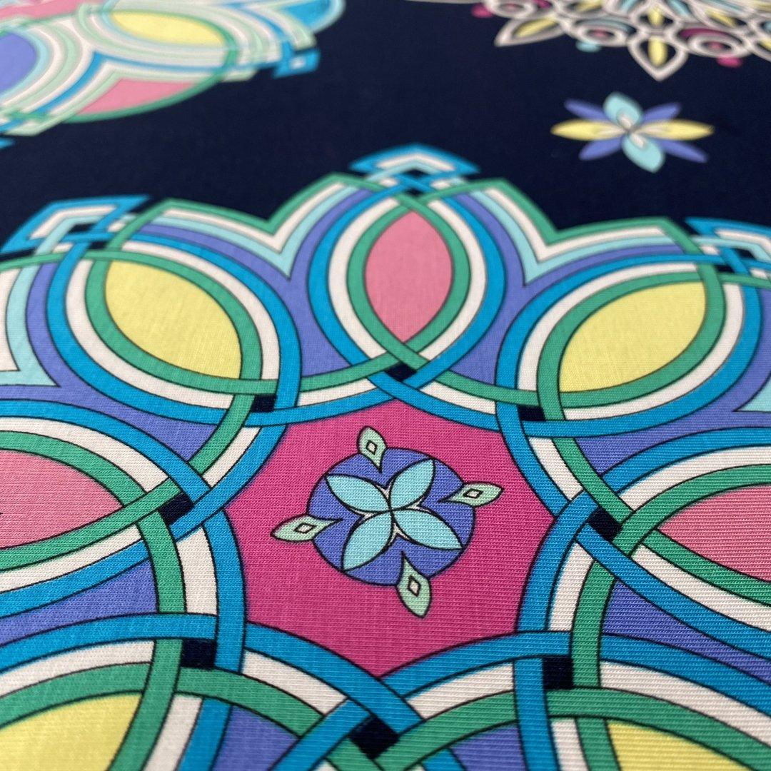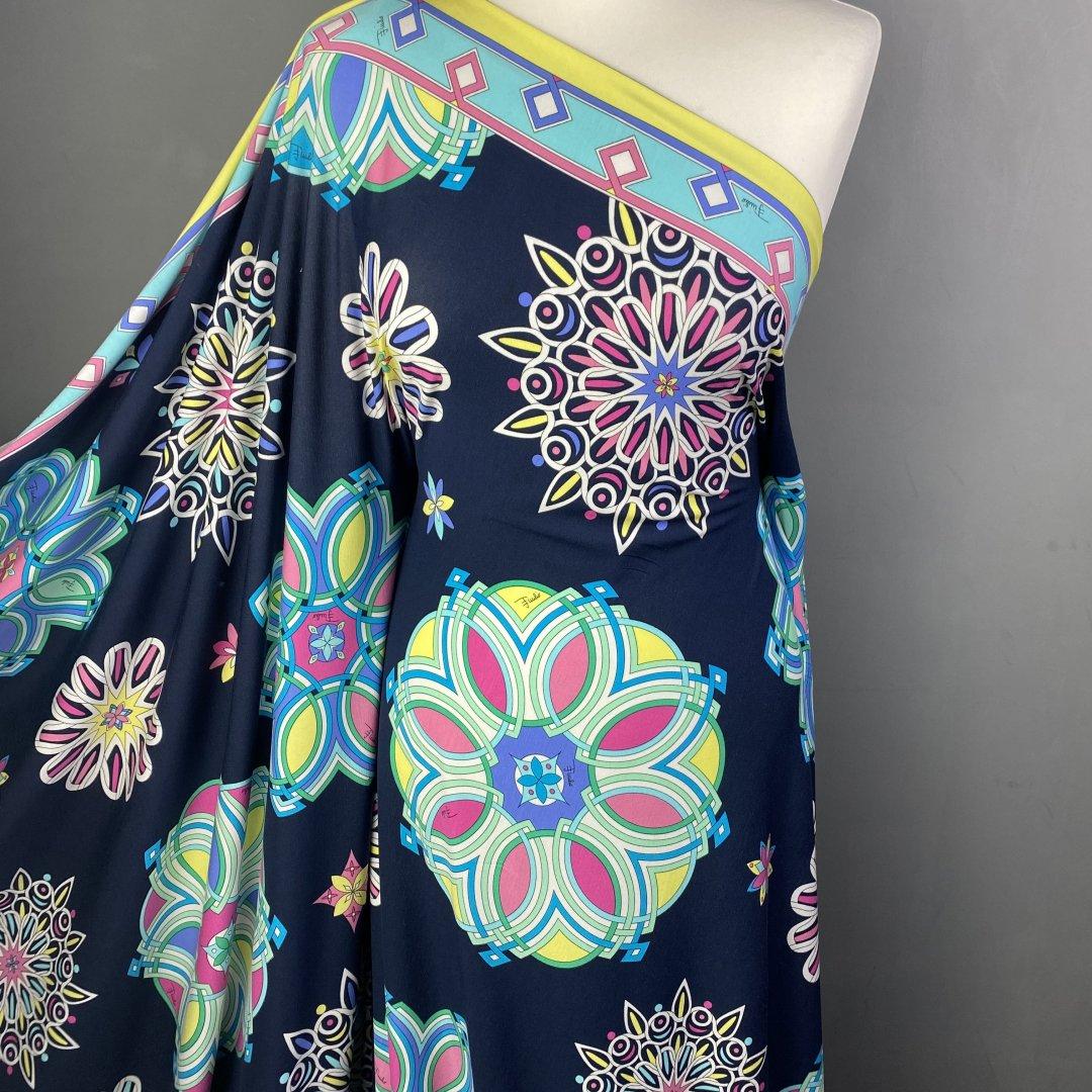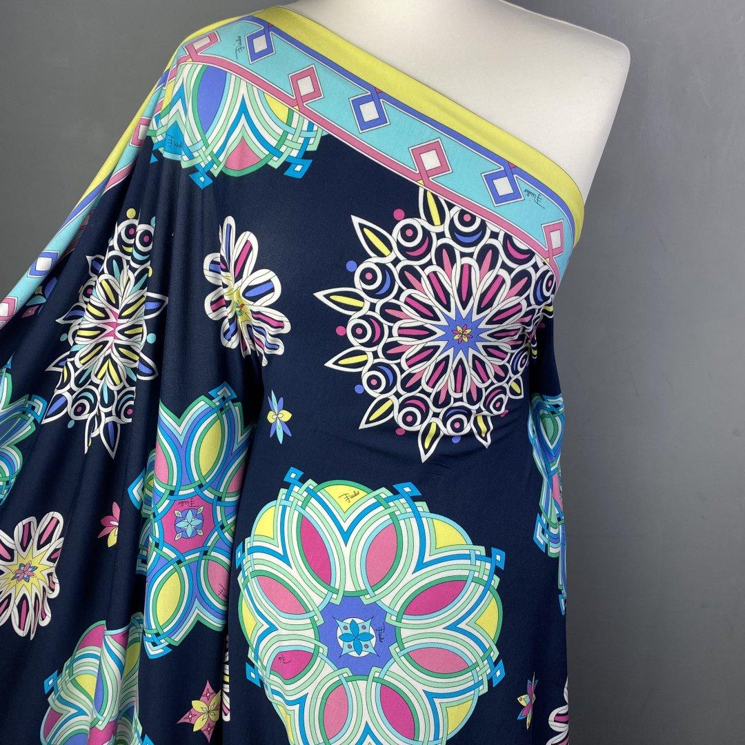 Abstract Design Printed Jersey Navy Background is a super soft rayon elastane, 145cm wide. This stunning cloth is from a very well known international fashion designer. This fabric is perfect for long maxi dresses, jumpsuits, trousers, leggings, skirts, tops, kaftans and so much more. The print will create a unique fancy summer dress and/ or evening wear. Complementing colour tones create a chic summer holiday vibe. The thin printed border can be used as cuffs, at top of your garment or as a border at the bottom of you garment. A pleasure to sew with and has a soft smooth feel to it. Our washing recommendations for this fabric are dry clean only or if unsure, test-wash a small 10x10cm square in cool water at 30 degrees first.