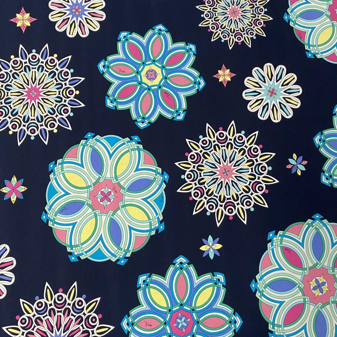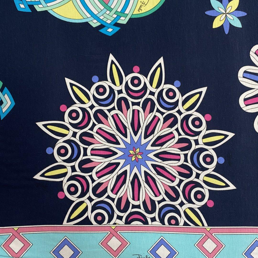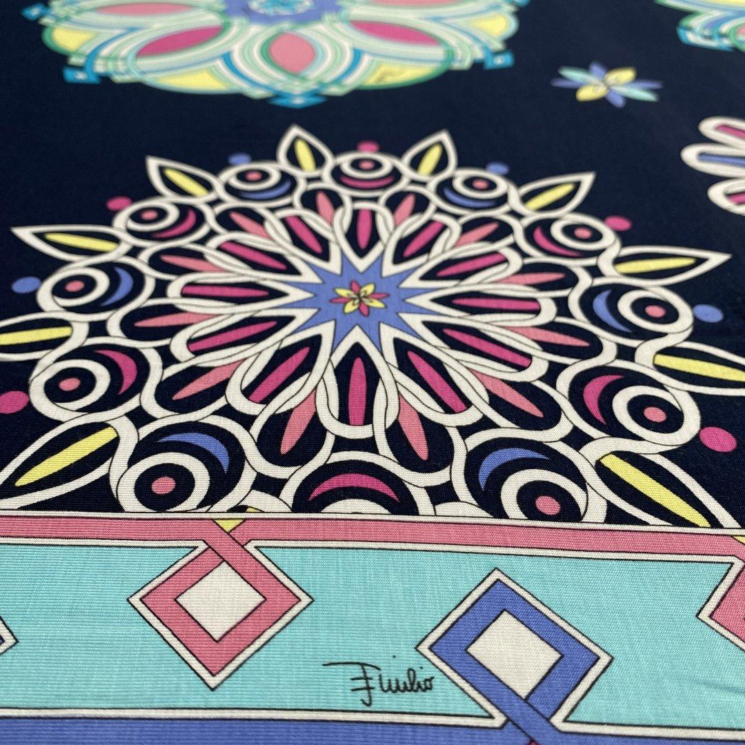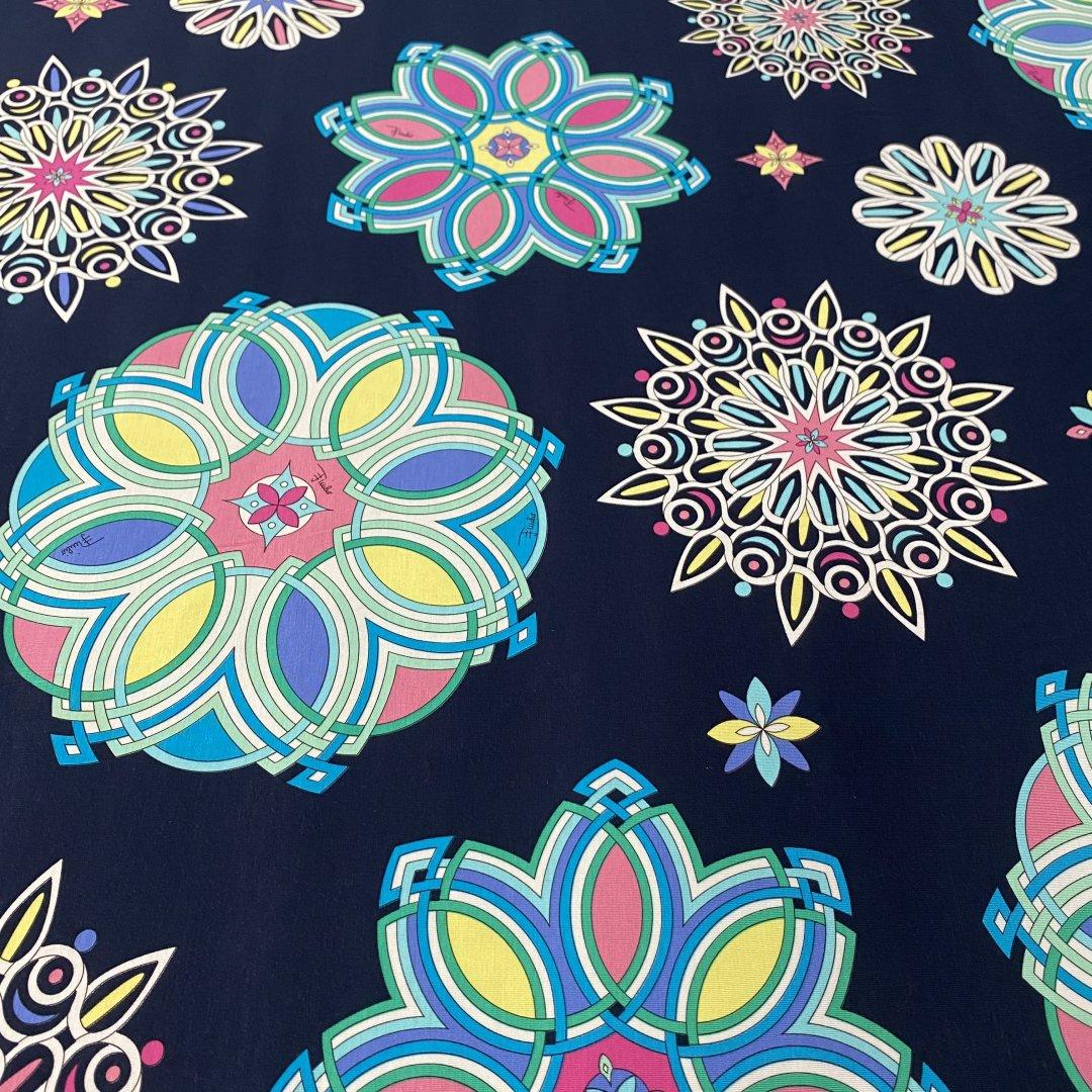 Abstract Design Printed Jersey Navy Background is a super soft rayon elastane, 145cm wide. This stunning cloth is from a very well known international fashion designer. This fabric is perfect for long maxi dresses, jumpsuits, trousers, leggings, skirts, tops, kaftans and so much more. The print will create a unique fancy summer dress and/ or evening wear. Complementing colour tones create a chic summer holiday vibe. The thin printed border can be used as cuffs, at top of your garment or as a border at the bottom of you garment. A pleasure to sew with and has a soft smooth feel to it. Our washing recommendations for this fabric are dry clean only or if unsure, test-wash a small 10x10cm square in cool water at 30 degrees first.
