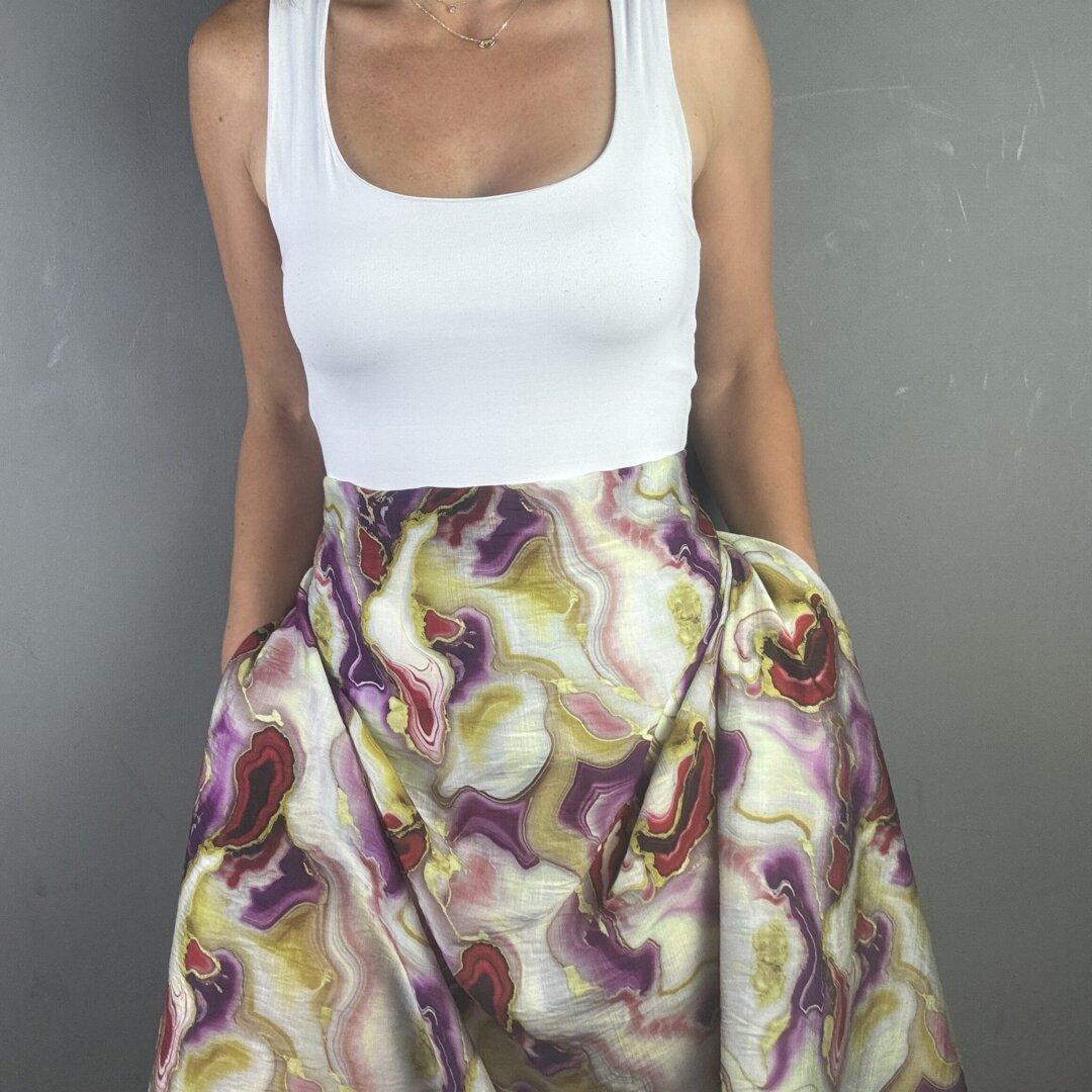 Bamboo Swirl Stone is 90% Bamboo, 10% Nylon 148cm wide. This is a light weight, breathable fabric that is perfect for shift dresses, circler skirts, pleated skirts, shirts, tunic tops, straight skirts, summer weight jackets, A- line skirts/ dresses and so much more.