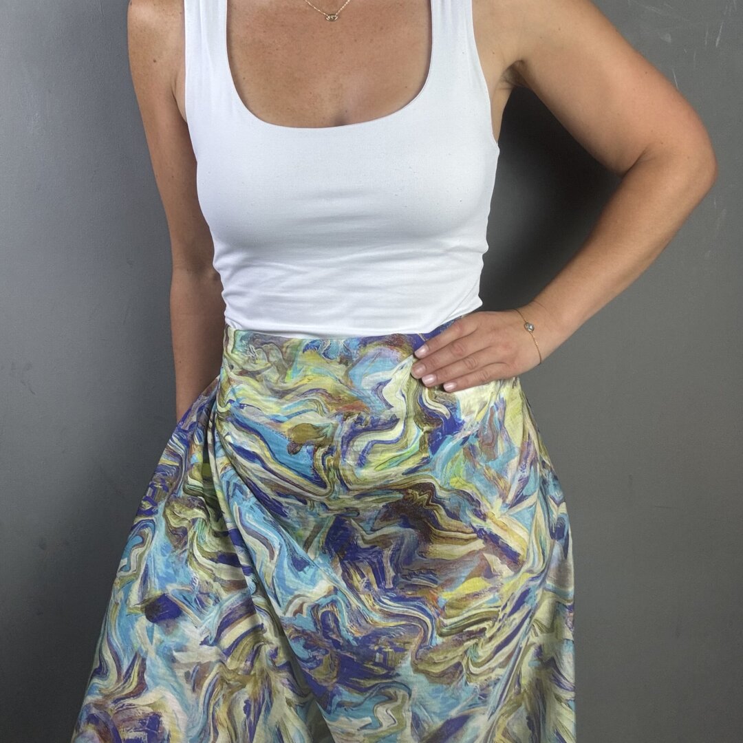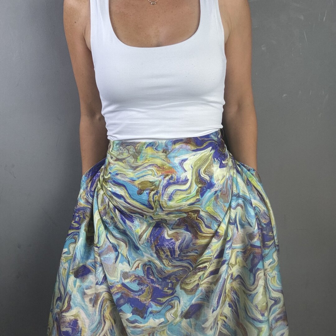 Bamboo Tye Dye Wave is 90% Bamboo, 10% Nylon 148cm wide. This is a light weight, breathable fabric that is perfect for shift dresses, circler skirts, pleated skirts, shirts, tunic tops, straight skirts, summer weight jackets, A- line skirts/ dresses and so much more.