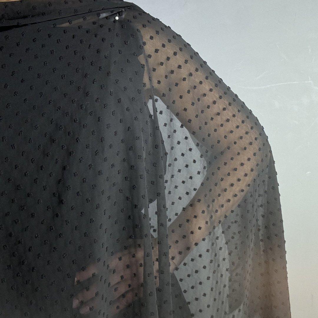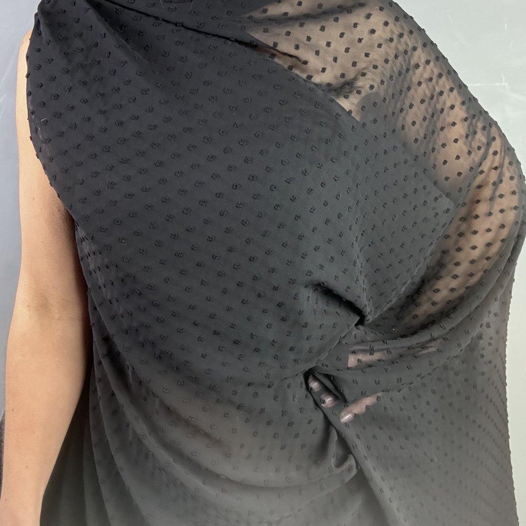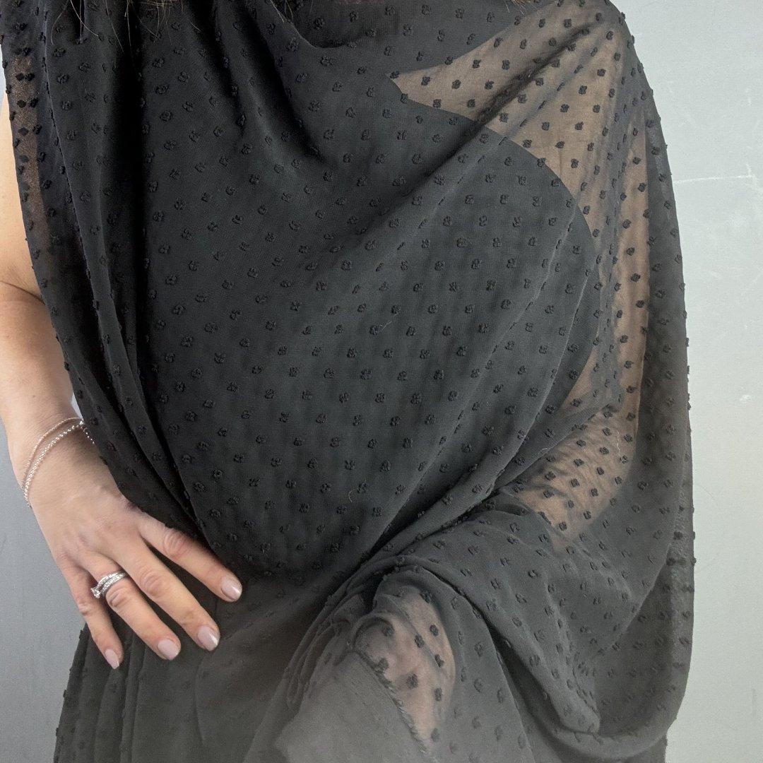 Black Polyester Dobby is 150cm wide. This is a light weight, transparent, quality cloth that looks so chic and glamorous. Polyester Dobby is perfect for wrap dresses, tops, shirts, maxi dresses, gathered skirts, kaftans, beach wraps, light weight cardigans and so much more. This truly is a beautiful, simple cloth that will become a staple in your wardrobe.