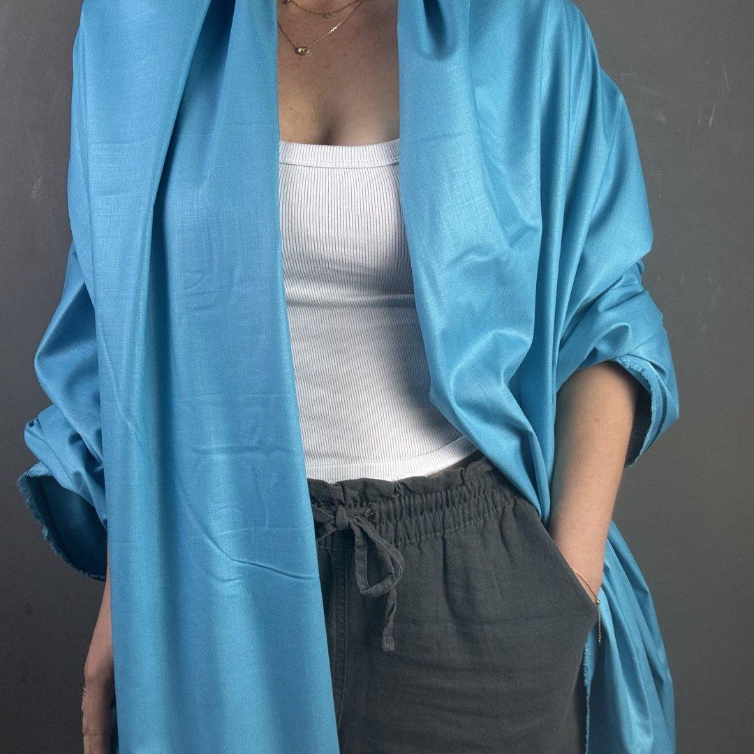 Blue Linen, Rayon and Polyester is 140cm wide. This is a light weight plain cloth with a lot of drape and body. With a slight shine this cloth is easy to sew and will be a pleasure to wear for both day and evening wear.