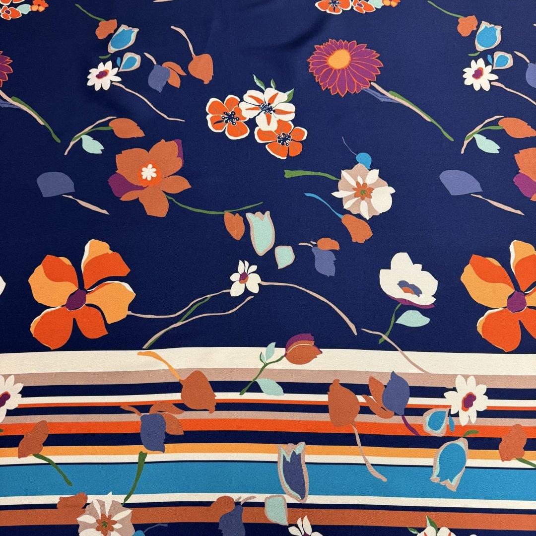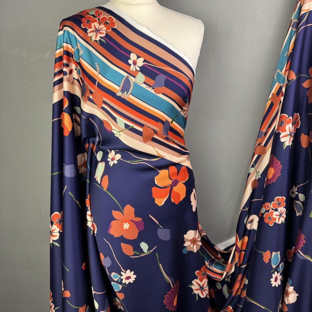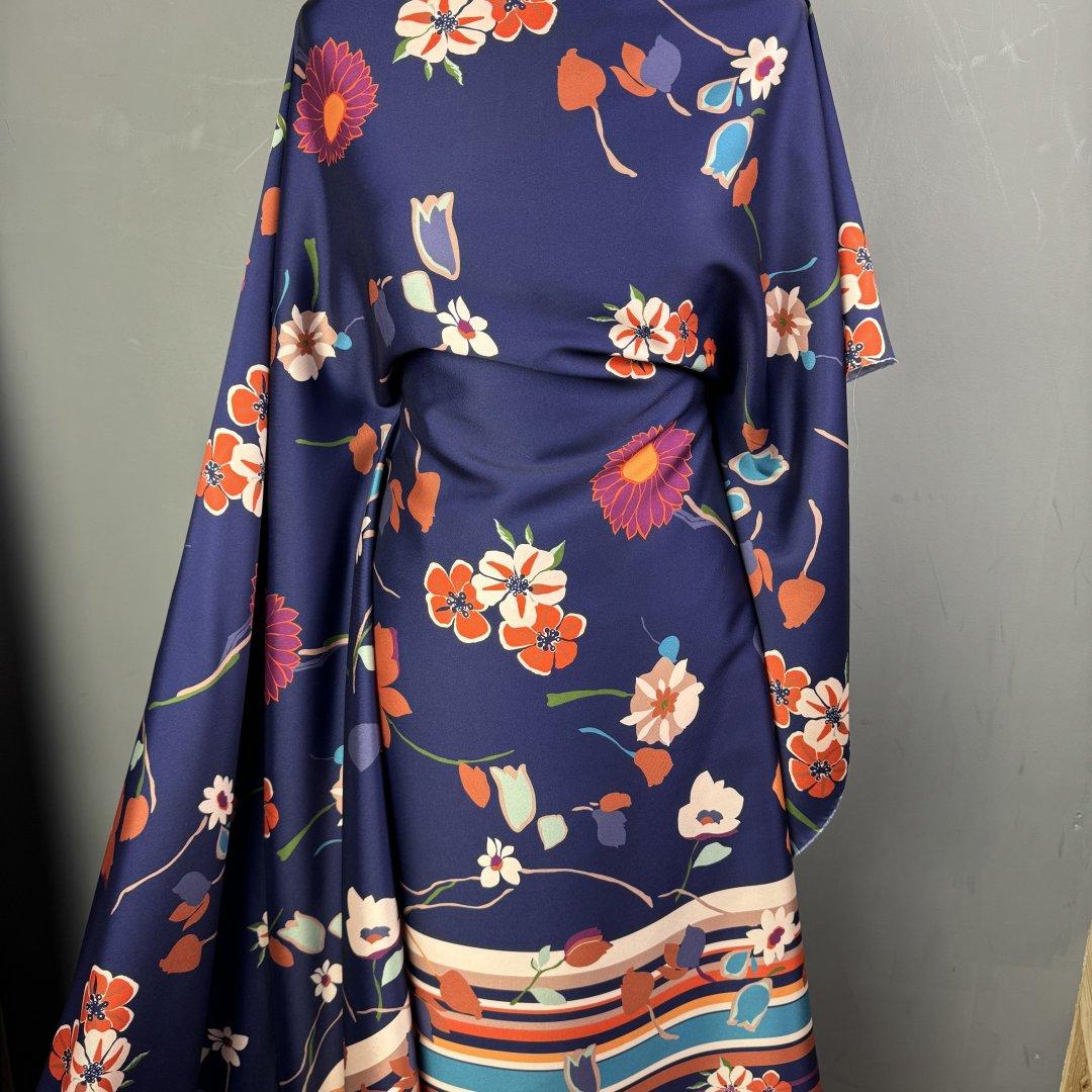 Border Flowers is 145cm wide. This is a light to medium weight polyester perfect for maxi dresses, box pleat skirts, wide leg trousers, light weight jackets, tops, shift dresses, beach wraps and more. A border print is the perfect way to get creative as the choice is yours to where you place the border.