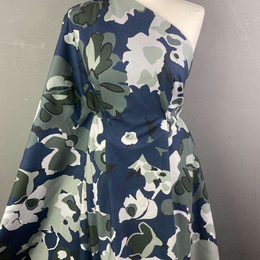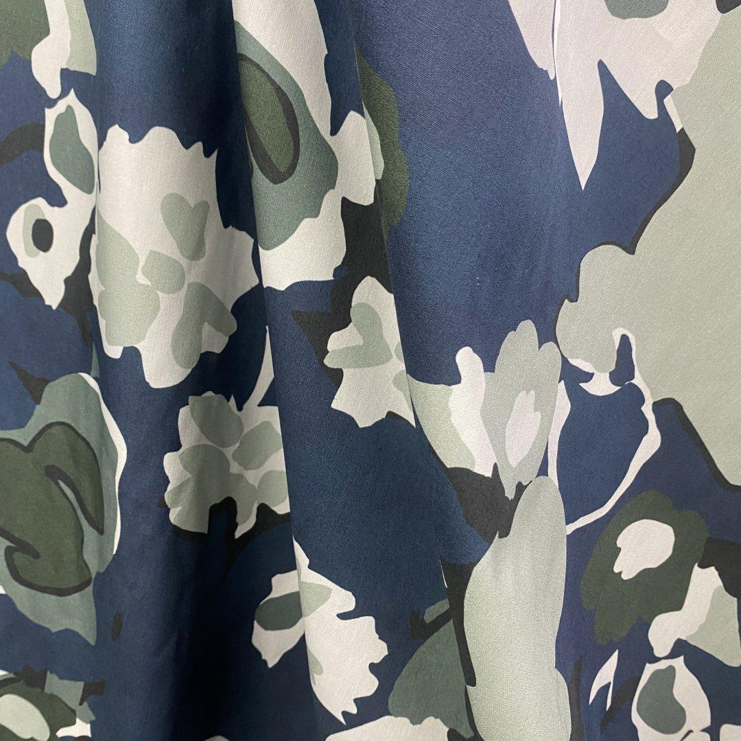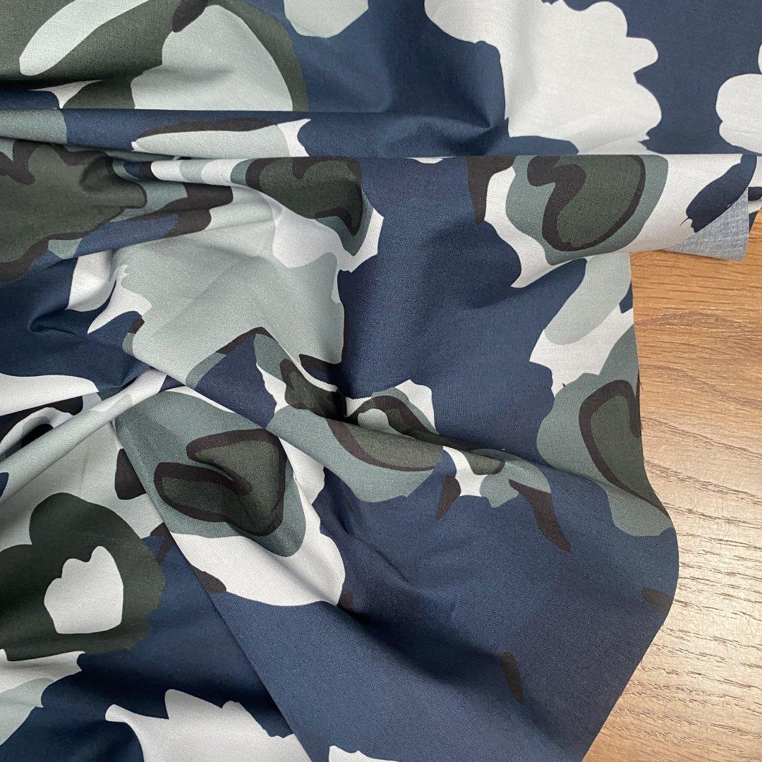 Camo Cotton Flowers is 150cm wide. This is a quality pure cotton suitable for shirts, shift dresses, skirts, tops, wrap dresses, box pleat skirts and more. Pure Cotton is very easy to sew and washes well at 30 degrees.