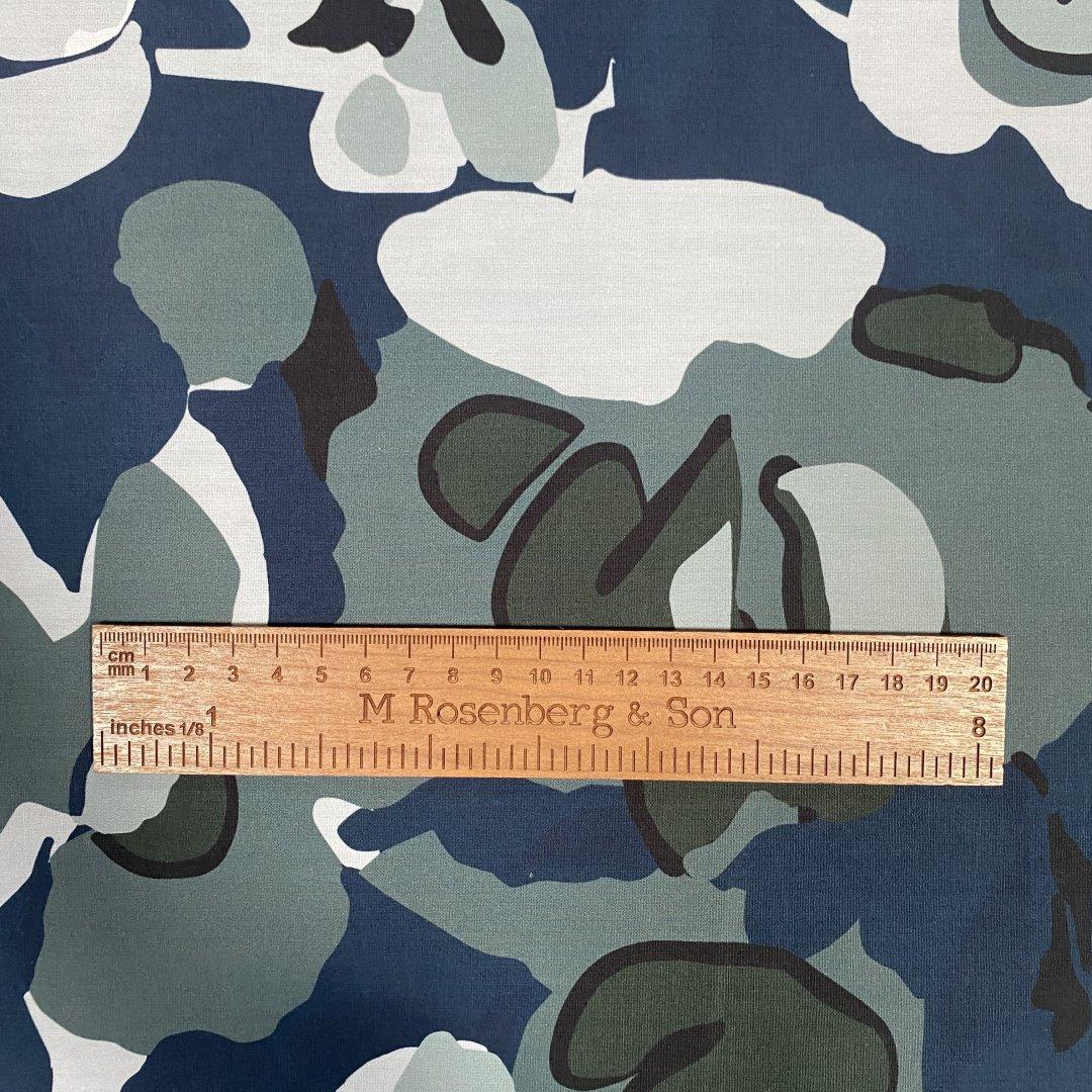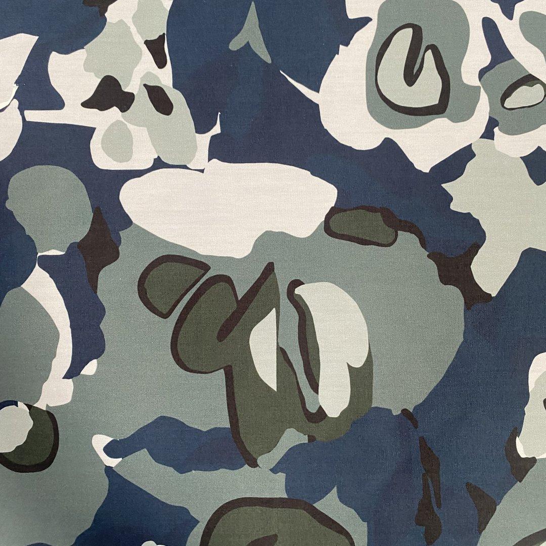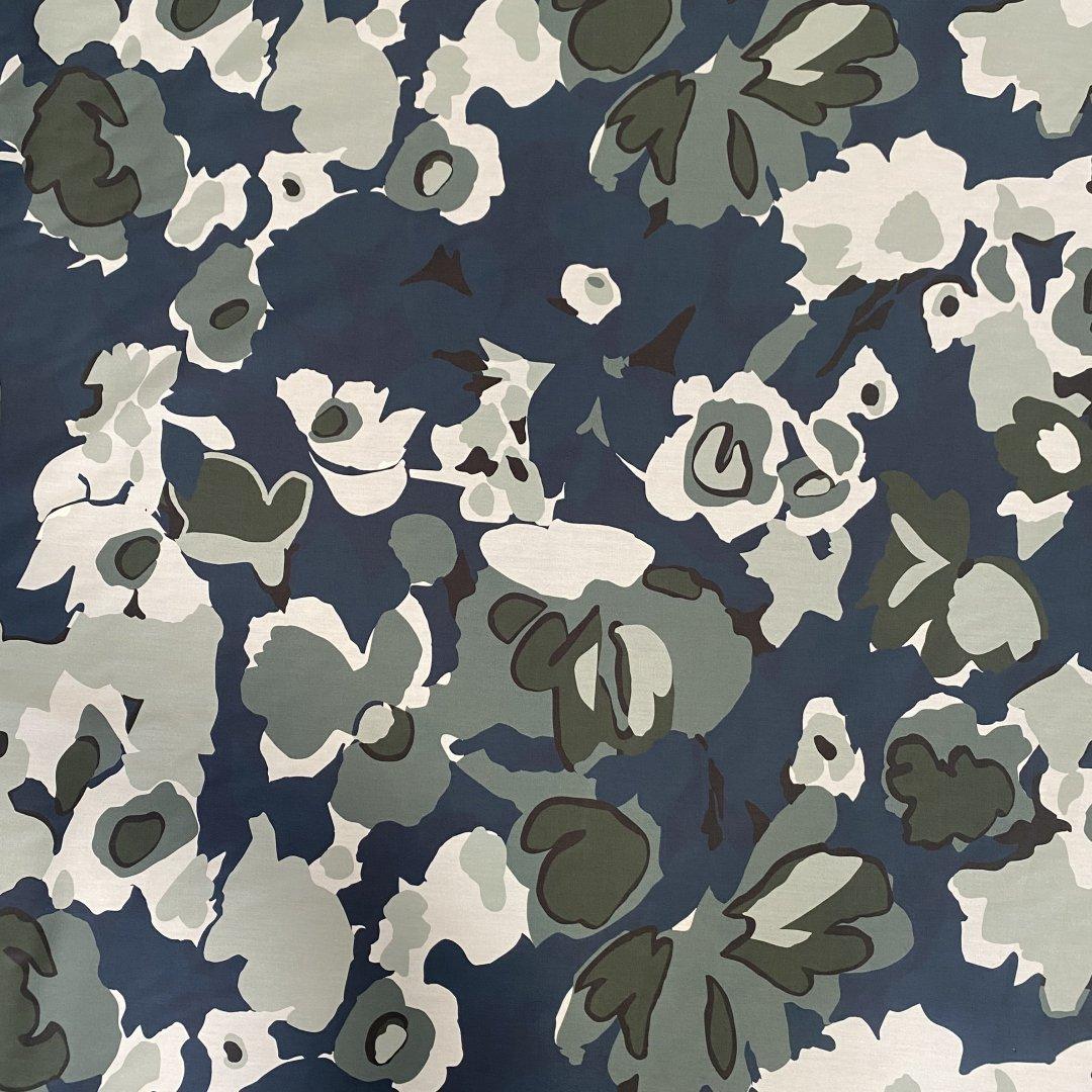 Camo Cotton Flowers is 150cm wide. This is a quality pure cotton suitable for shirts, shift dresses, skirts, tops, wrap dresses, box pleat skirts and more. Pure Cotton is very easy to sew and washes well at 30 degrees.