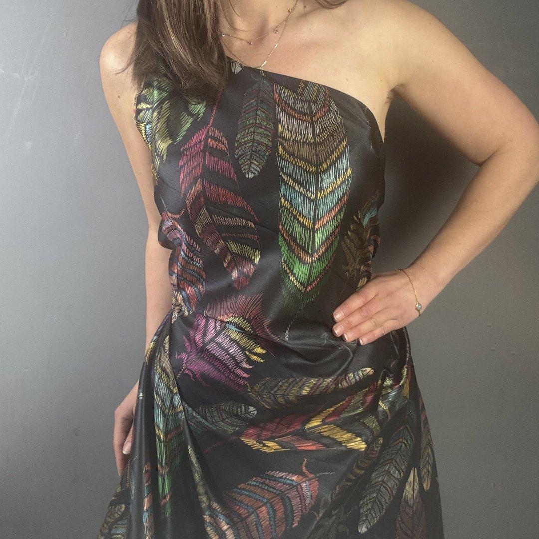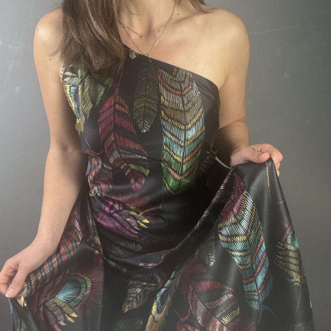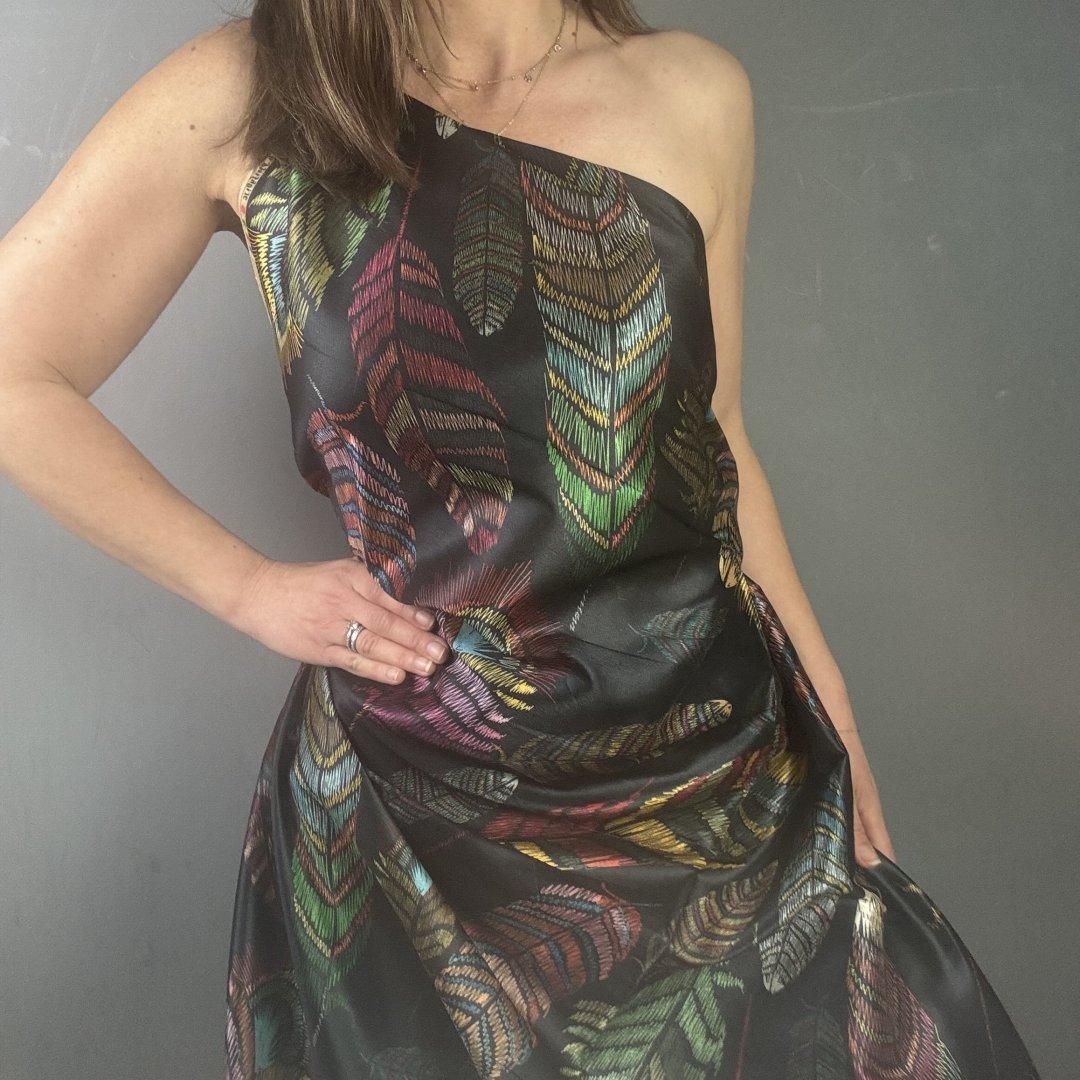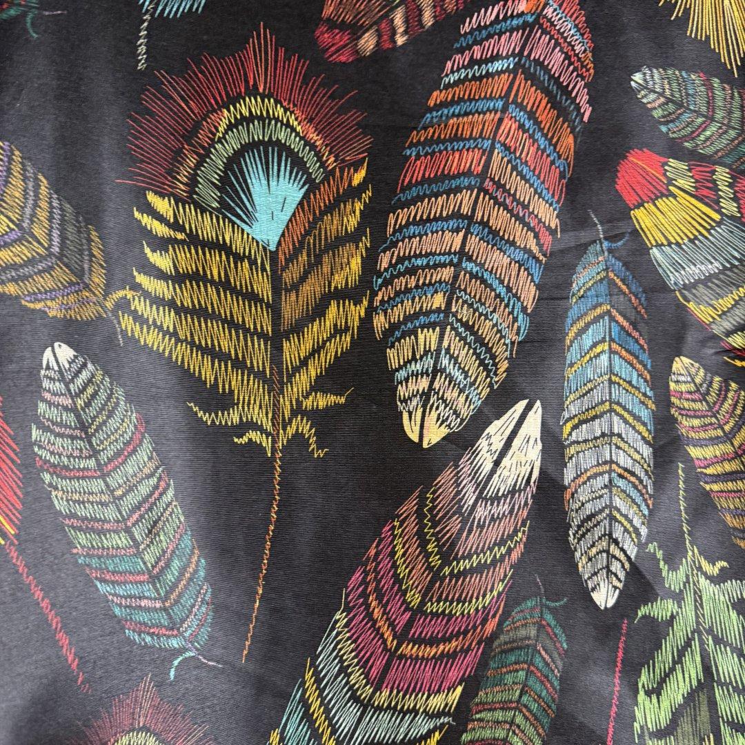 Colourful Bamboo Feathers on Black is 20% Bamboo / 40% Viscose / 40% polyester, 110cm wide. This is a light weight, breathable fabric that is perfect for shift dresses, circler skirts, pleated skirts, shirts, tunic tops, straight skirts, summer weight jackets, A- line skirts/ dresses and so much more.