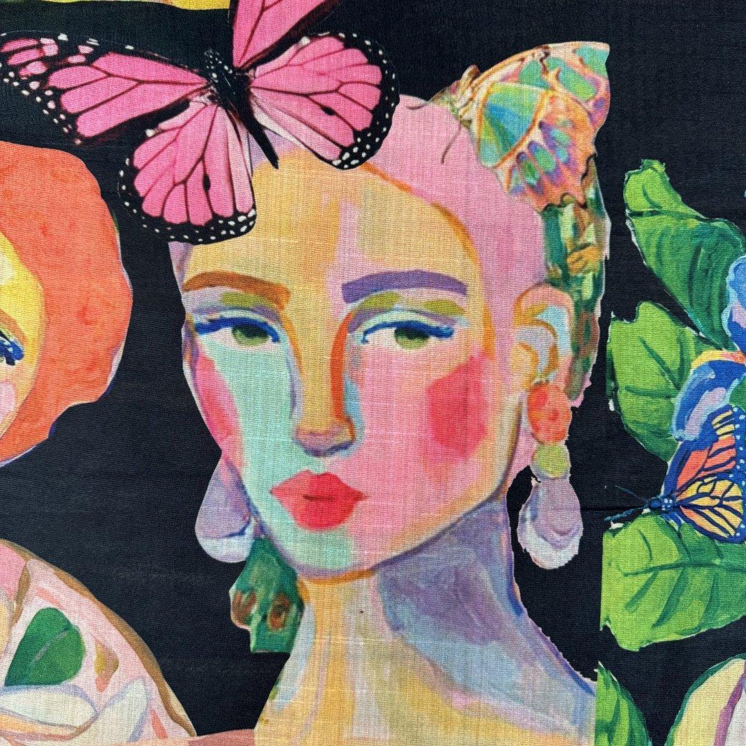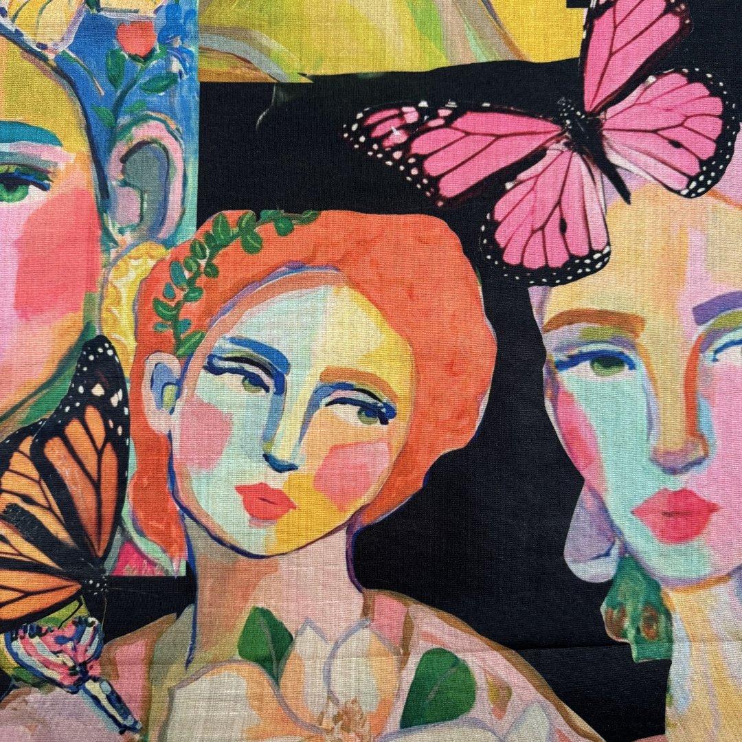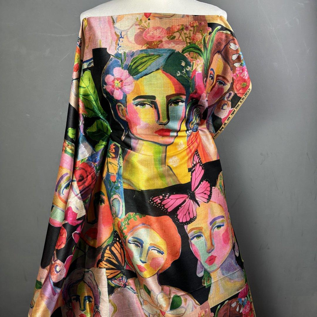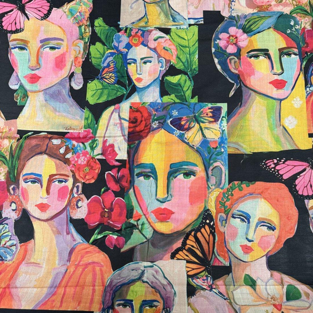 Creative Vintage Faces is 20% Bamboo / 40% Viscose / 40% polyester, 110cm wide. This is a light weight, breathable fabric that is perfect for shift dresses, circler skirts, pleated skirts, shirts, tunic tops, straight skirts, summer weight jackets, A- line skirts/ dresses and so much more.