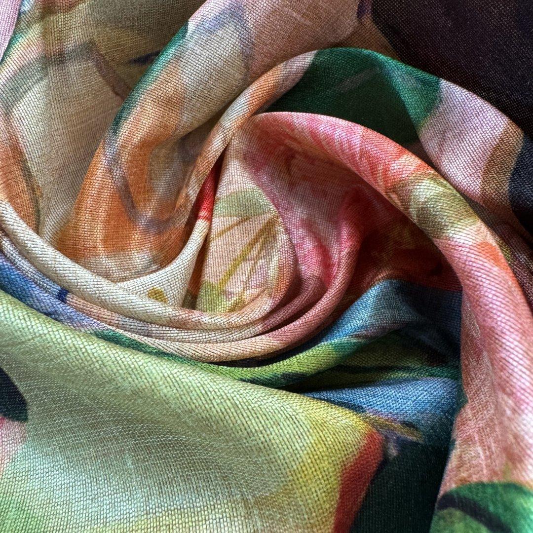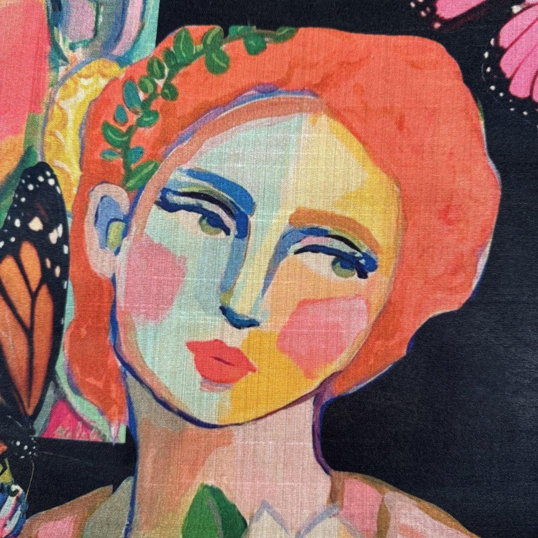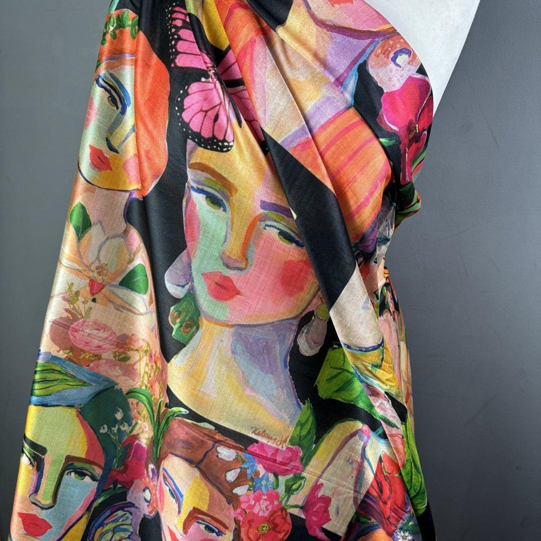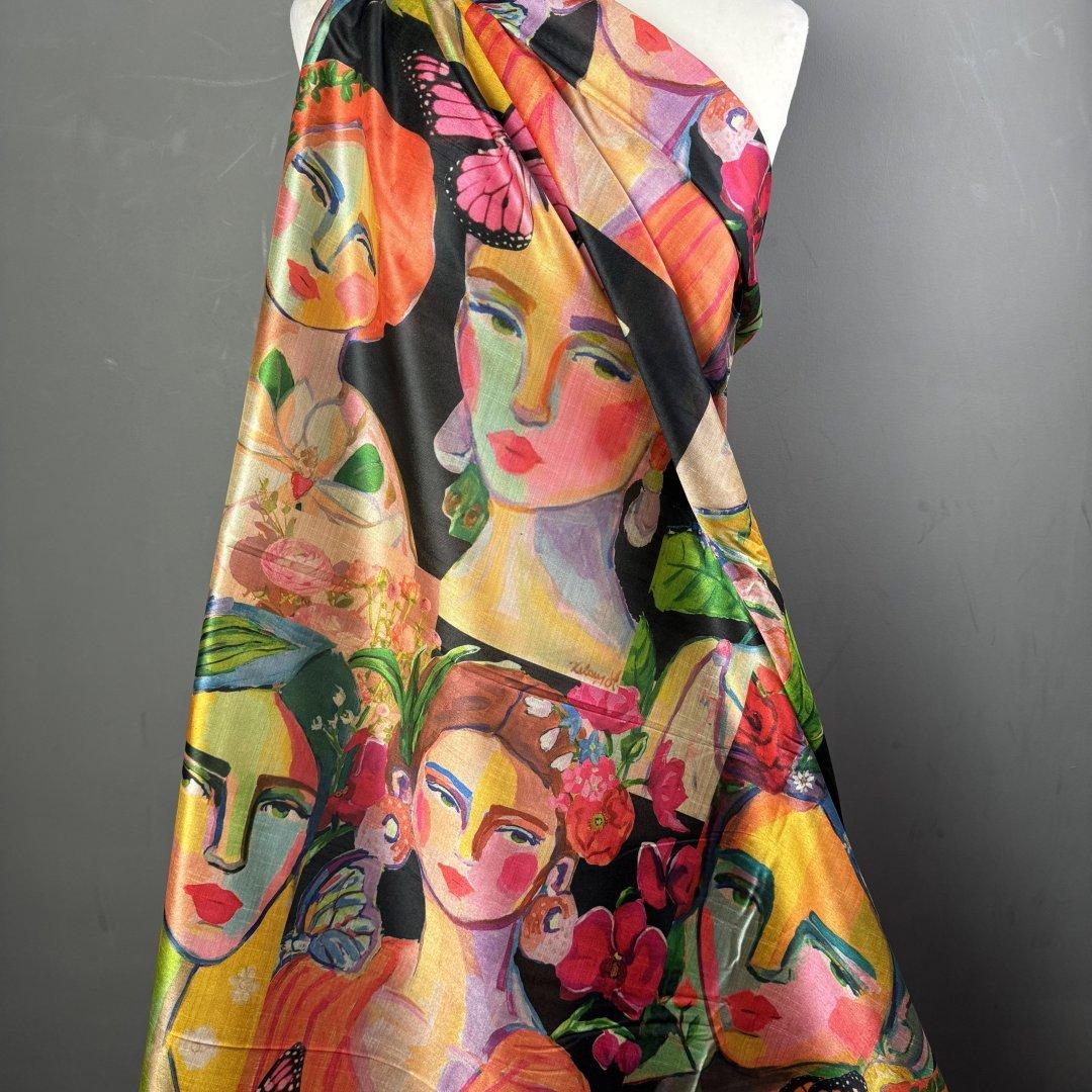 This cloth is slightly sheer in the light. It will be a pleasure to sew and look fabulous in most garments. It’s a busy, colourful fabric that is suitable for day and occasional wear. Enjoy this cloth while stocks last!!!