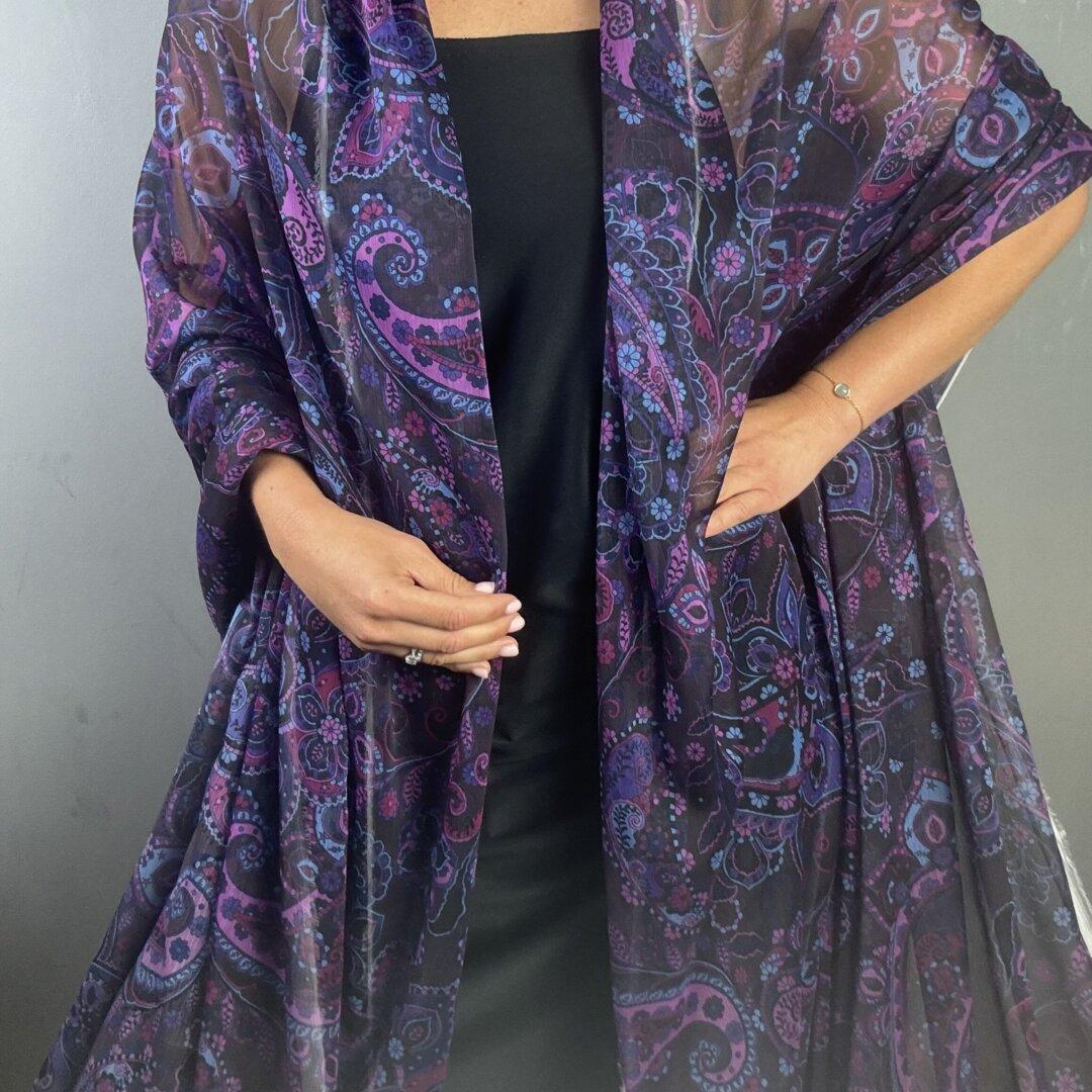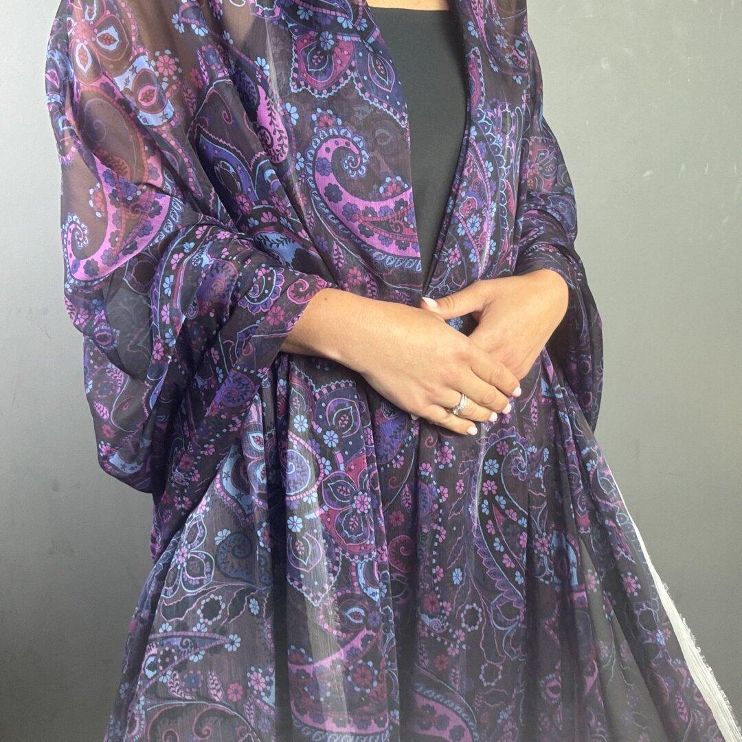 Crinkle Paisley Chiffon is 150cm wide. This is a stunning light weight transparent cloth that is perfect for skirts, dresses, floaty blouses, tops, kaftans and so much more.
