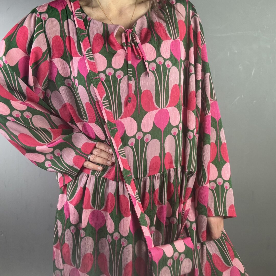 Crinkle Polyester Pink and Green is 150cm wide. This is a light weight fabric with a fluid drape and sensational complimenting colour tones. A gorgeous print makes this the perfect fabric for day wear and special occasions. Suitable for maxi dresses, skirts, shirts, kaftans, kimonos, jumpsuits and so much more.