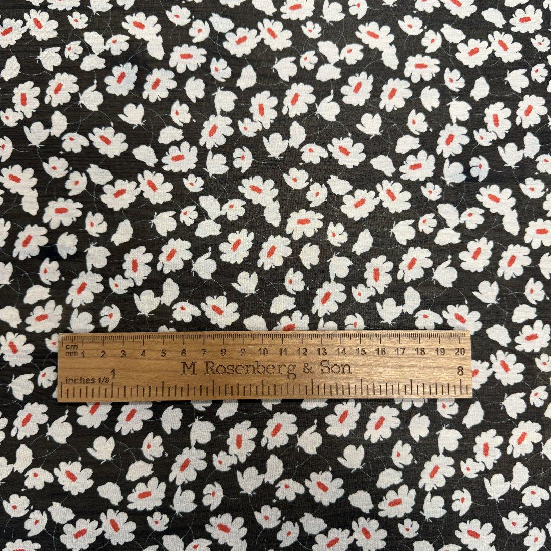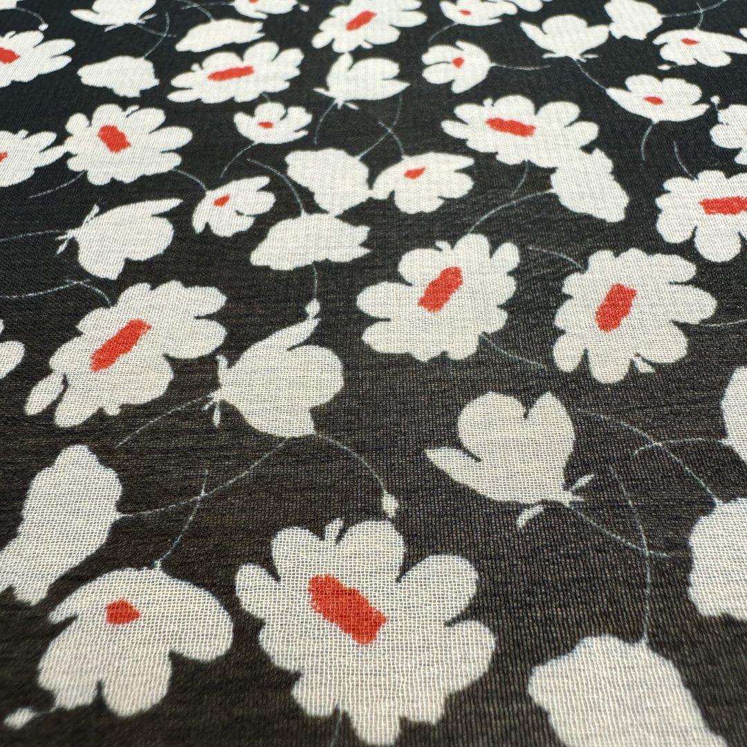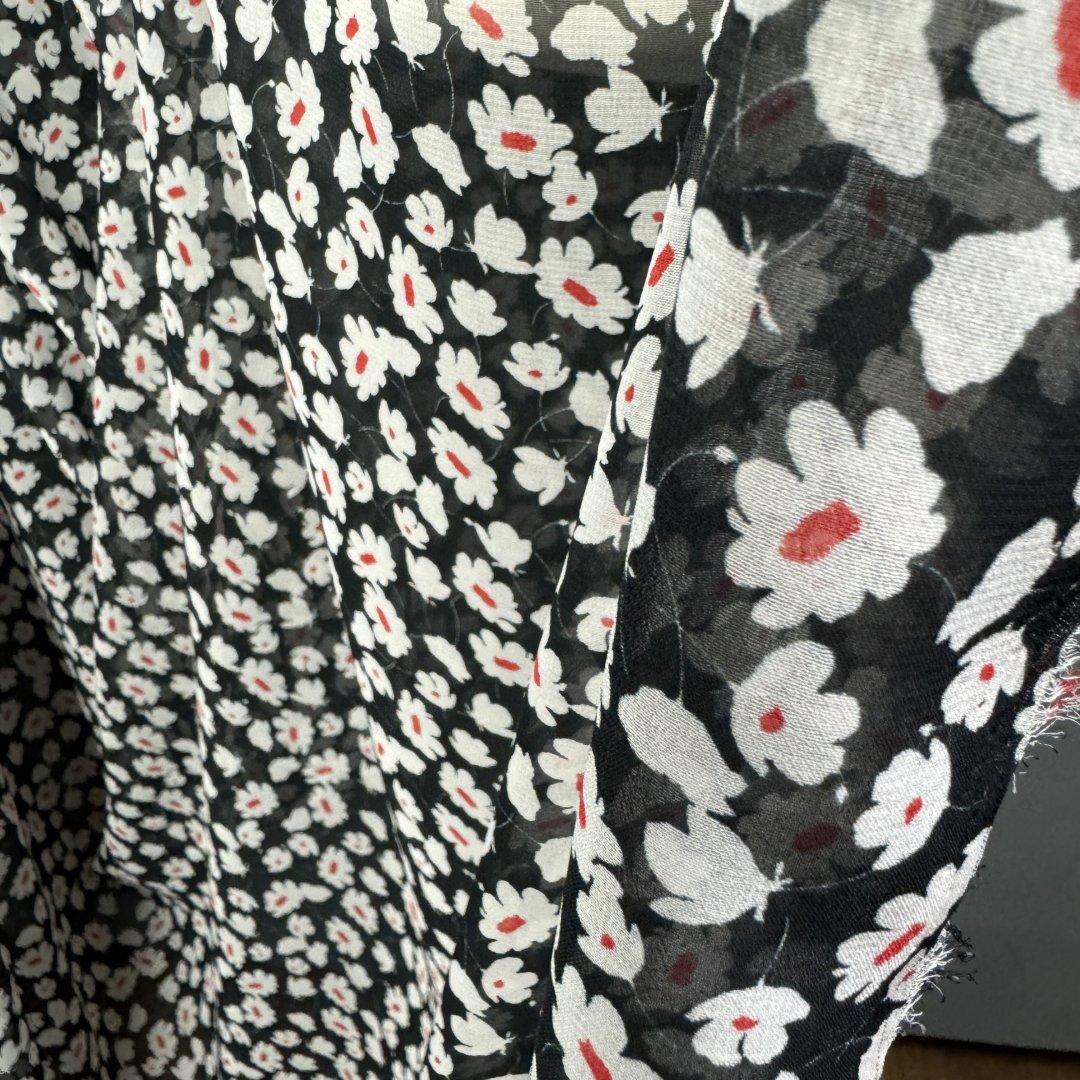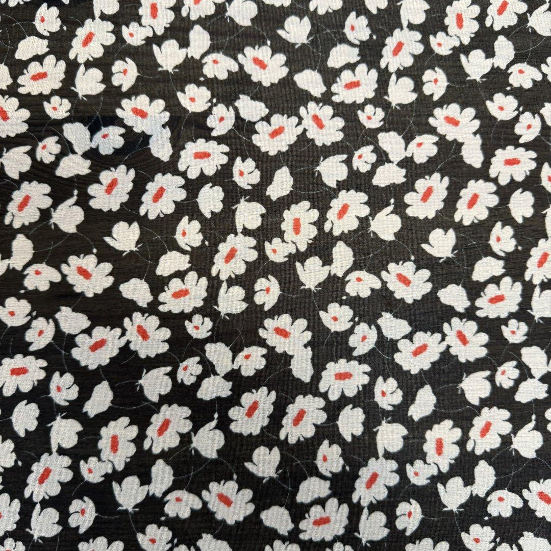 Daisy Red is 150cm wide. This is a light weight, transparent polyester with a pretty floral print. Polyester Chiffon is ideal for maxi dresses, swishy skirts, shirts, shirt dresses, kaftans, beach wraps and so much more.