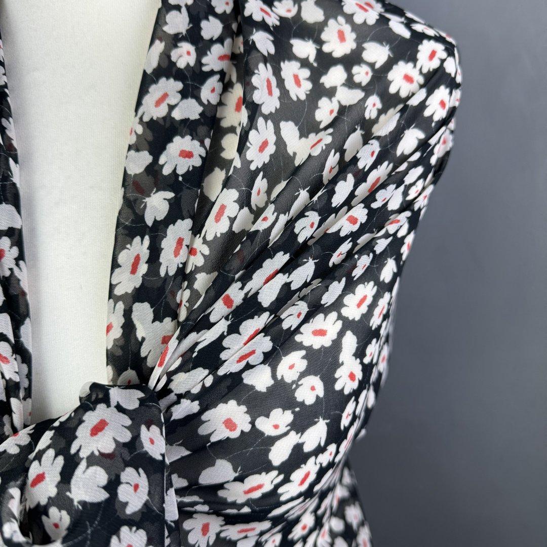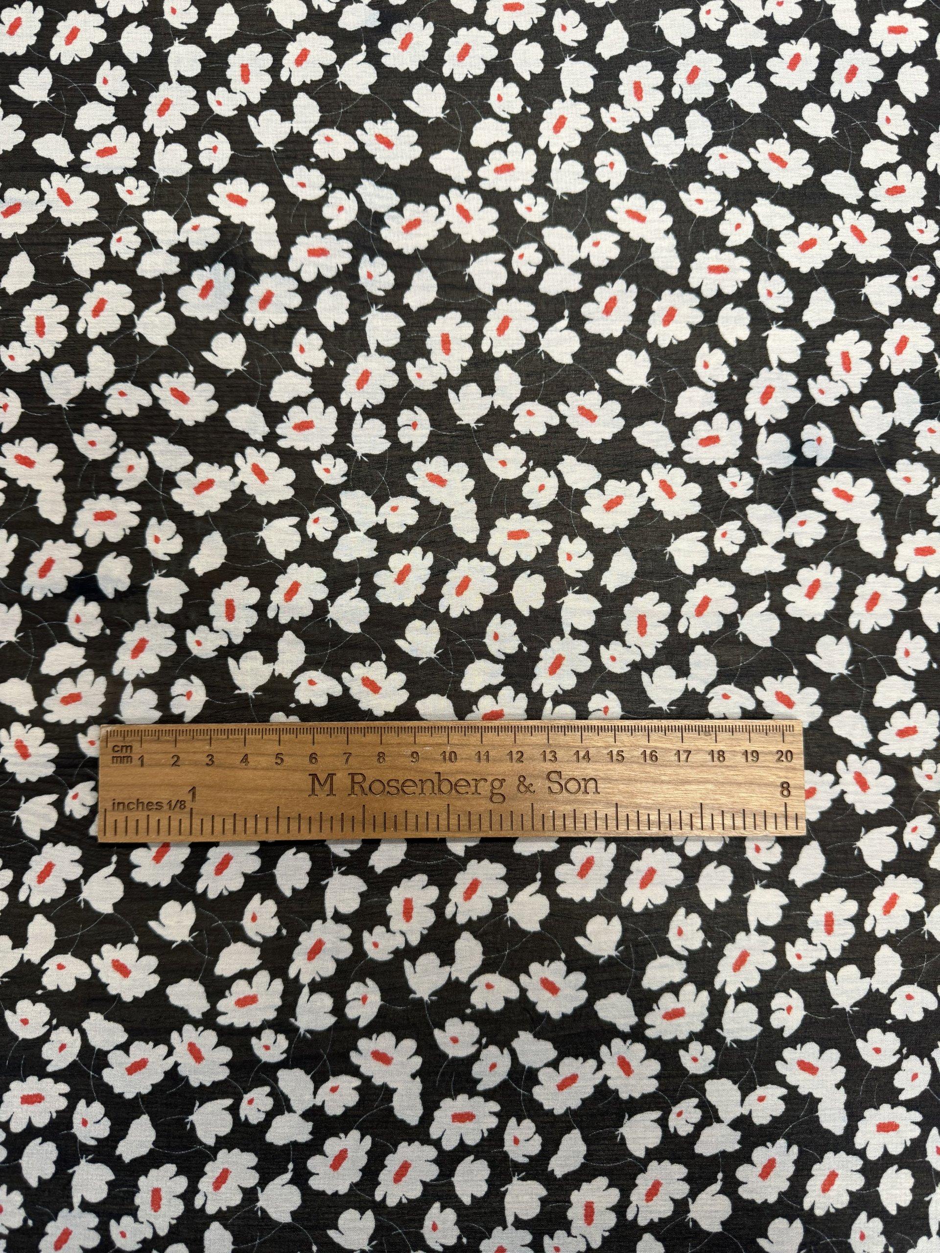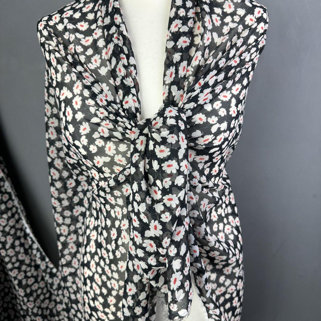 Daisy Red is 150cm wide. This is a light weight, transparent polyester with a pretty floral print. Polyester Chiffon is ideal for maxi dresses, swishy skirts, shirts, shirt dresses, kaftans, beach wraps and so much more.
