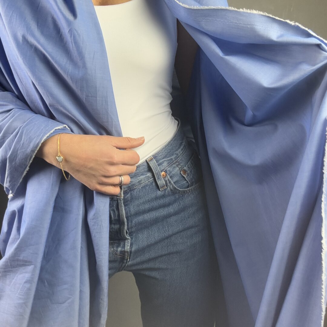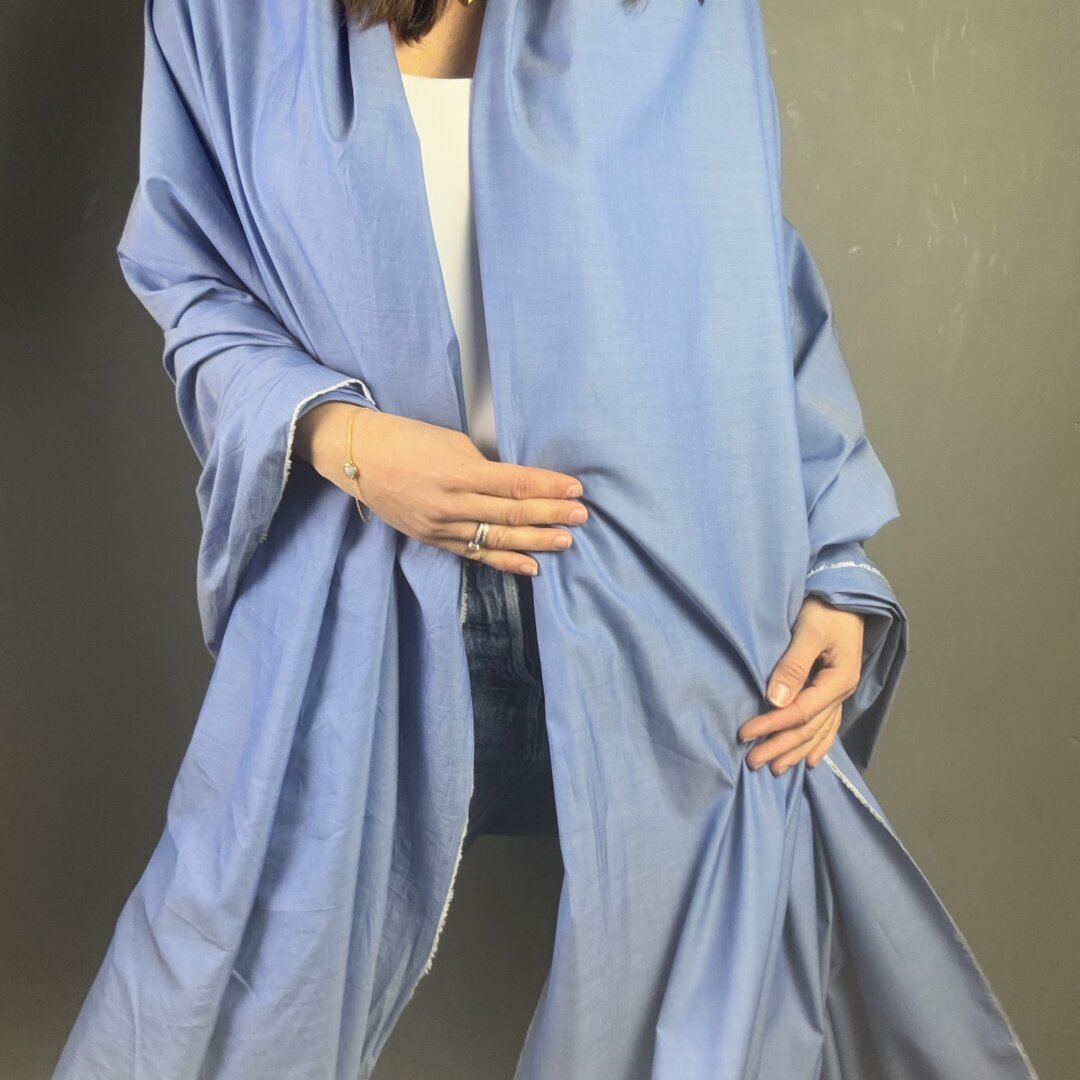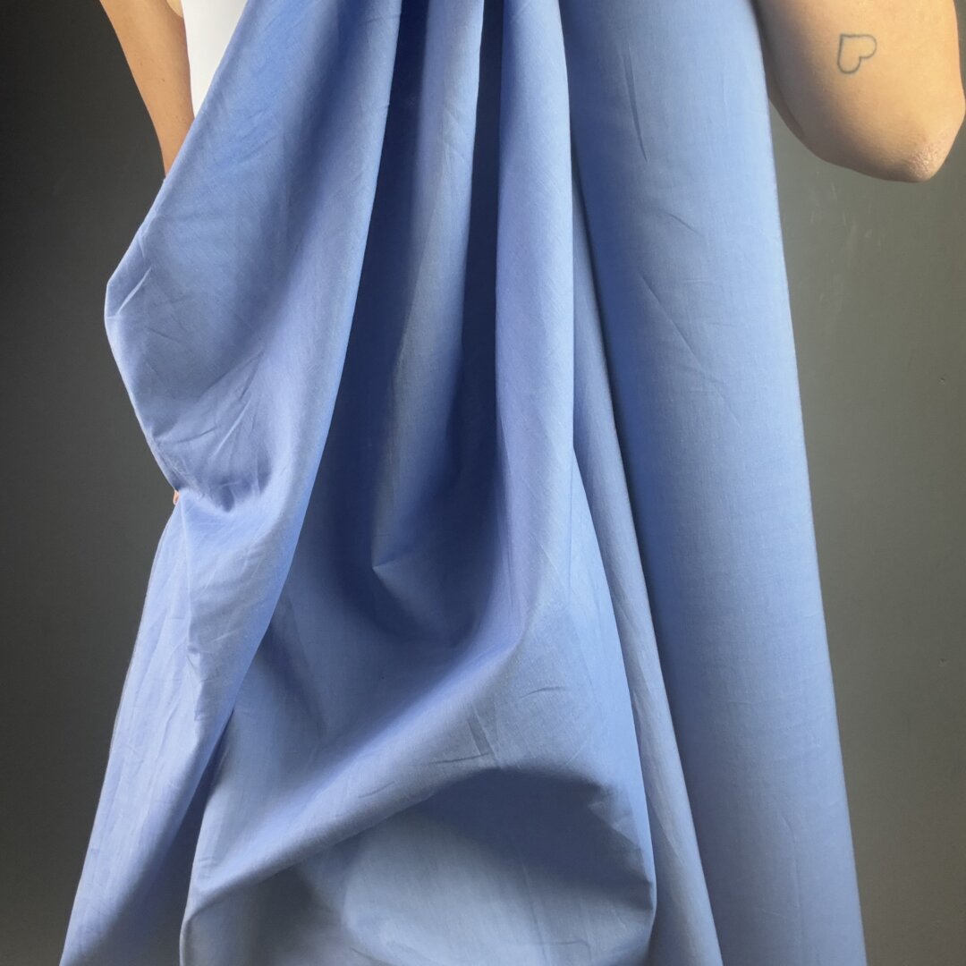 Denim Bella Blue is an Italian lightweight chambray cotton of exceptional quality. Soft, breathable, and beautifully fluid, this fabric is perfect for summer shirts, tops, kaftans, A-line skirts, loose-fitting dresses, wide-leg or relaxed trousers, and shirred garments. Designed to keep you cool in warm weather, it offers an effortlessly stylish and glamorous feel. The unique drape and colour create a high-fashion–inspired finish, making it ideal for elevated everyday pieces. Very easy to sew.