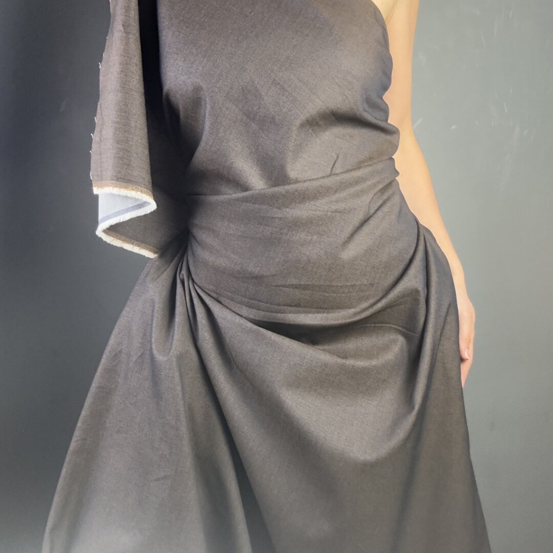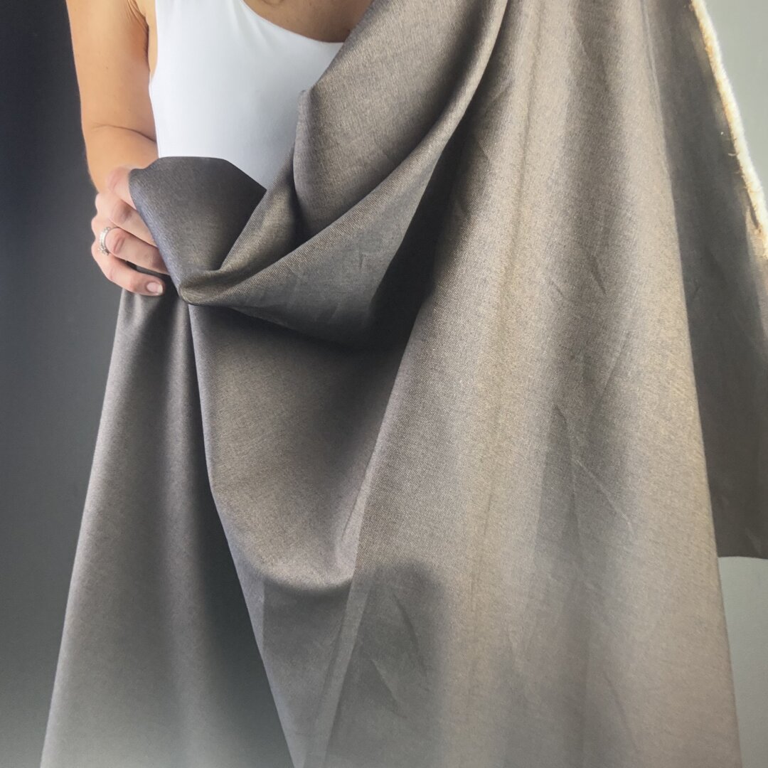 Denim Bobby Brown is an Italian cotton denim with a refined, suiting-like weight—heavier than chambray yet fluid in movement. Elegant and structured, it is ideal for classic shirts, pleated wide-leg trousers, A-line skirts and dresses, relaxed jackets, and more. The rich brown tone moves beautifully with the body, creating clean lines and effortless sophistication. A high-fashion Italian cloth designed to make a simple, confident statement.