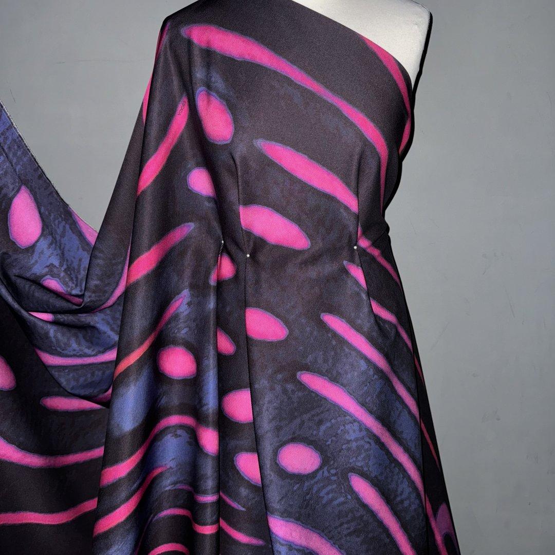 Designer Statement Firework is 145cm wide. This gorgeous fabric is from a very well known international fashion house and creates stunning dresses, skirts, jackets and so much more.