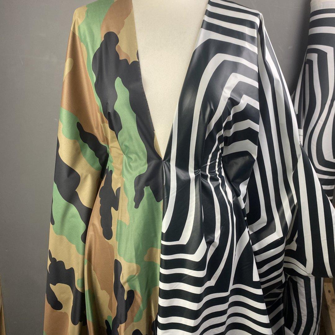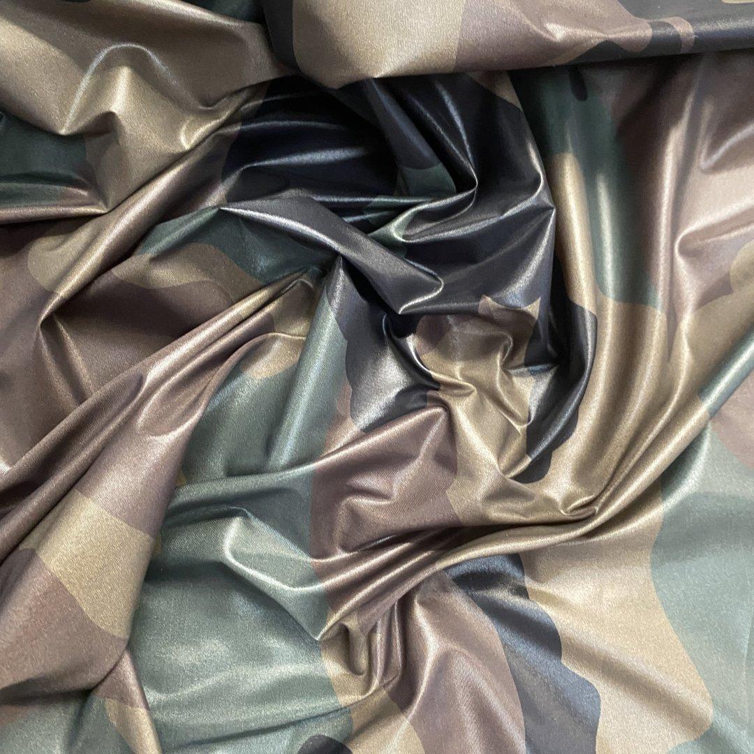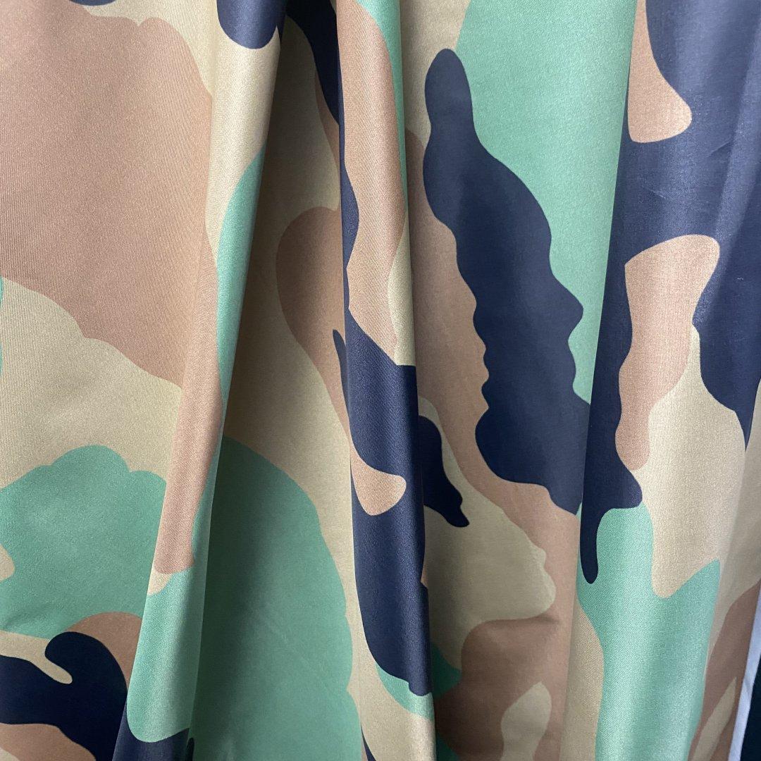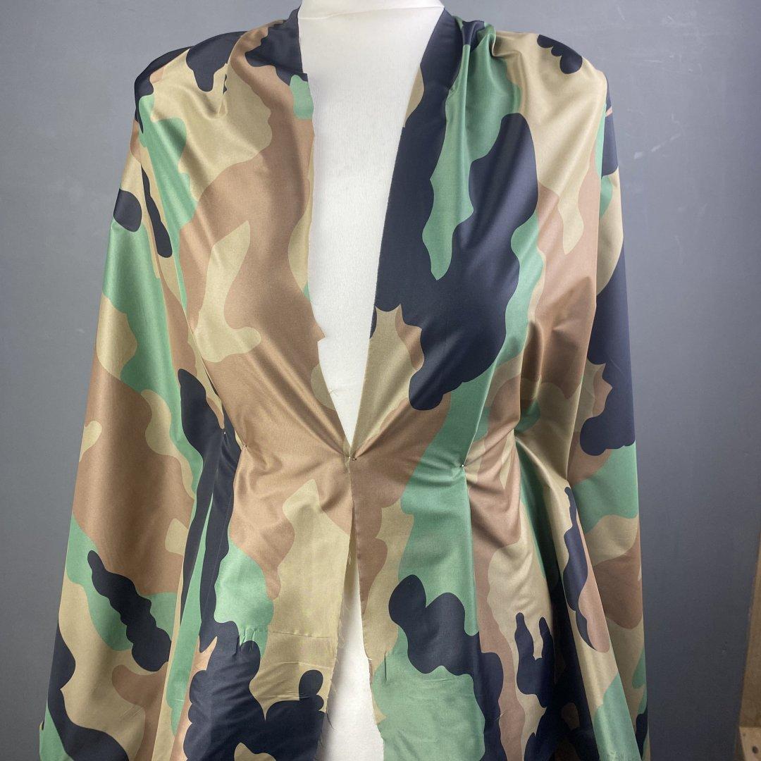 Waterproof Camo is 150cm wide. This is a light weight waterproof cloth from a very well known fashion house that is perfect for light weight jackets, ponchos, macs, baggy trousers, high fashion skirts and dresses and more. This fabric will cling so is recommended for jackets. This is such an interesting cloth and is dry once the water has trickled off. A clever and attractive cloth.
