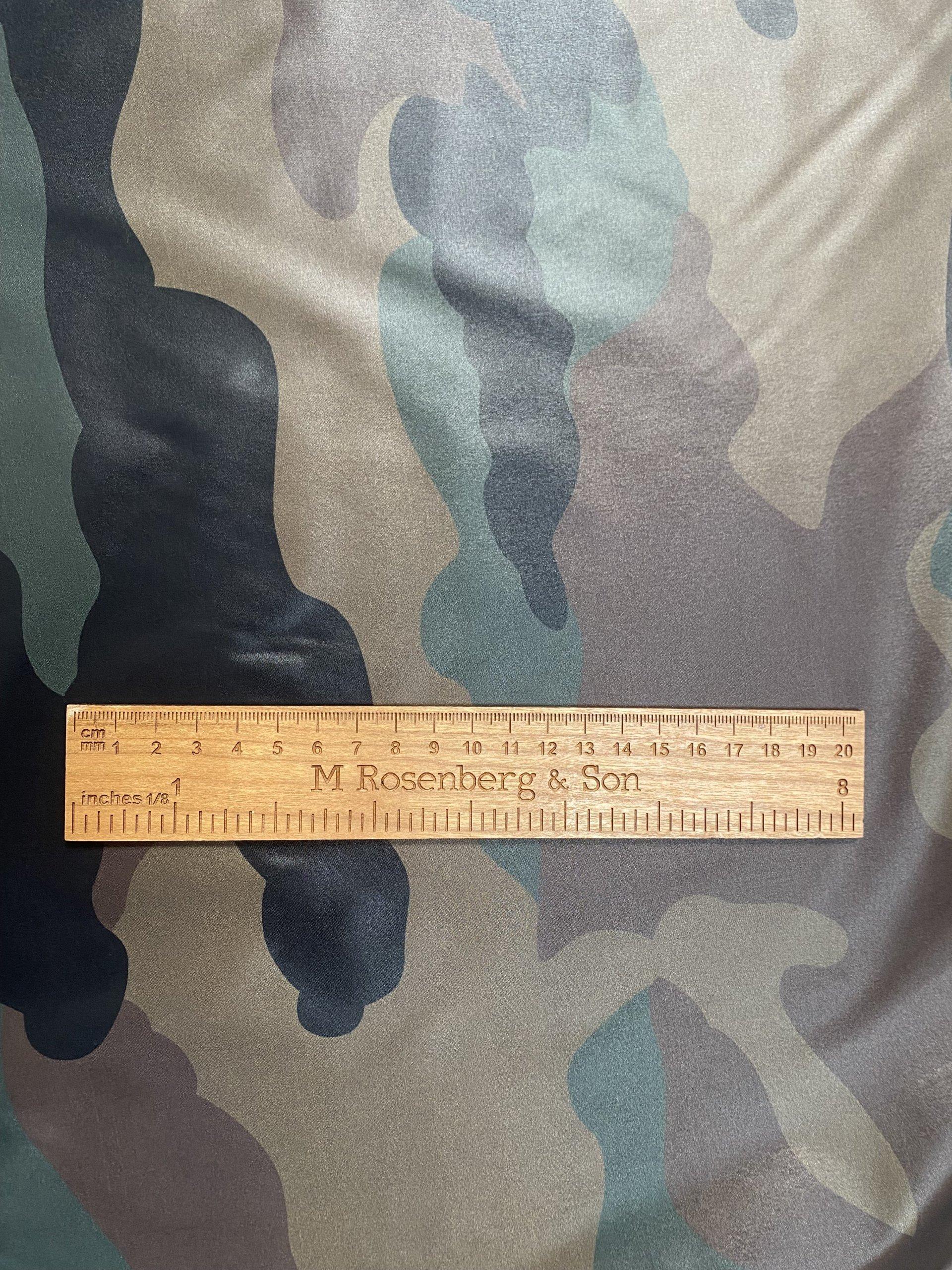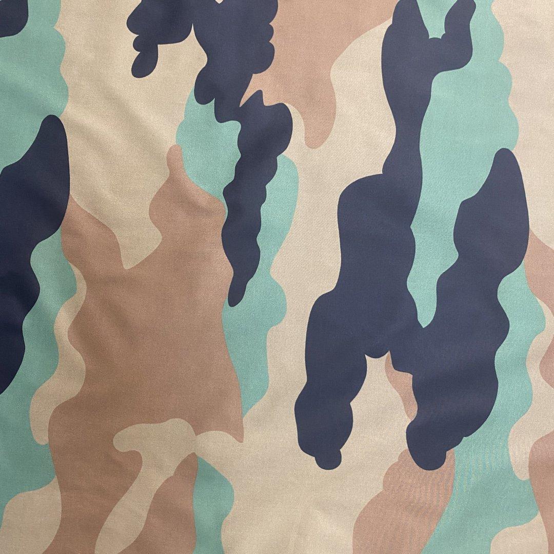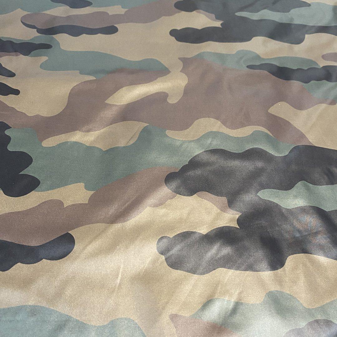Waterproof Camo is 150cm wide. This is a light weight waterproof cloth from a very well known fashion house that is perfect for light weight jackets, ponchos, macs, baggy trousers, high fashion skirts and dresses and more. This fabric will cling so is recommended for jackets. This is such an interesting cloth and is dry once the water has trickled off. A clever and attractive cloth.