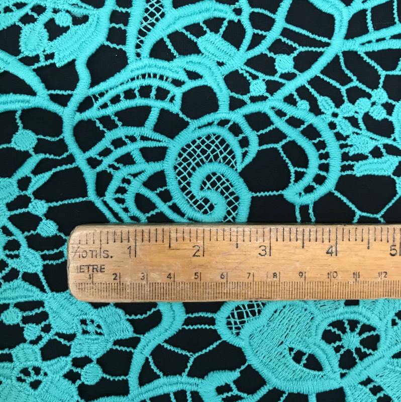 Emerald Green Lace is 45″ wide. This is a light- meduim weight lace that has a busy floral design all over it. A beautiful unique scolloped edge creates a soft, feminine look with a bold contrast with a striking colour. An elegant fabric suitable for evening wear & occasional wear in skirts, dresses, tops, trousers, unlined edge to edge jackets and more. Washes well at 30 degrees- minimum purchase 0.50cm.