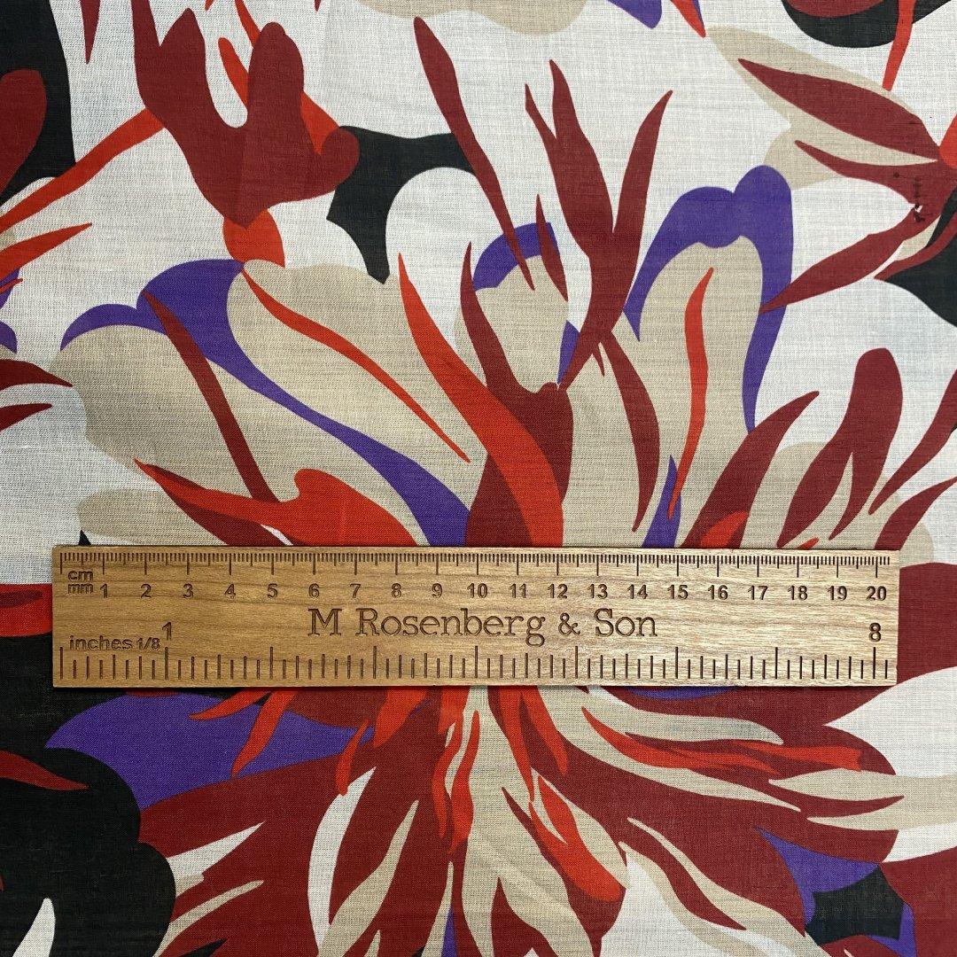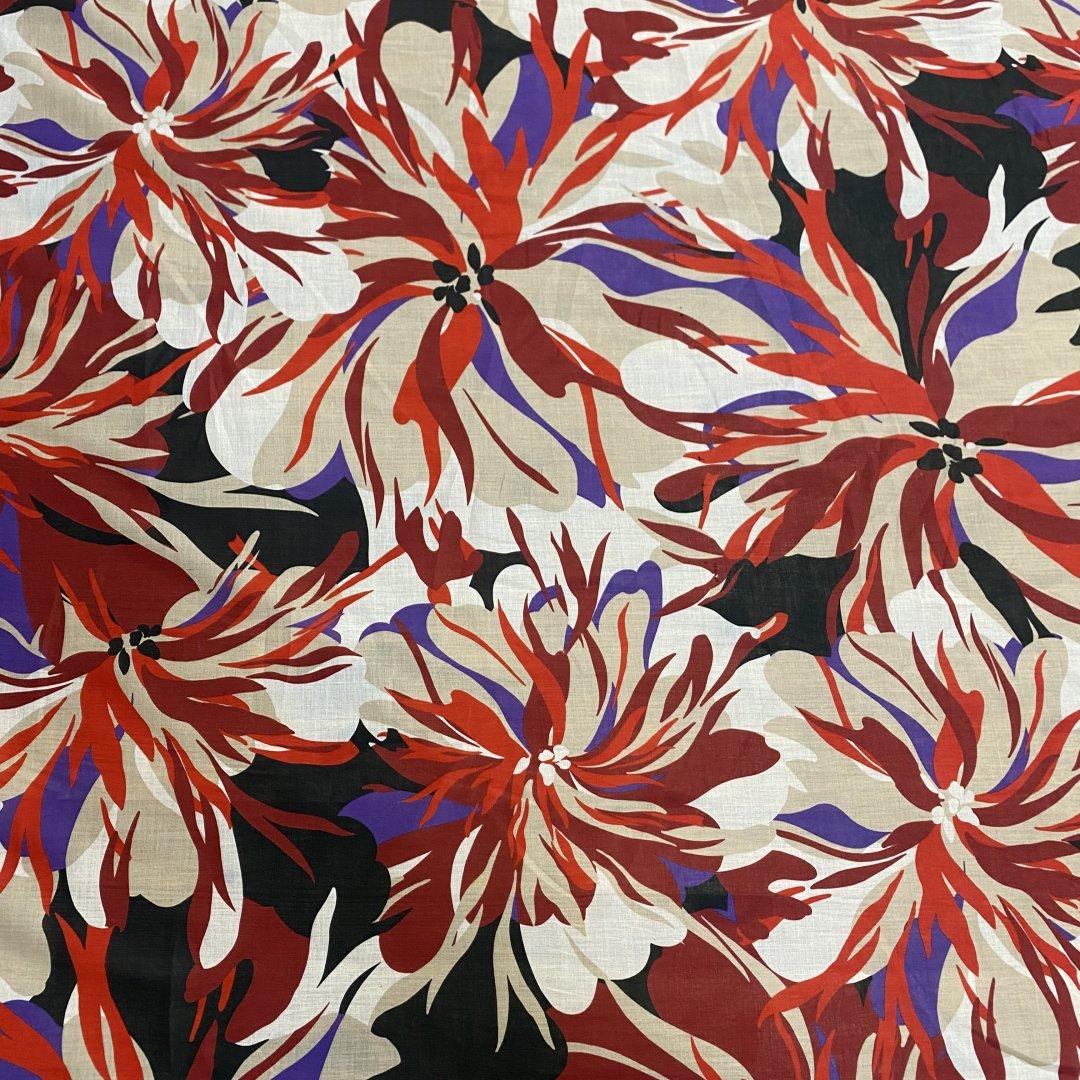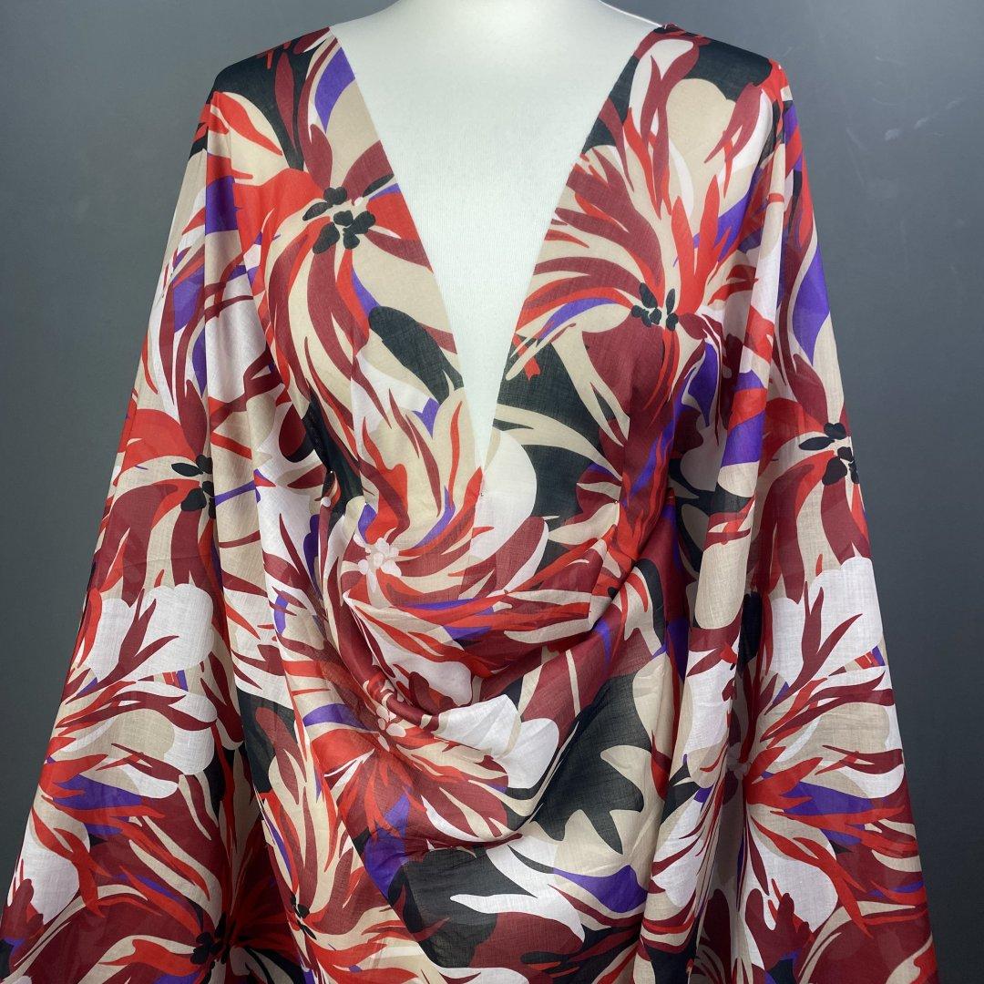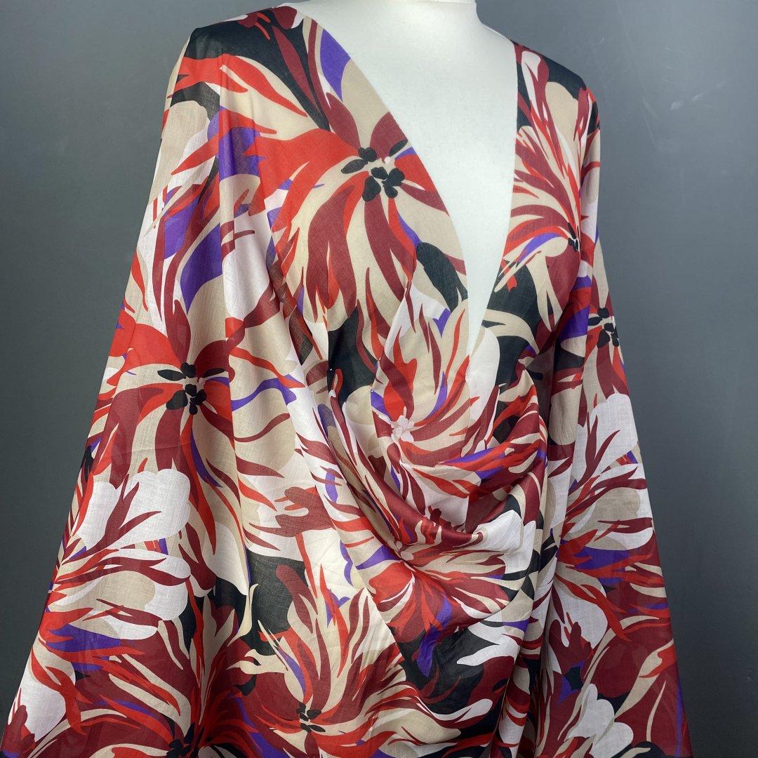 Firework Summer is 150cm wide. This is a light weight, Italian fine lawn cotton with a beautiful busy print. This fabric is perfect for shirts, tops, wrap dresses, shift dresses, kaftans, floaty tops and more. This fabric is very easy to sew and will create that must have summer garment for day and evening wear.