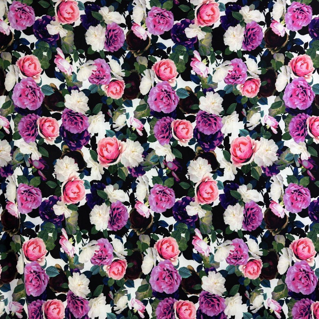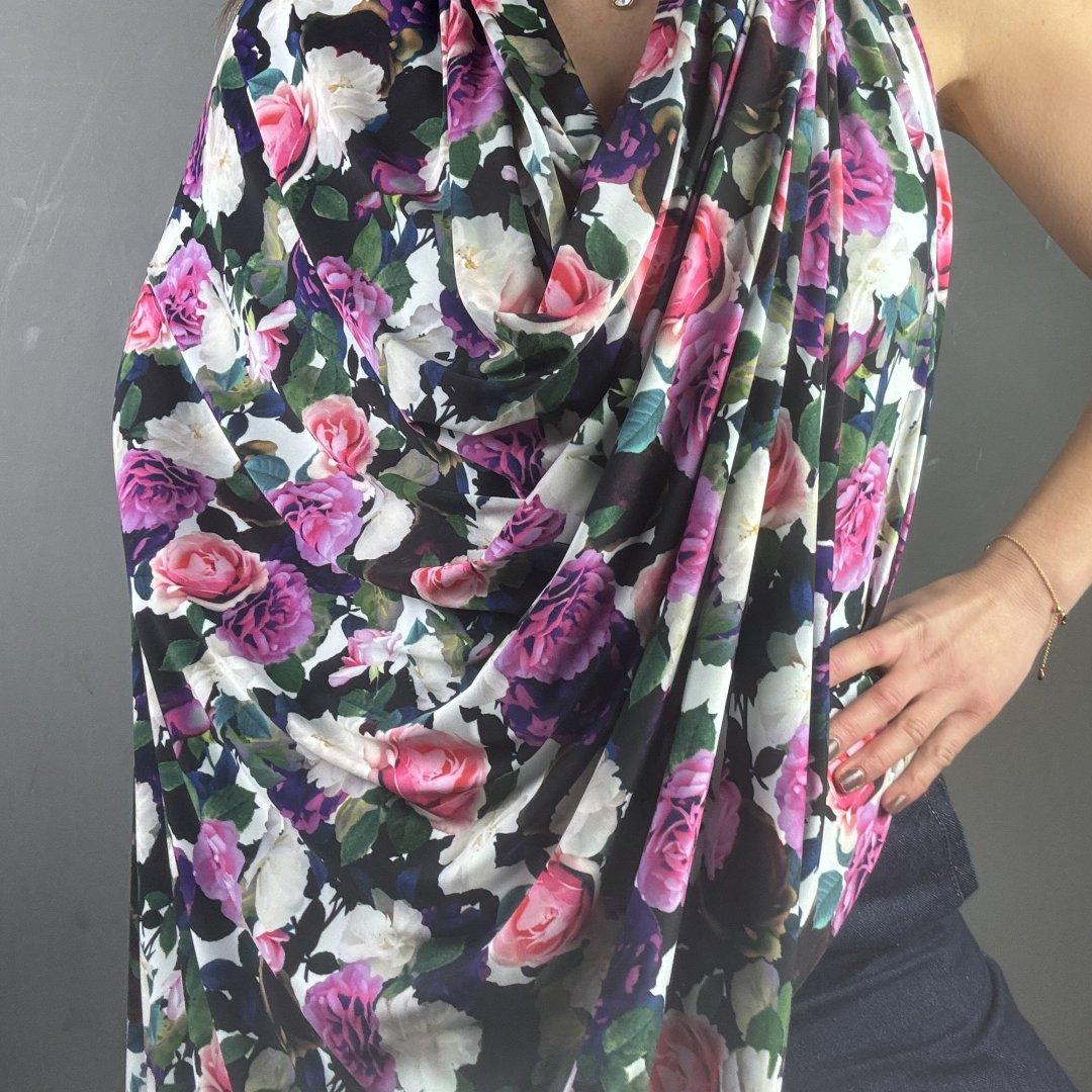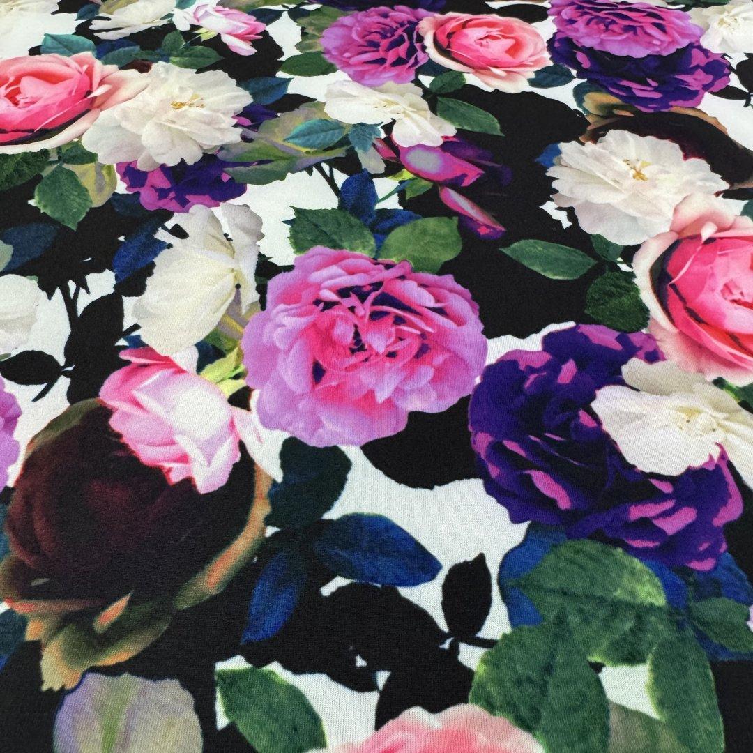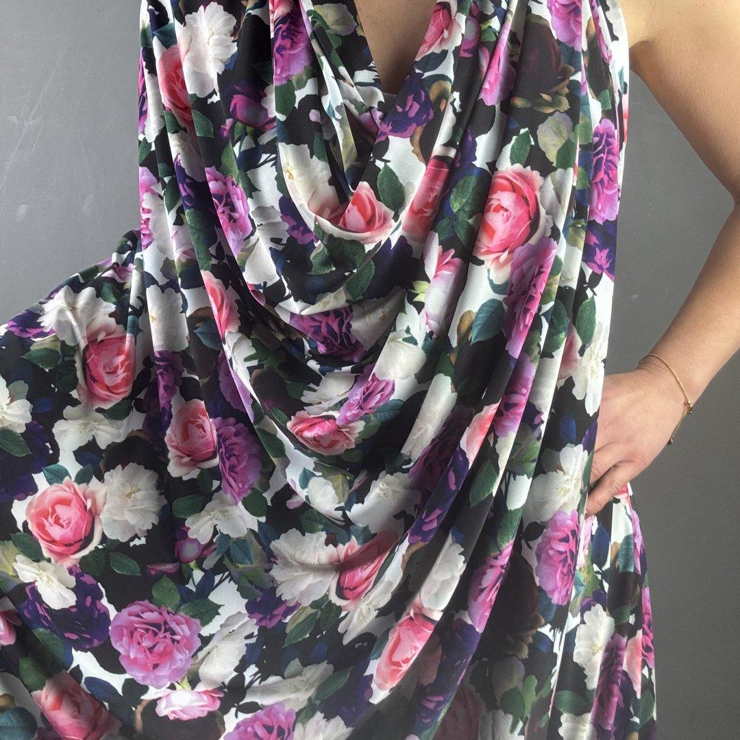 Floral Jersey is 140cm. This is a chic and stylish stretch jersey ideal for dresses, kaftans, skirts, tops, cardigans, wide leg trousers, fancy lounge wear and so much more.