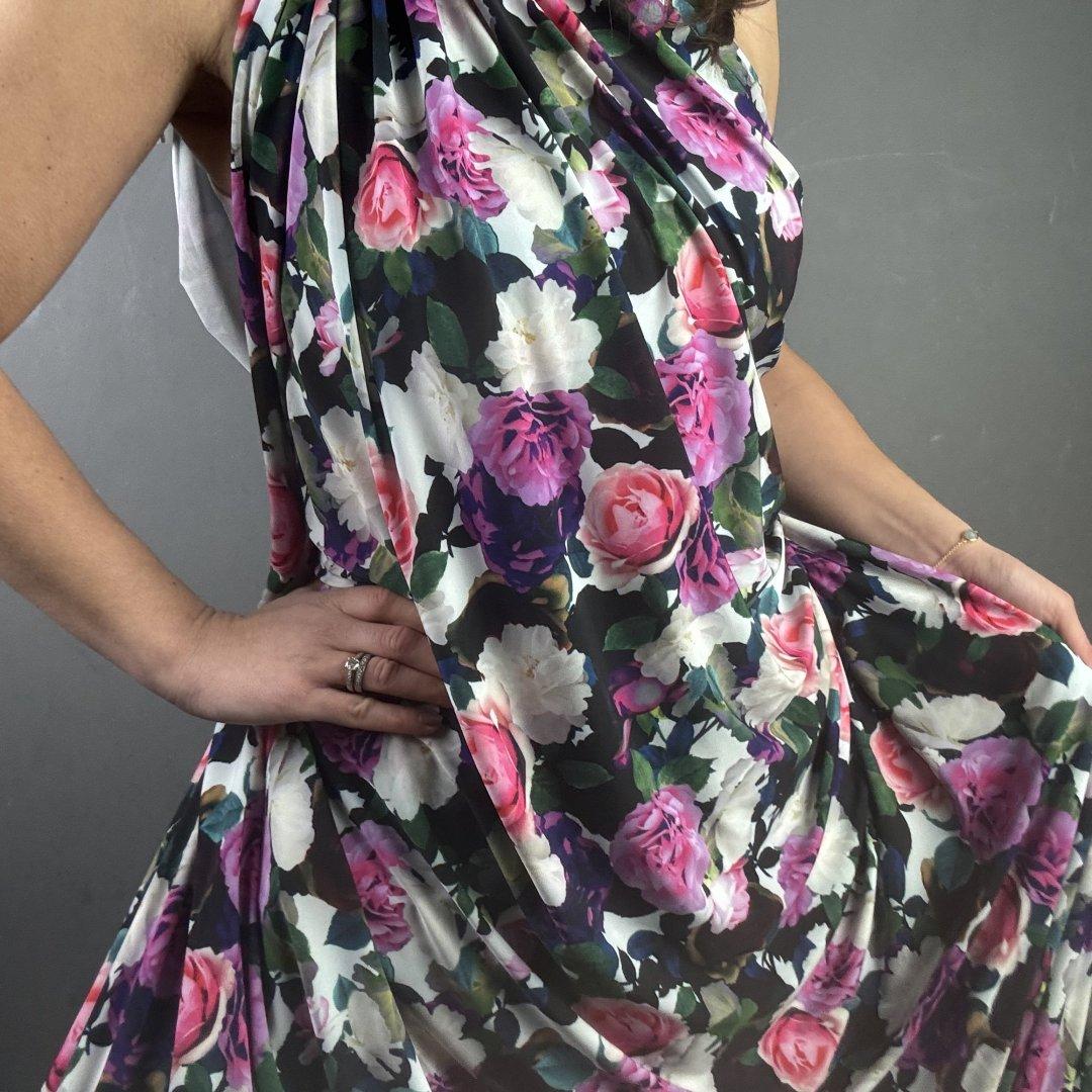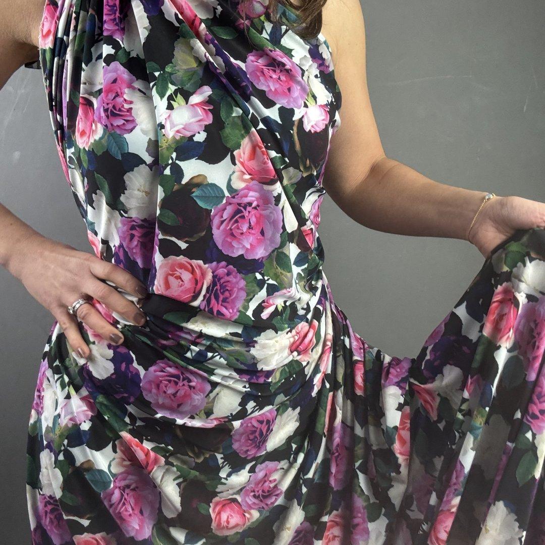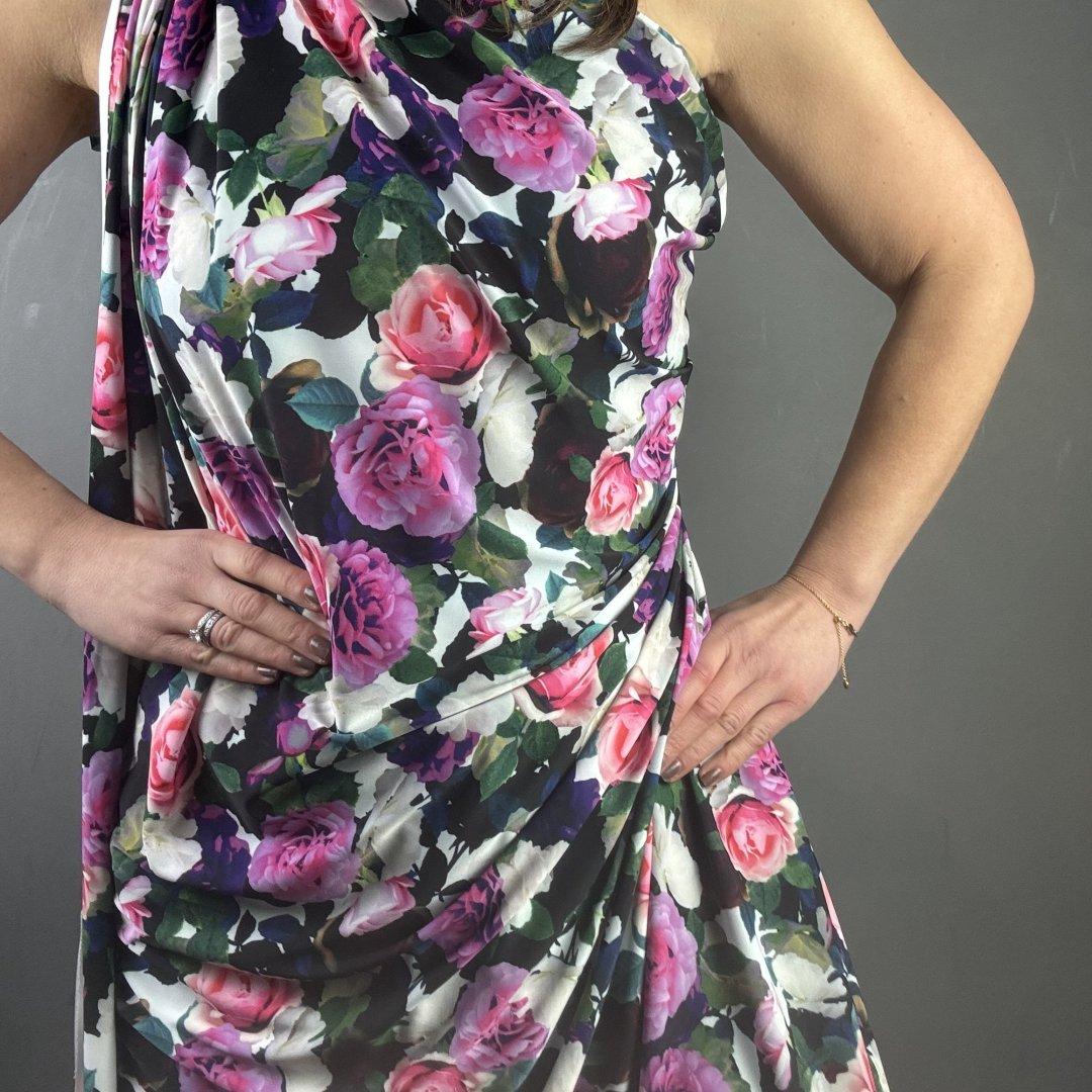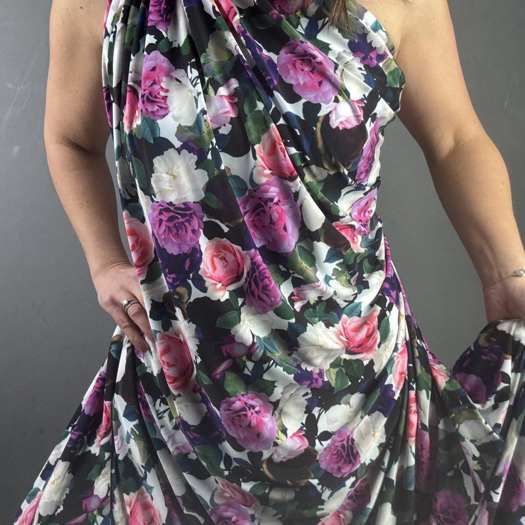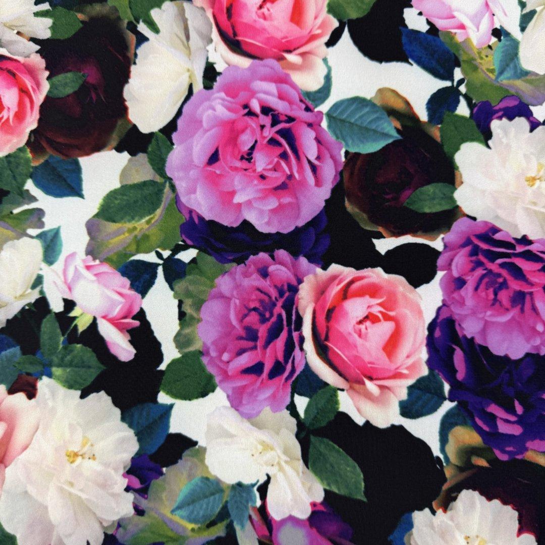 Floral Jersey is 140cm. This is a chic and stylish stretch jersey ideal for dresses, kaftans, skirts, tops, cardigans, wide leg trousers, fancy lounge wear and so much more.