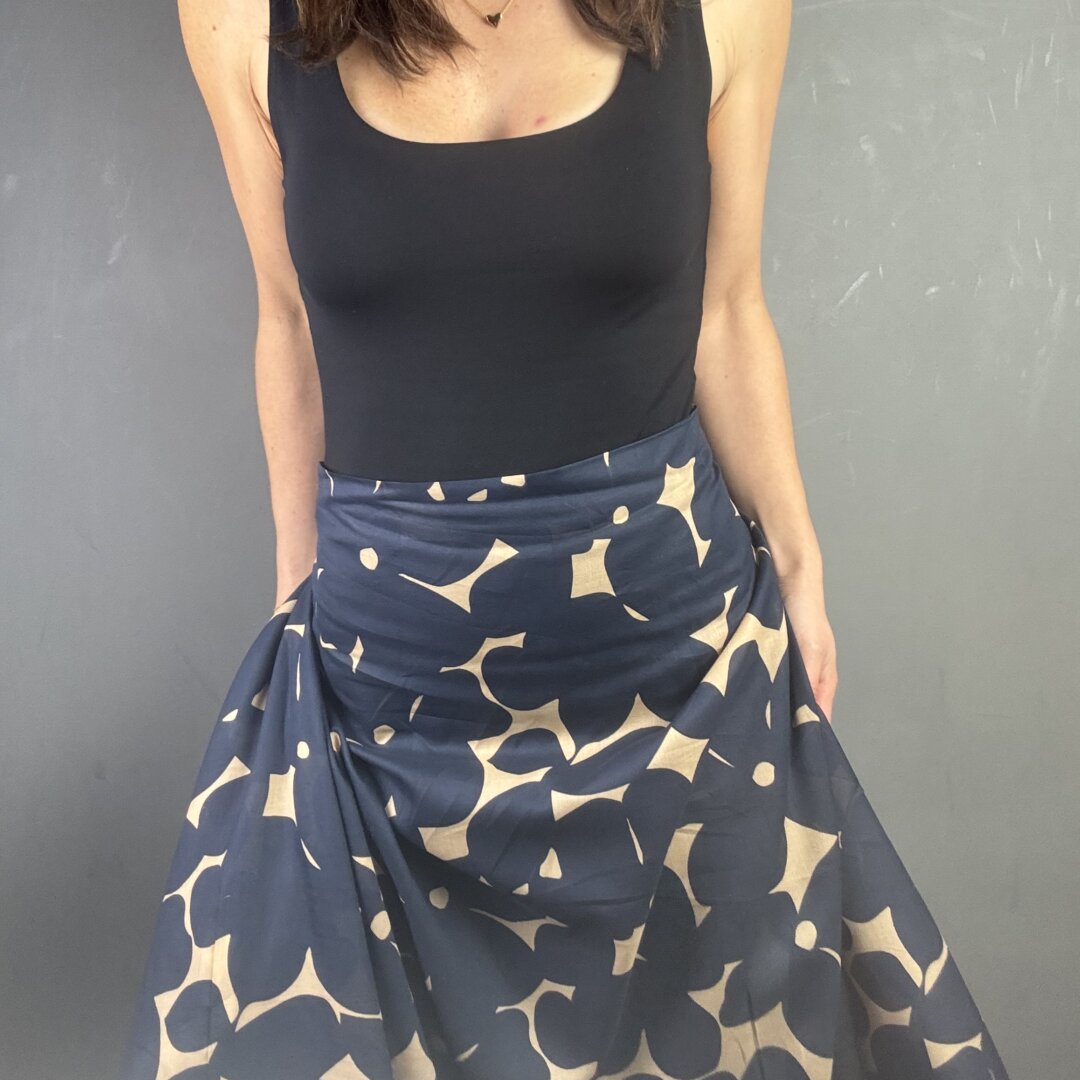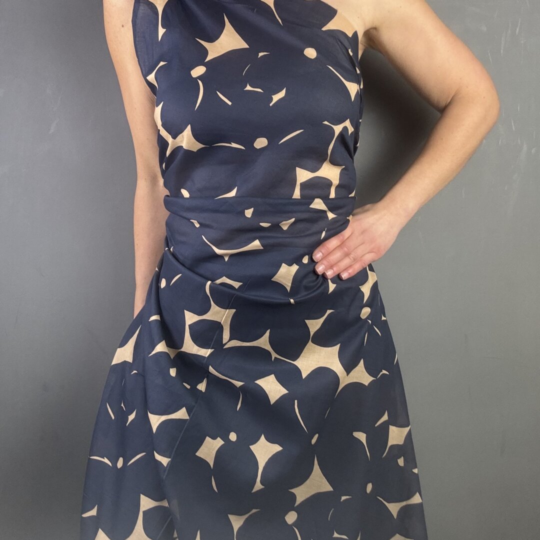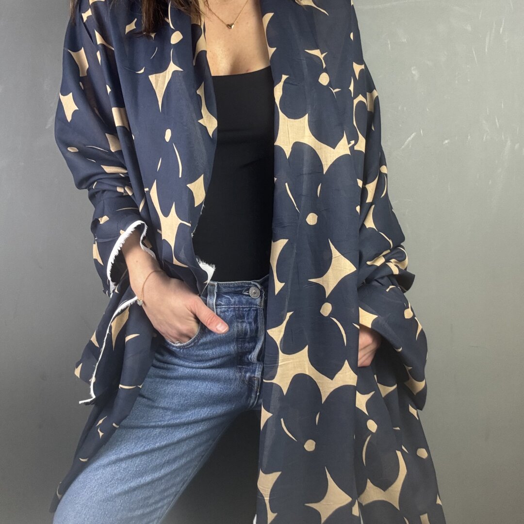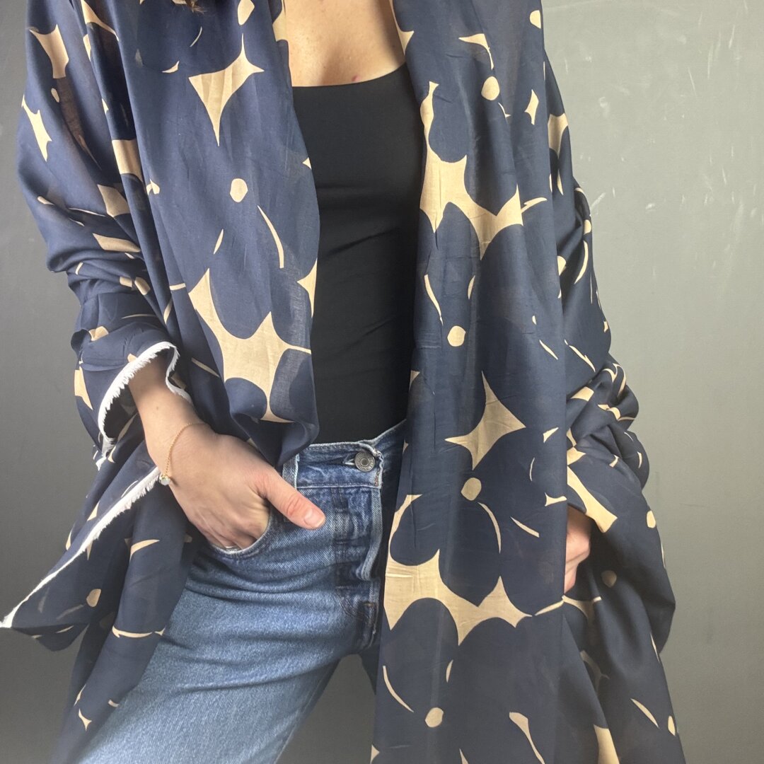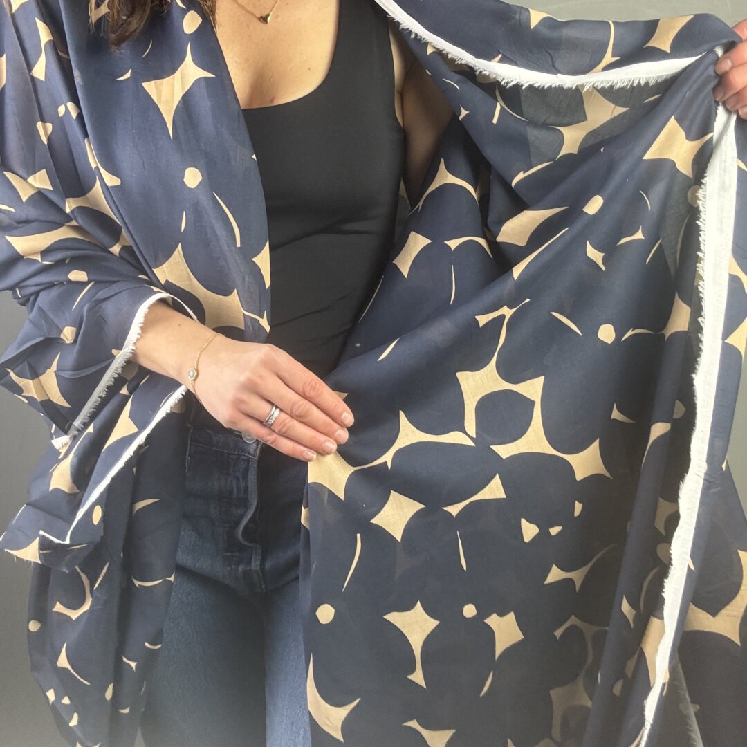 Italian cotton voil featuring a striking bold floral print, with elegant navy flowers set against a warm beige ground. This lightweight, breathable fabric is 140cm wide and drapes beautifully, making it as versatile as it is eye-catching. Perfect for creating tops, dresses, trousers, kaftans, and more, this truly stunning fabric brings effortless style to any garment.