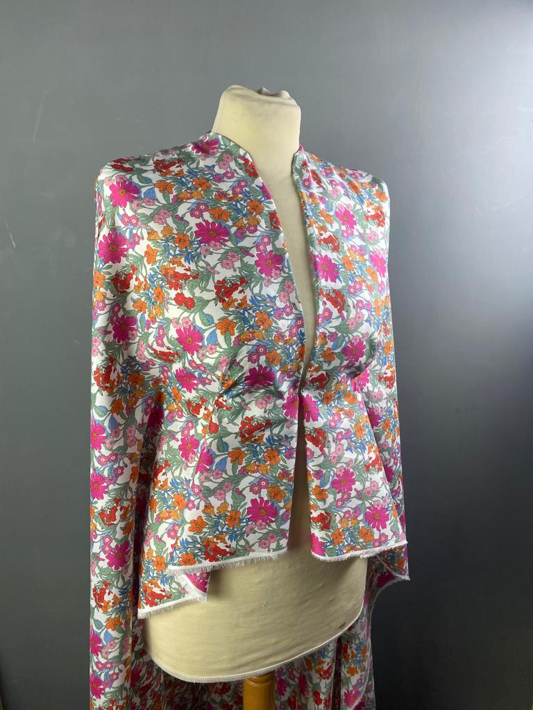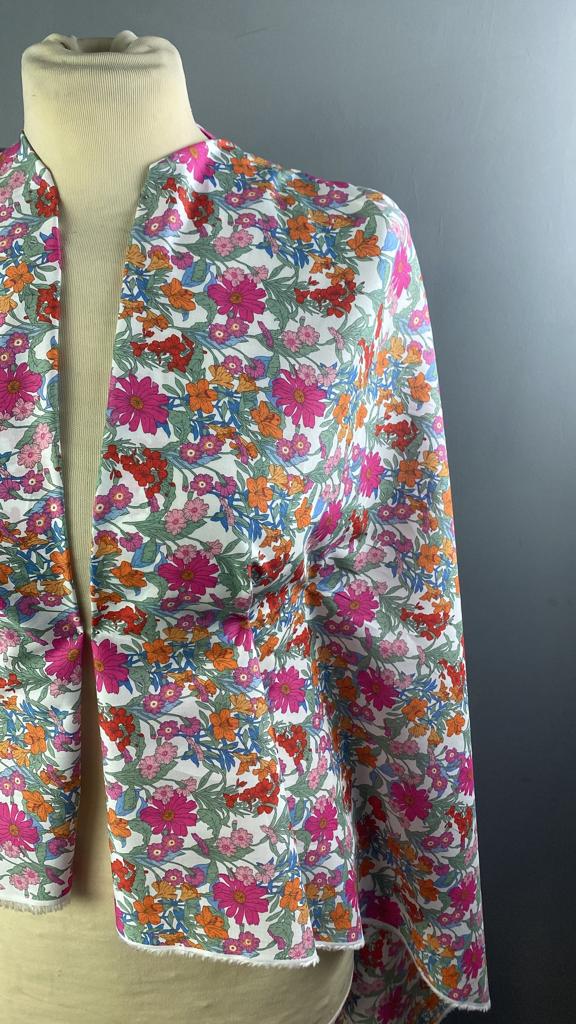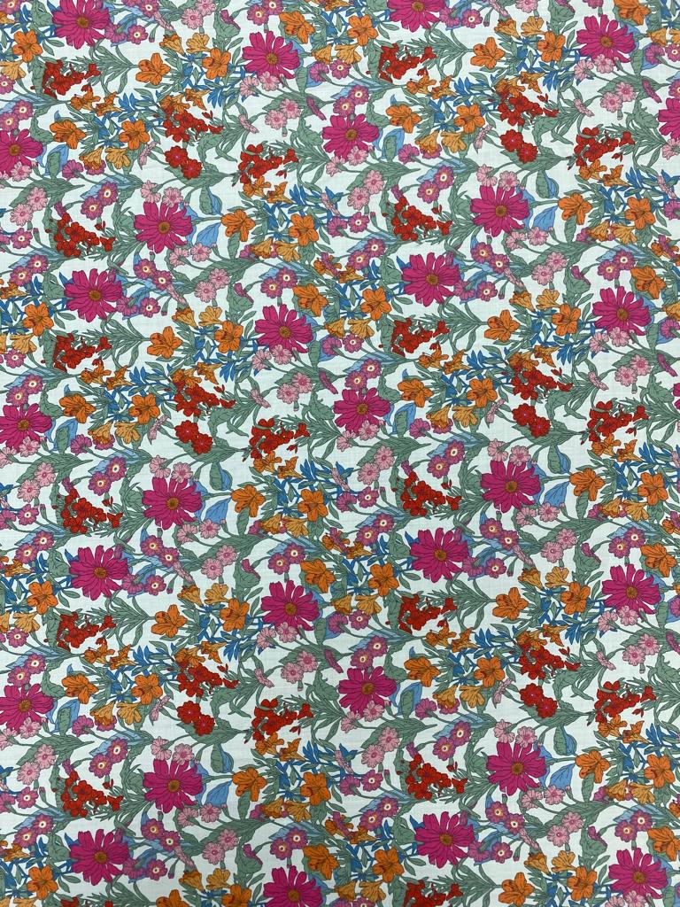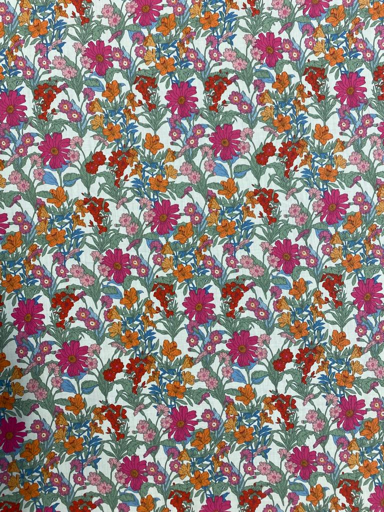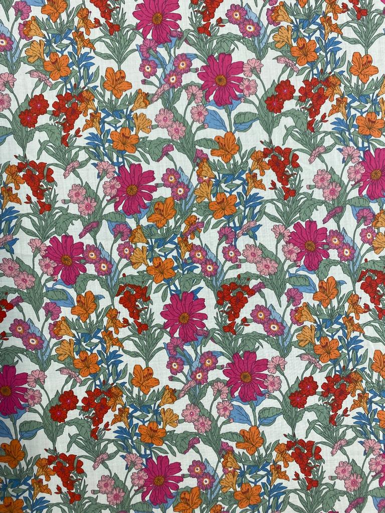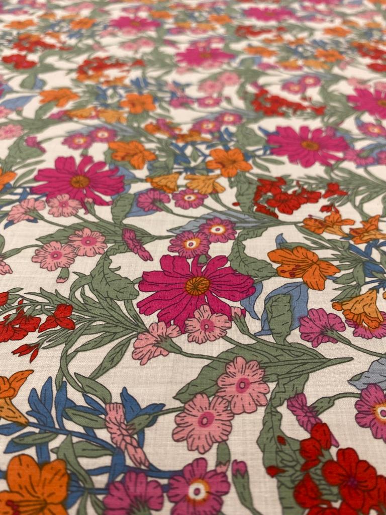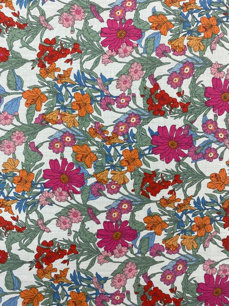 Flower Tea Party is a Fine Lawn, 56″ wide (150cm). Fine lawn is a light wight pure cotton that is easy to sew with and suitable for all sewing abilities. At first touch fine lawn is often compared to a floaty silk. This fabric is a natural fibre which means it will softy drape around the body keeping you nice and cool in hot climates. Fine Lawn is perfect for skirts, dresses, blouses, summer wight trousers, shorts, scarves, lining and more. Wash at 30 degrees- minimum cut 0.50cm.
