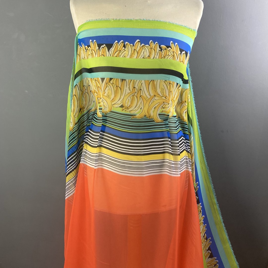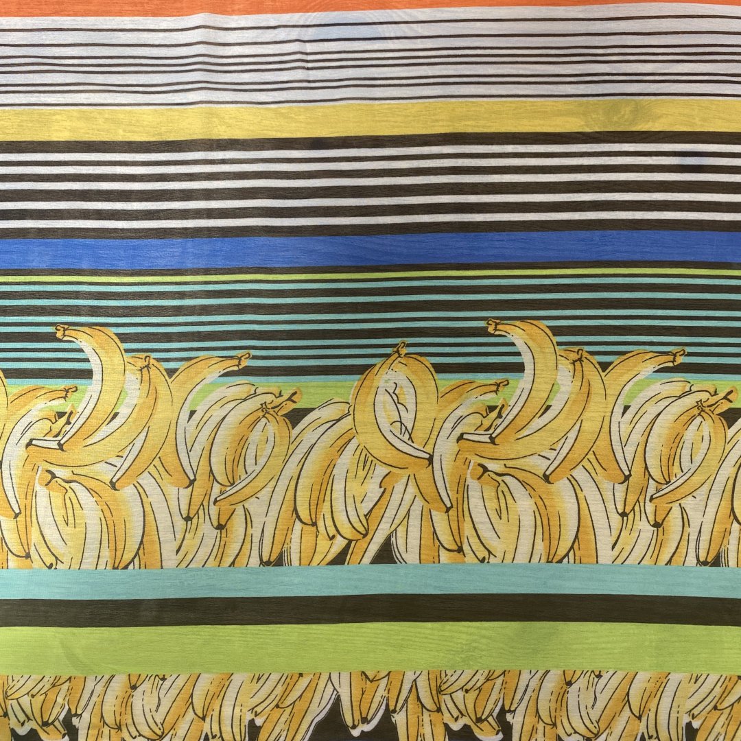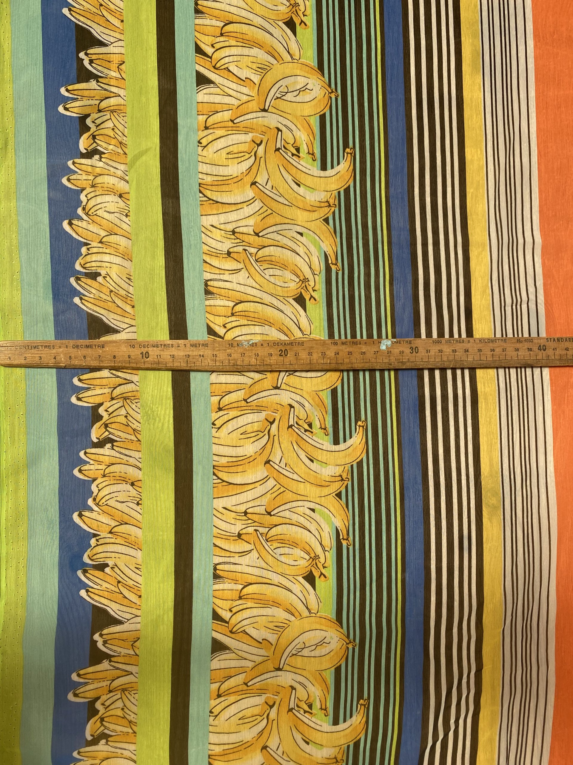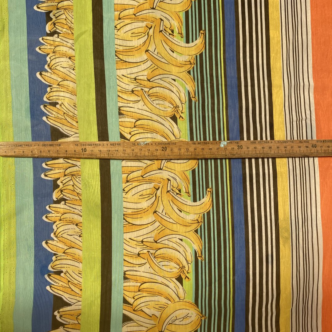 Go Bananas is a double border polyester chiffon, 150cm wide. This is a fun and vibrant cloth with stripes and bananas suitable for kaftans, cover ups, wraps, skirts, dresses, wraps and more. Go Bananas is a transparent cloth perfect for the summer.