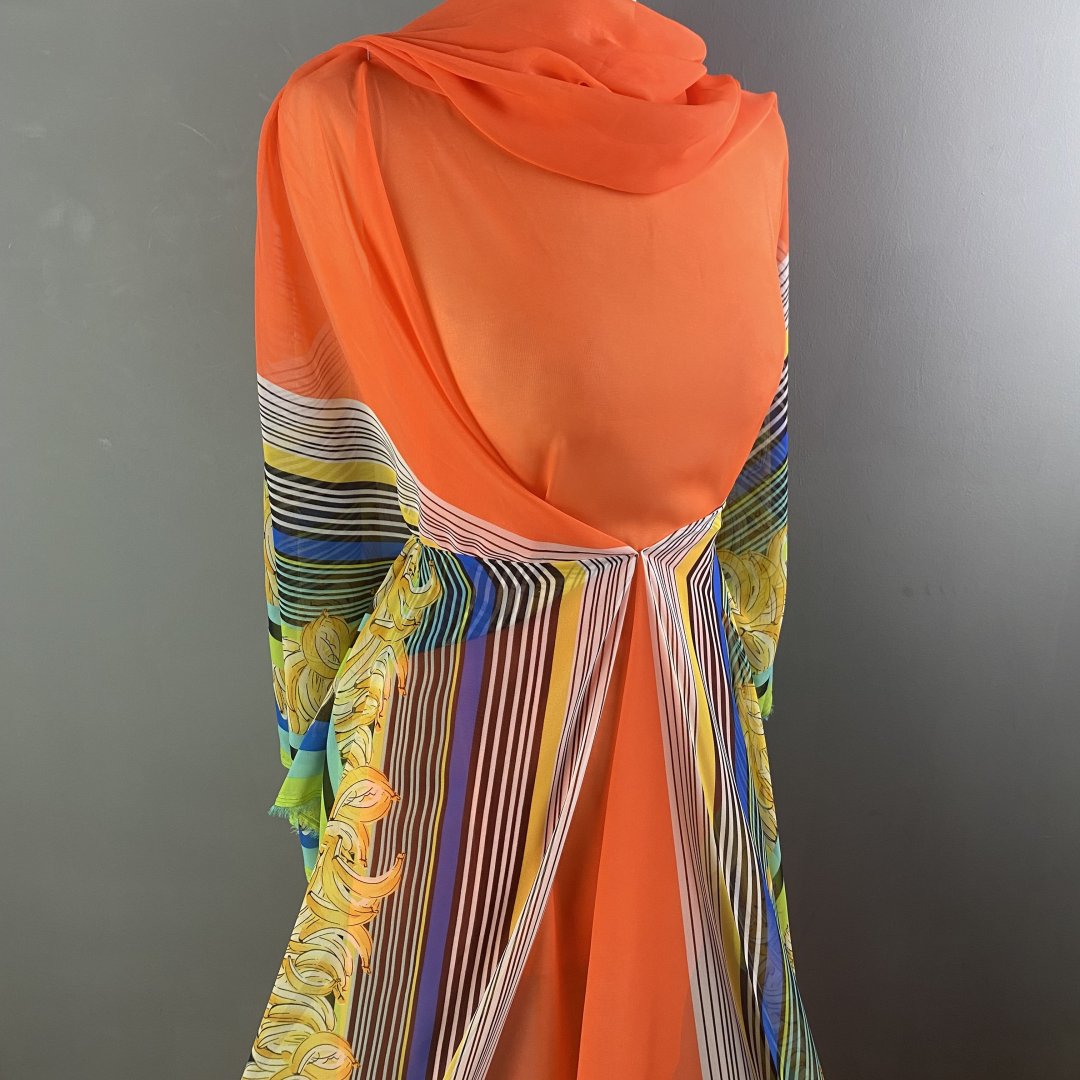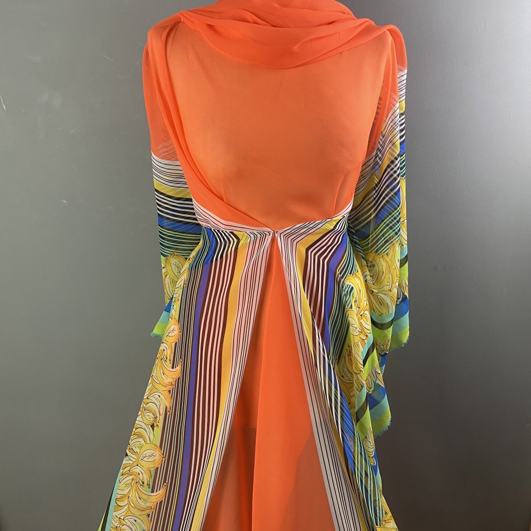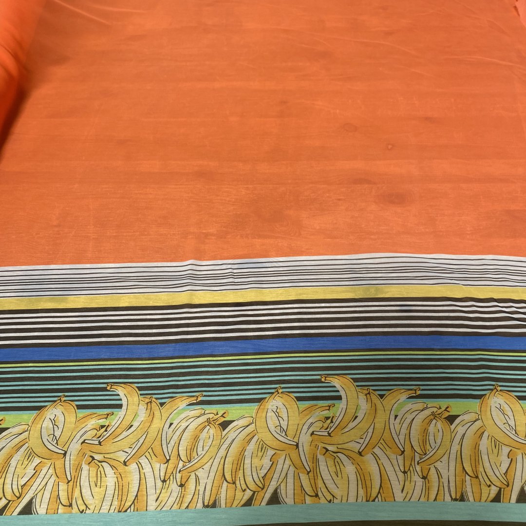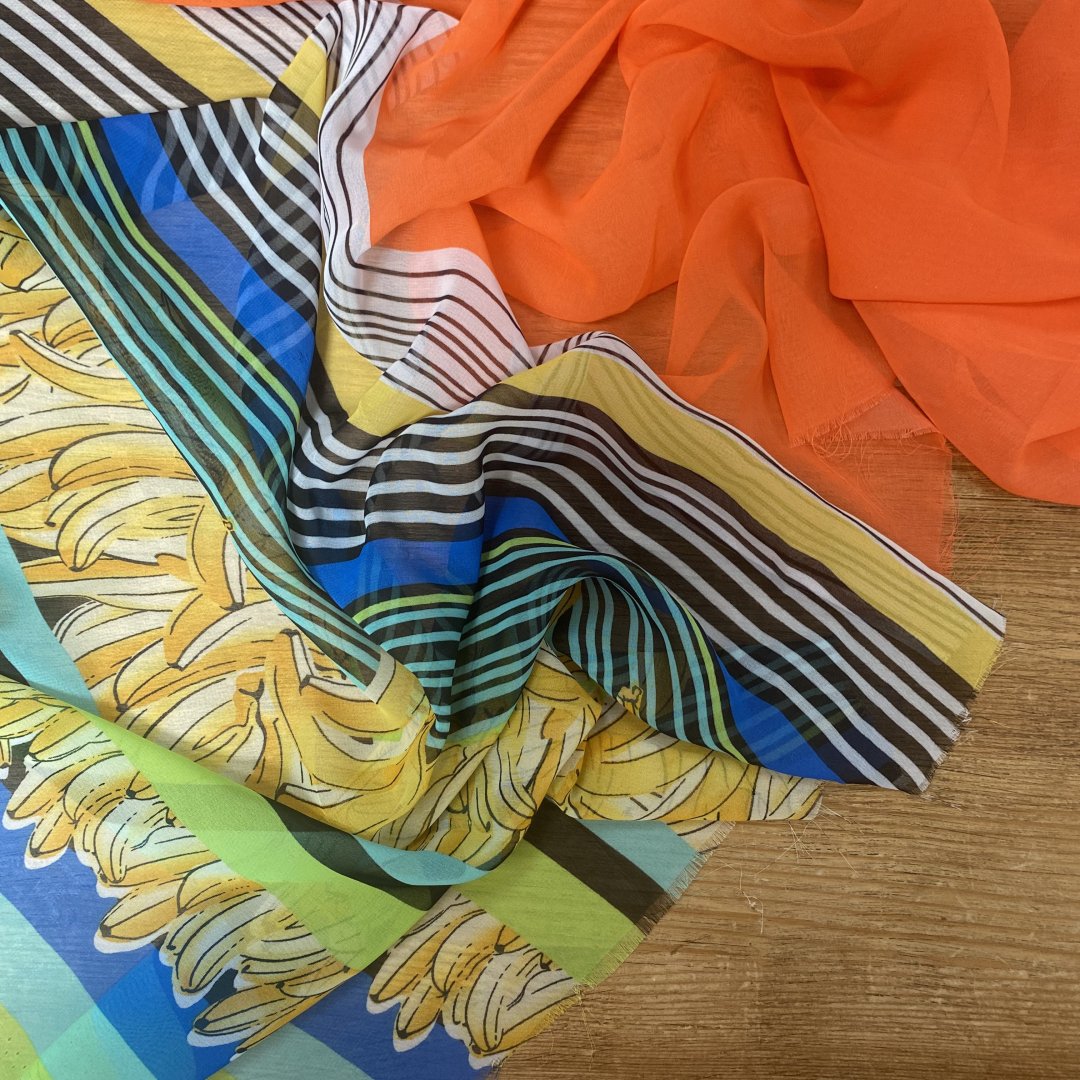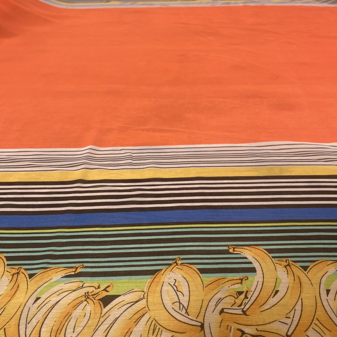 Go Bananas is a double border polyester chiffon, 150cm wide. This is a fun and vibrant cloth with stripes and bananas suitable for kaftans, cover ups, wraps, skirts, dresses, wraps and more. Go Bananas is a transparent cloth perfect for the summer.