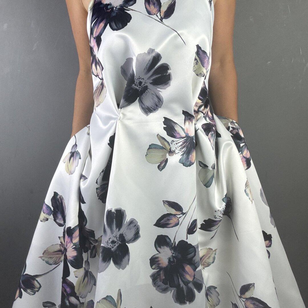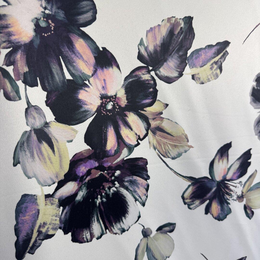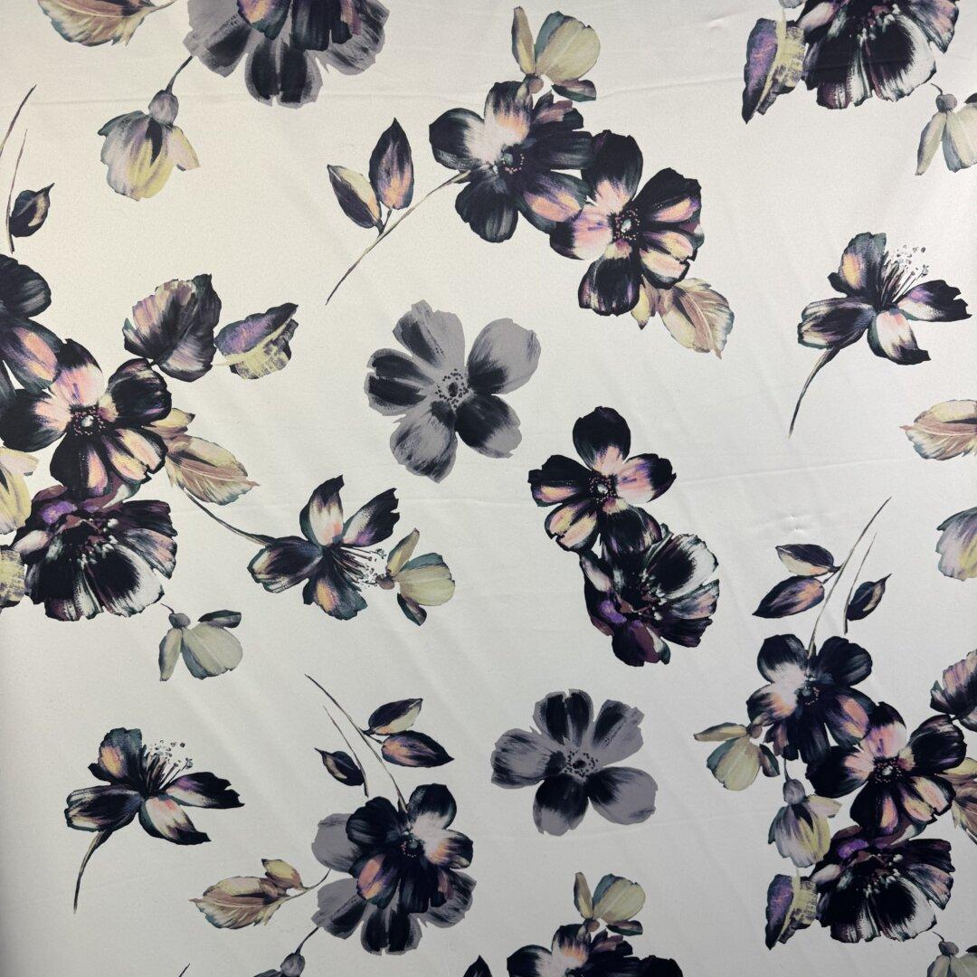 Heavy Duchess Satin Flowers is 148cm wide. This is a gorgeous quality dressmaking fabric that is a medium weight with a shine. Duchess Satin is perfect for special occasions and fancy holidays.