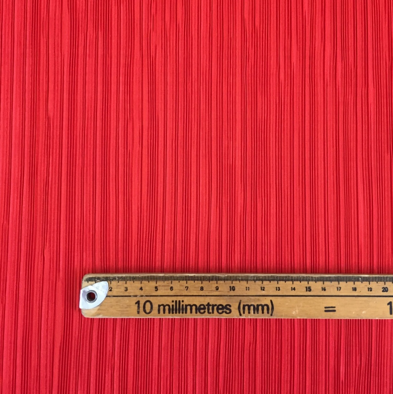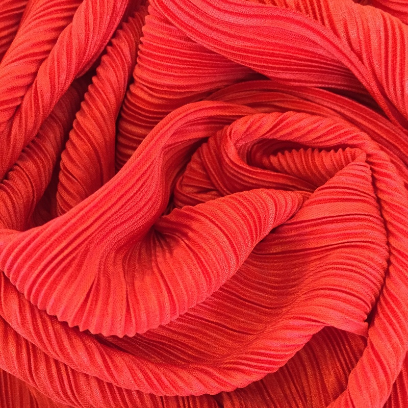 Isabella Tomato Red is a pleated polyester, 54″- 56″ wide. This is a light weight fabric that will hug the shape of the body offering an elegant feel as the fabric drapes. This fabric is perfect for wide leg trousers, palazzo pants, figure hugging dresses, cowl neck tops, tight tops, floaty skirts and so much more. A stylish look from day to evening wear, washes well at 30 degrees- minimum purchase 0.50cm.