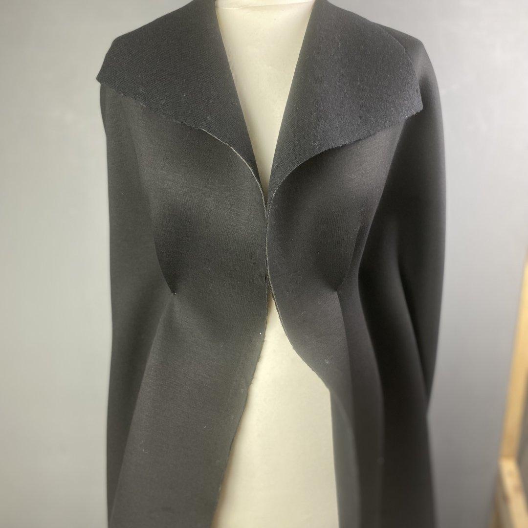 Italian Bonded Jersey Black is 148cm wide. Two viscose elastane jersey fabrics have been bonded together to create a warm, stretchy, fray free quality cloth. This fabric is perfect for winter shift dresses, roll neck tops, coats, jackets, skirts, trousers and so much more.