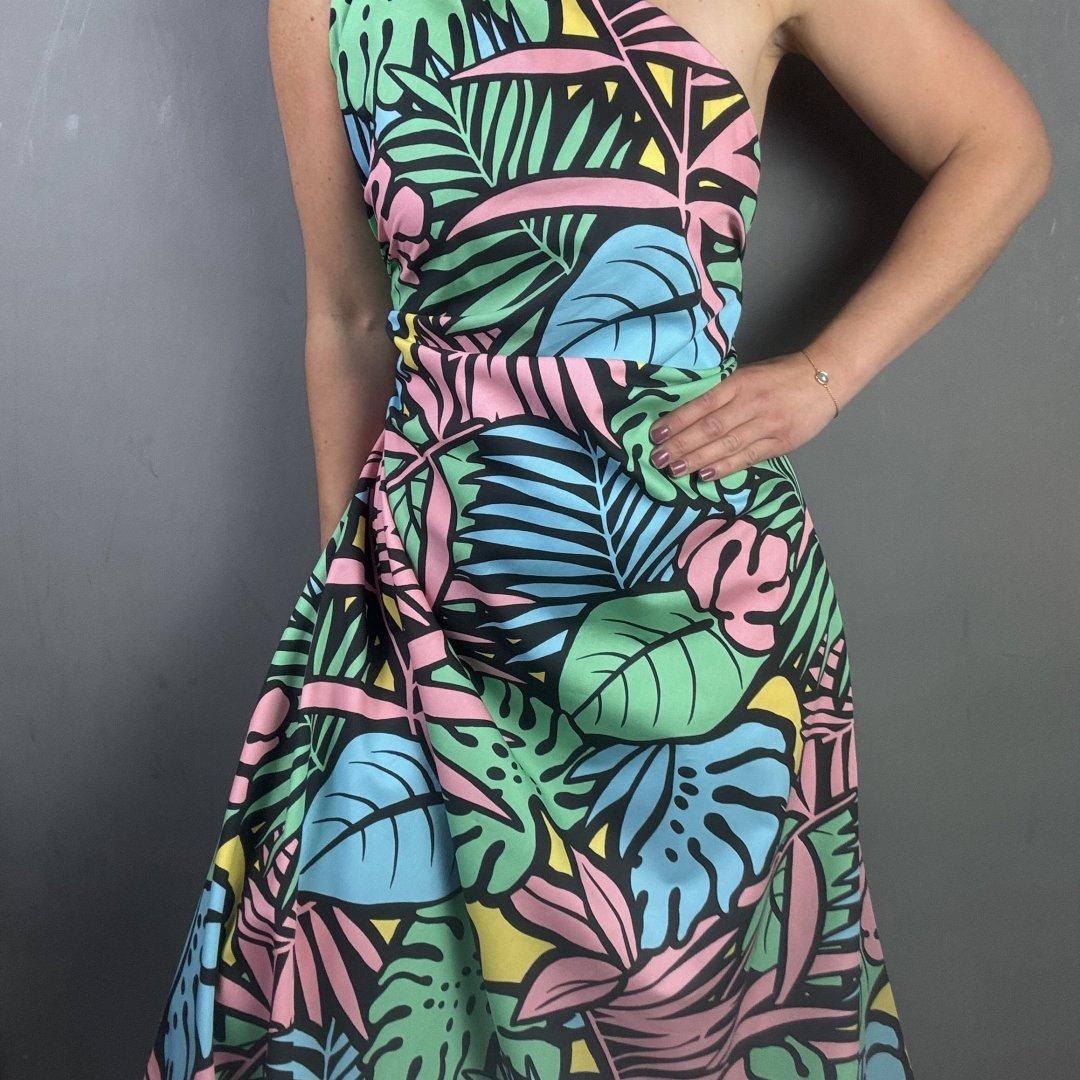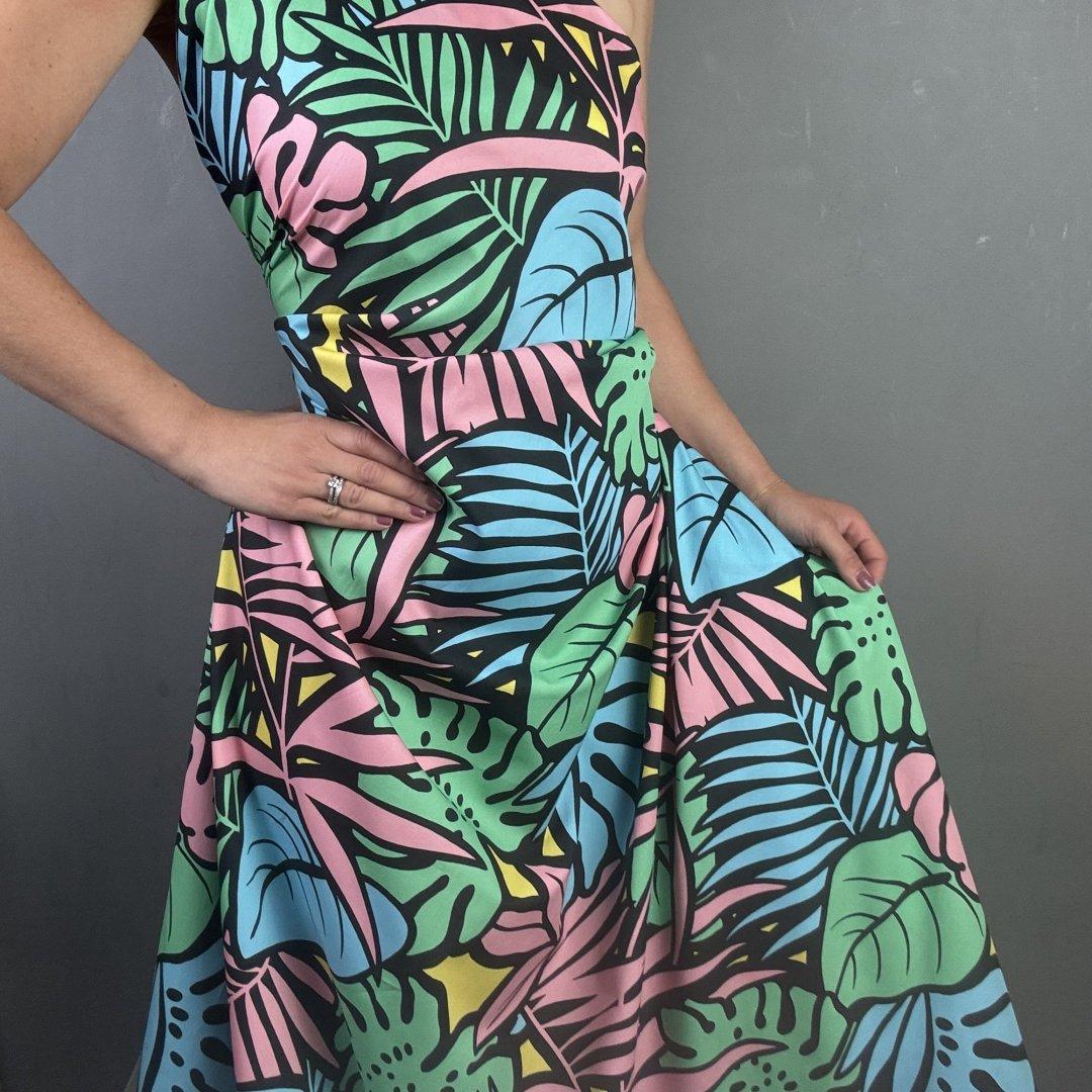 This fabric will create a statement look as the print and colours combine together are so striking and fun. Make this your go- to fabric for the summer. Suitable for day and evening wear.