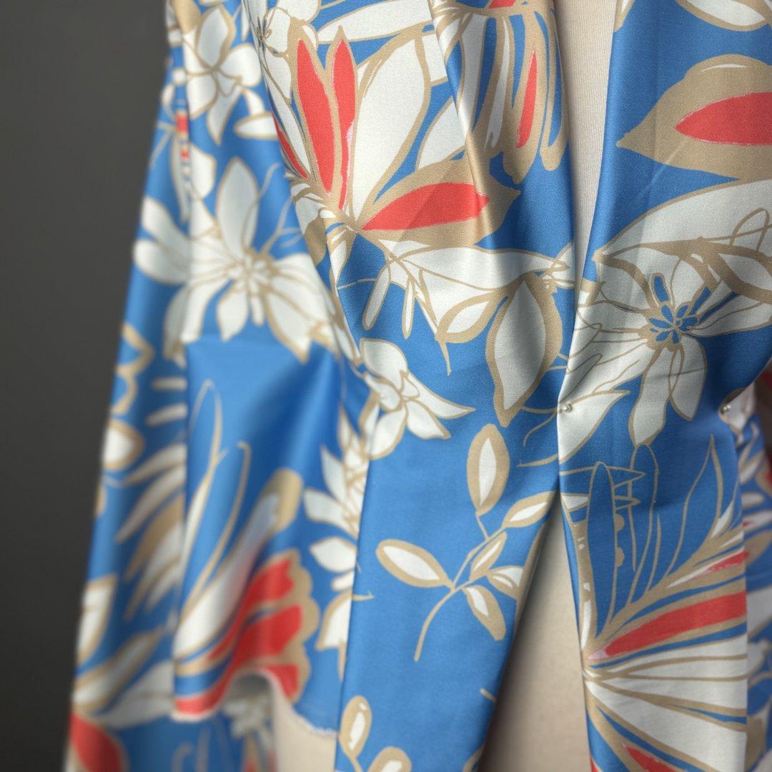 Italian Cotton and Lycra Blue Flowers is 140cm wide. This is an unbelievable Italian Cotton and Lycra that is perfect for shift dresses, summer jackets, straight trousers, pencil skirts, box pleat skirts, circle skirts, A- line skirts/ dresses, peplum tops, skater style dresses and more.