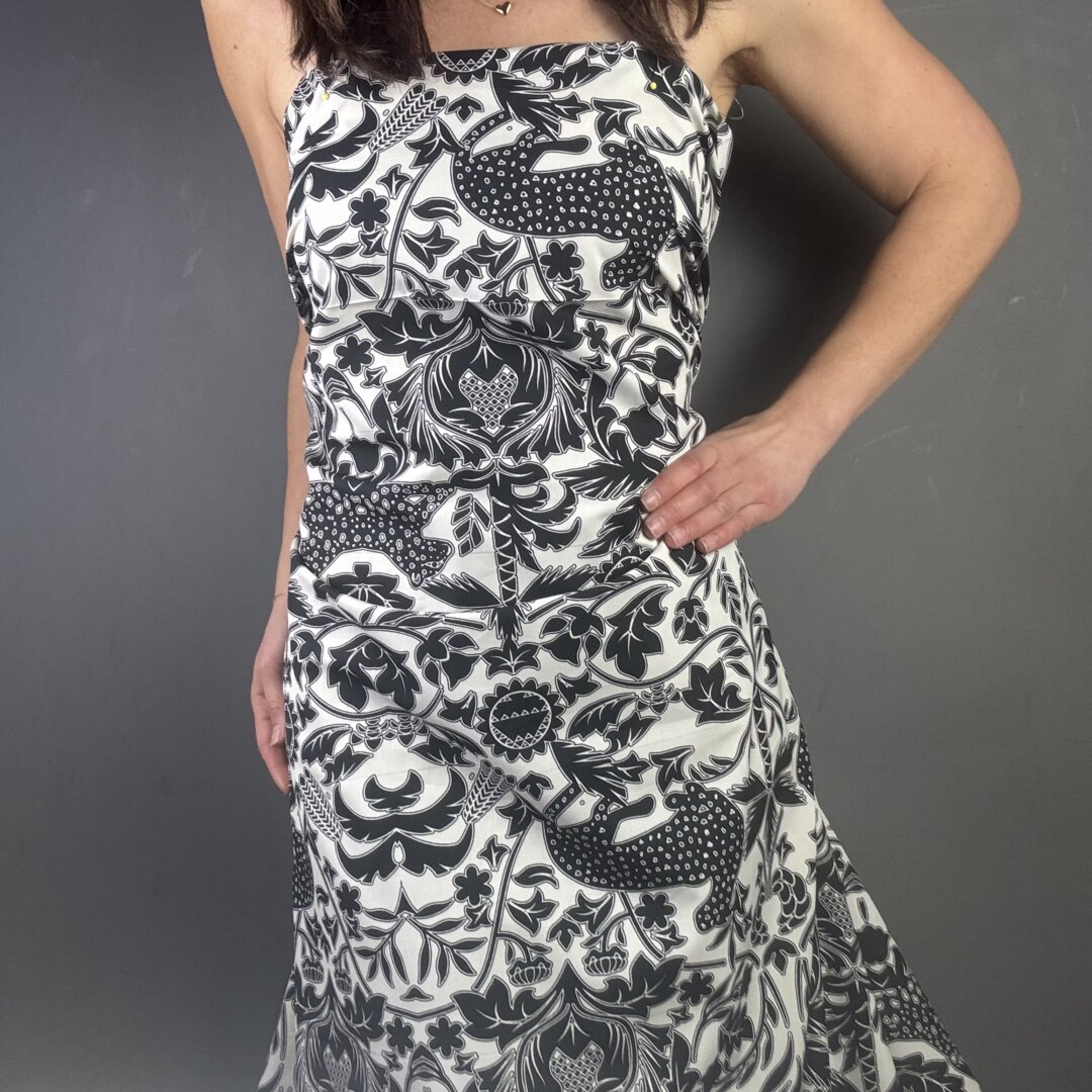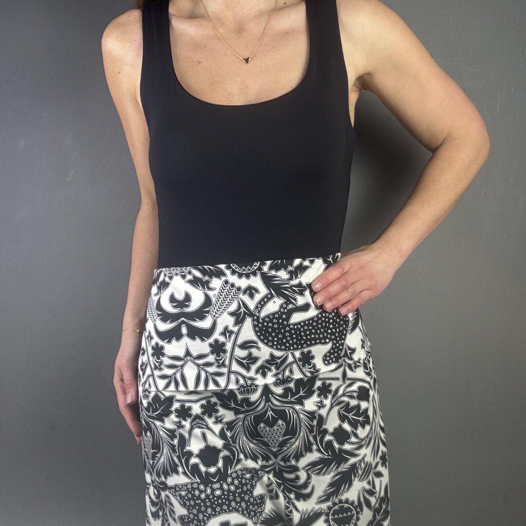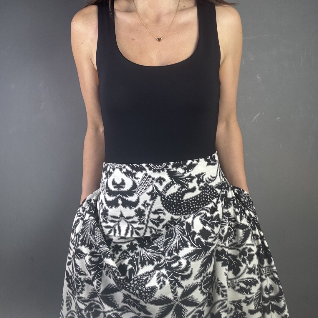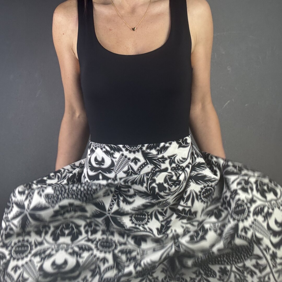 Italian pure cotton is 135cm wide. This fabric is a black and white work of art with a bold, striking design. Perfect for skirts, dresses, shirts, tops, loose-fitted trousers, and more. Enjoy making a statement with this beautiful fabric.