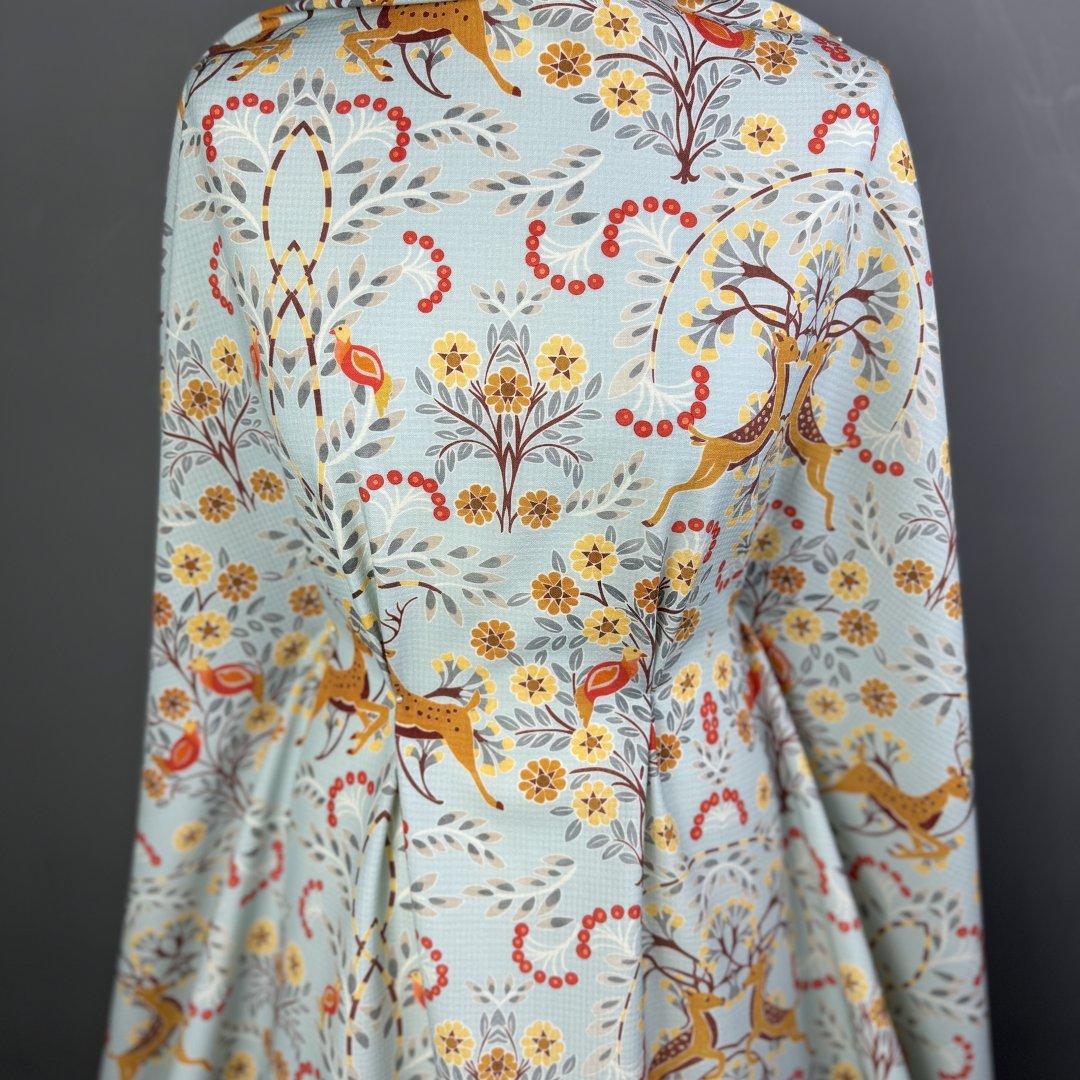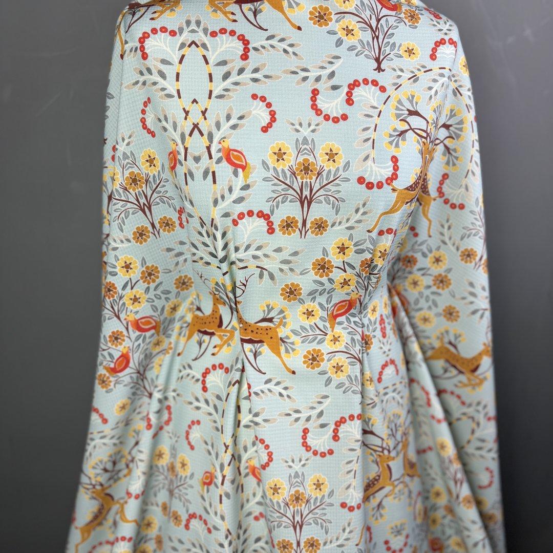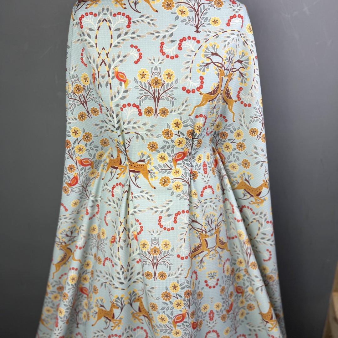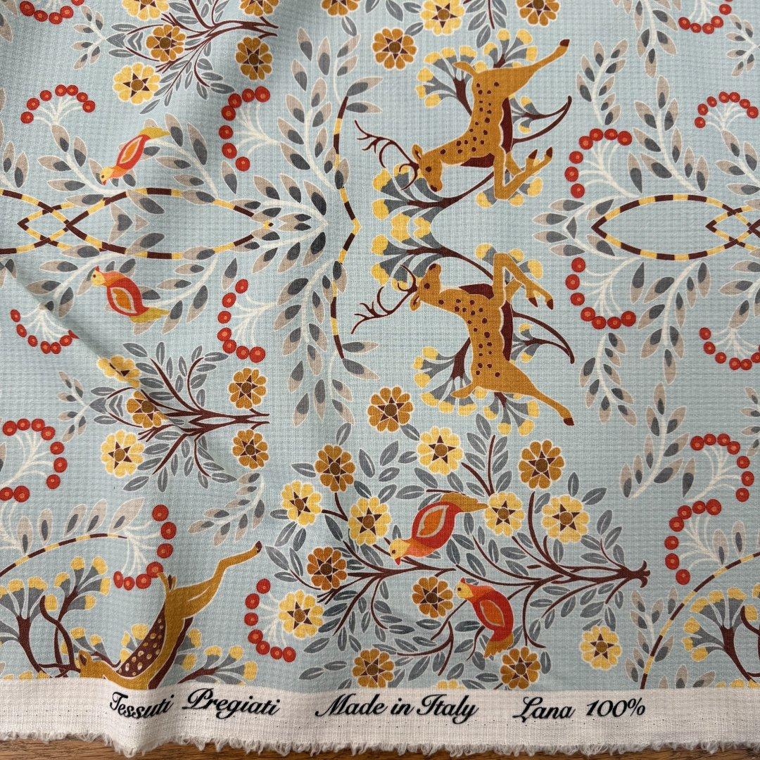 Italian Doe A Dear wool is 150cm wide. This is a stunning Italian quality pure wool. It’s a light weight cloth with a fluid drape and a waffle effect weave that you can see behind the beautiful print. This is a magical, happy and chic design that is perfect for everyday spring jackets, shift dresses, swishy dresses, trousers, box pleat skirts, straight skirts and so much more.