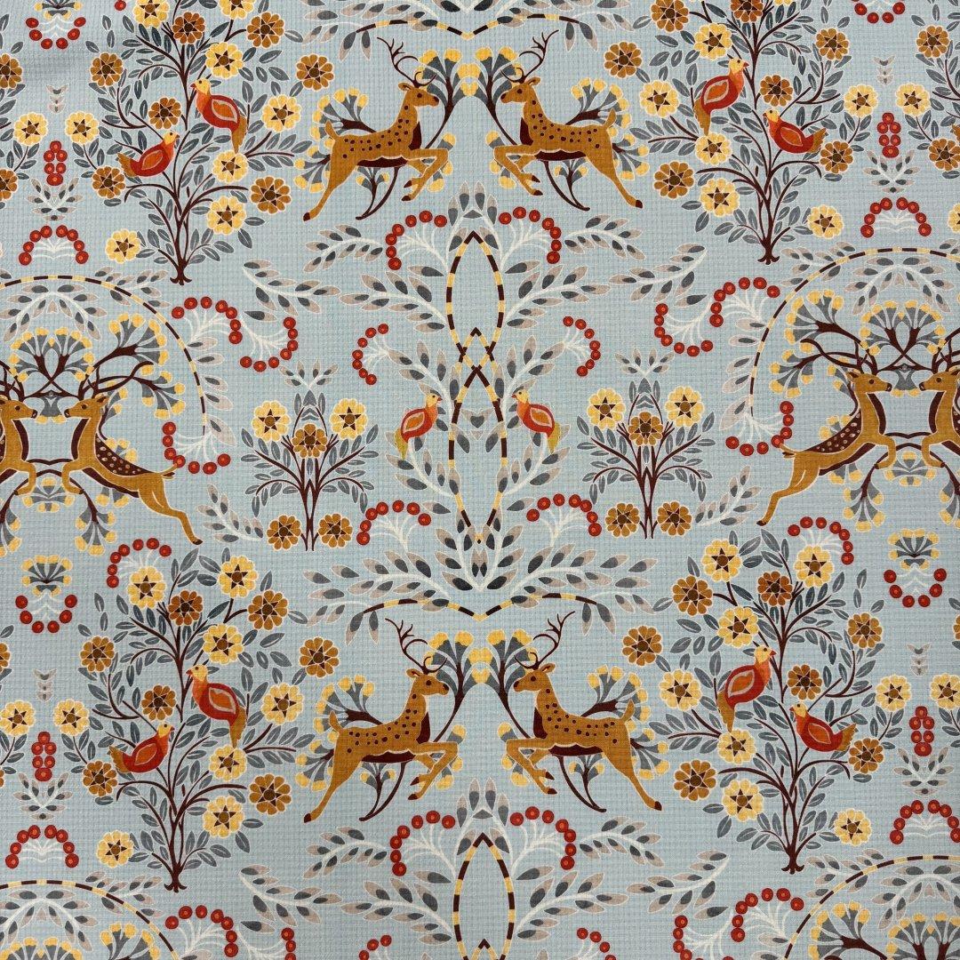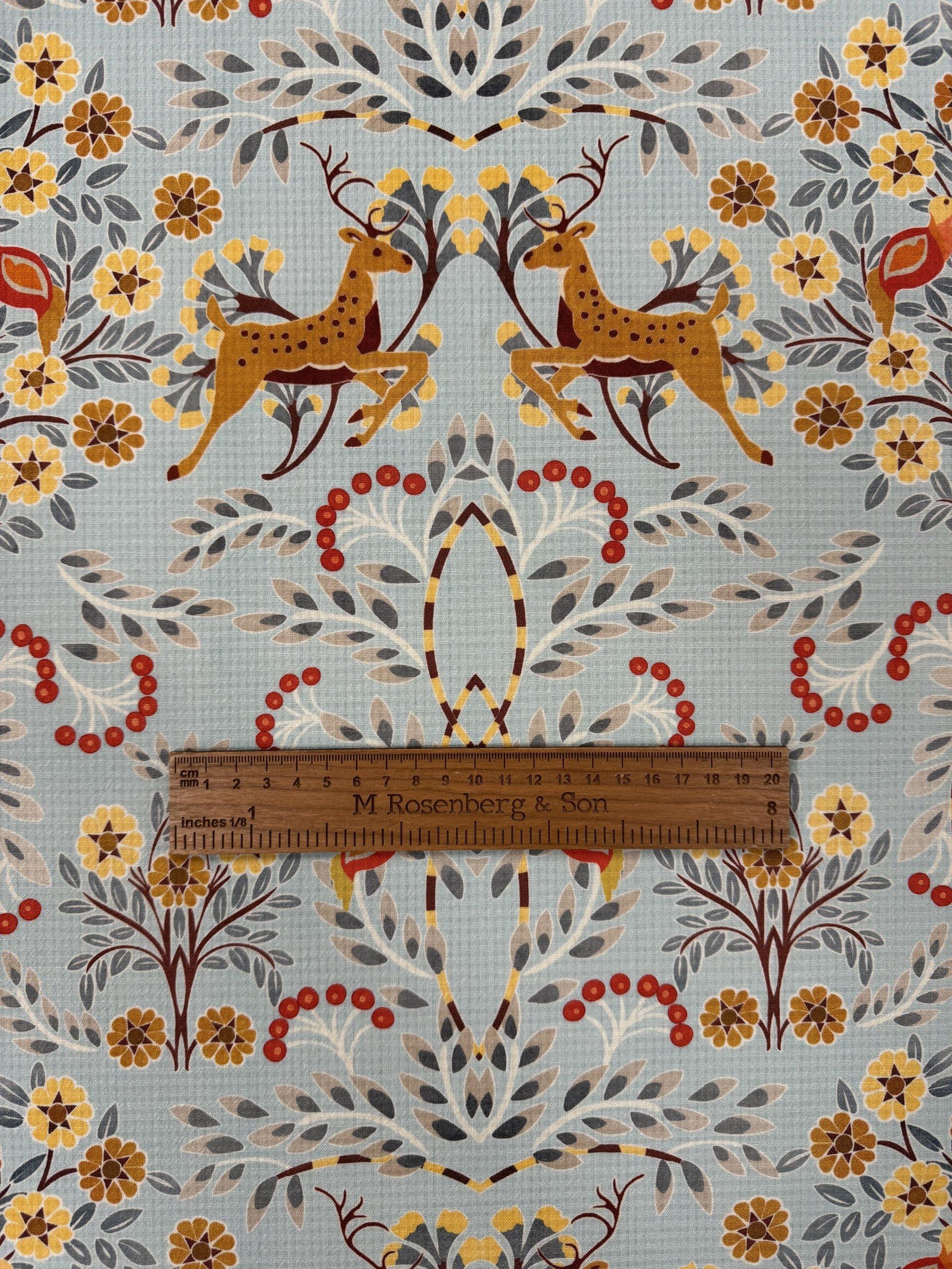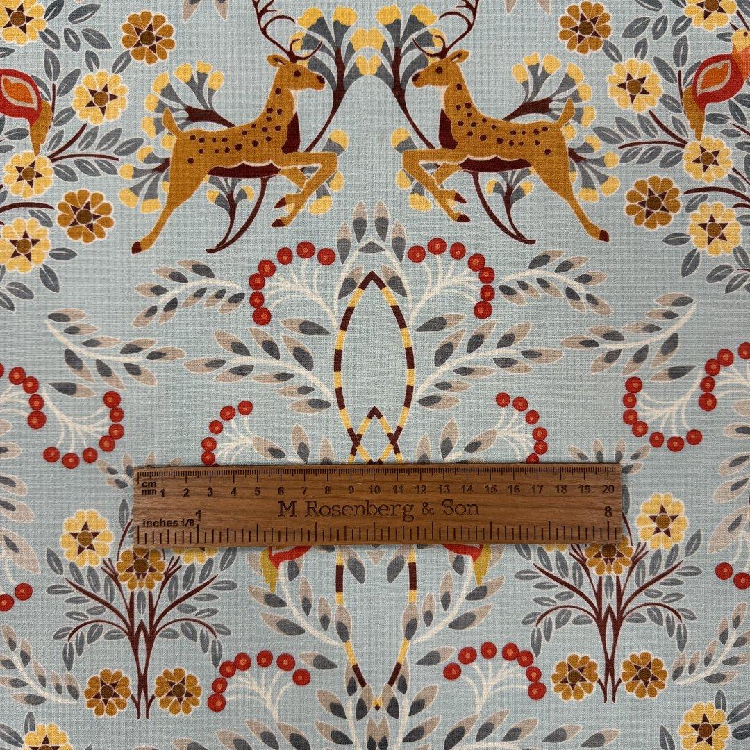 Italian Doe A Dear wool is 150cm wide. This is a stunning Italian quality pure wool. It’s a light weight cloth with a fluid drape and a waffle effect weave that you can see behind the beautiful print. This is a magical, happy and chic design that is perfect for everyday spring jackets, shift dresses, swishy dresses, trousers, box pleat skirts, straight skirts and so much more.
