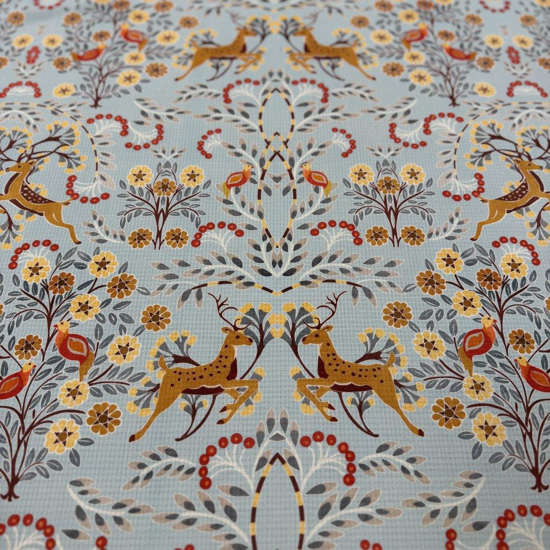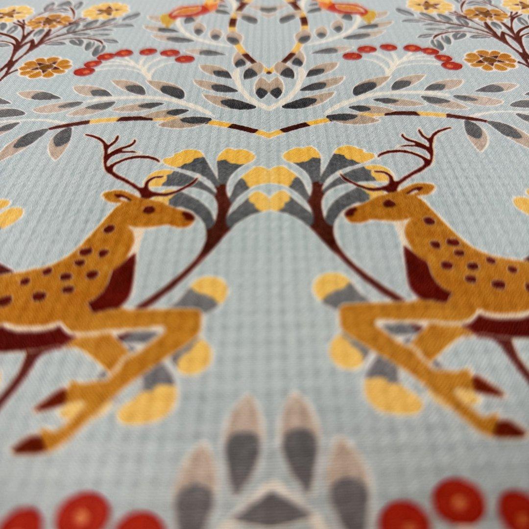 Print- Flowers, dears and a bird. The flowers flow with beautiful colour tones giving the effect of a fluid, dancing print.