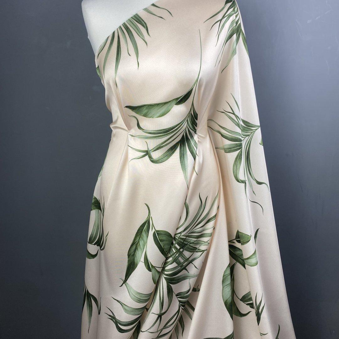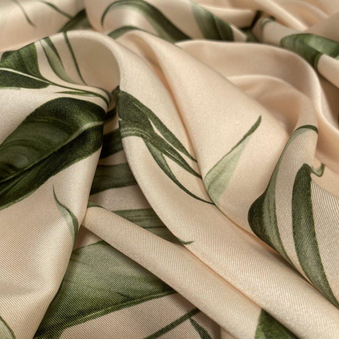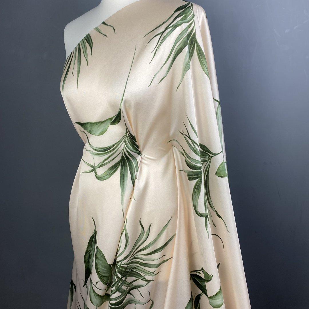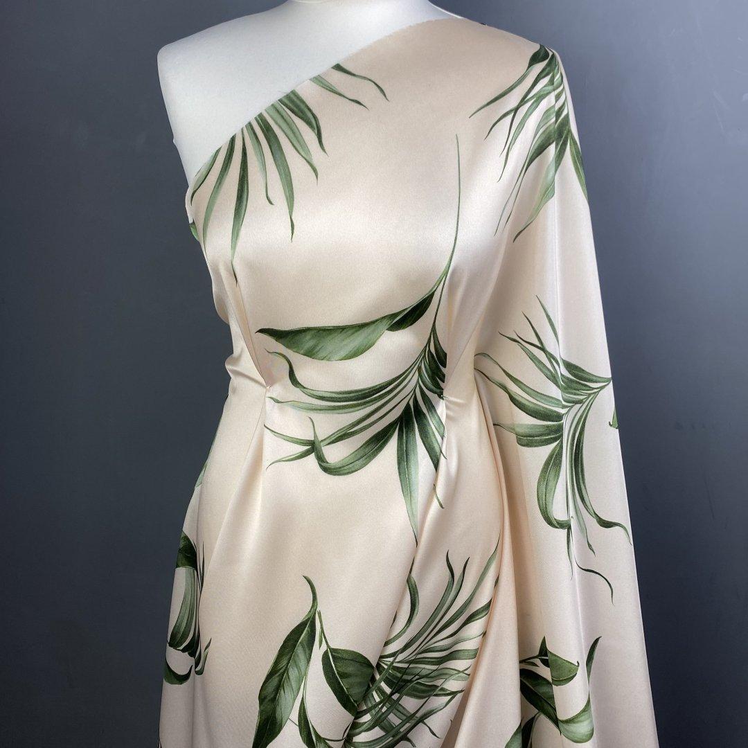 Italian Dreamy Leaves is 150cm wide. This is a stunning, subtle, medium twill weight polyester with a gorgeous fluid drape. This fabric is perfect for maxi dresses, jumpsuits, wide leg trousers, shift dresses, shirt dresses, tops, kaftans and so much more. Italian Dreamy Leaves is ideal for day to evening wear. This is a truly beautiful fabric- the true colour way is shown on the mannequin.