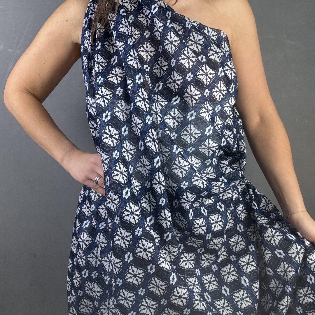 A most beautiful fabric which is soft and swishy. I made a dress (McCalls 7948 view D with view B sleeves). I also lowered the neckline a bit so didn’t need the back neck slit and button. I recommend prewashing the fabric with a colour catcher sheet as quite a lot of excess blue dye came out.