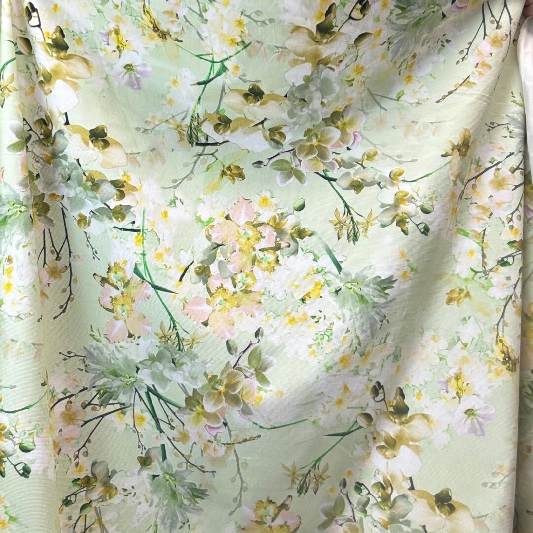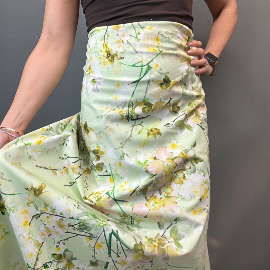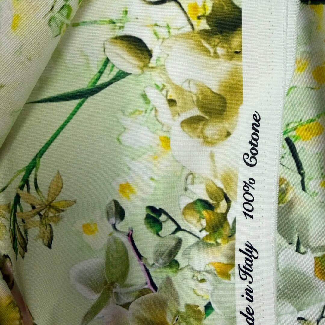 A stunning Italian heavyweight cotton fabric featuring a vibrant lime-toned floral design. Structured yet easy to sew, this fabric holds its shape beautifully, making it perfect for more tailored and statement pieces.