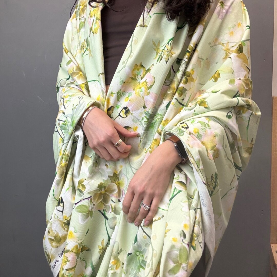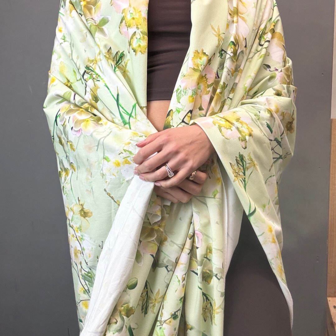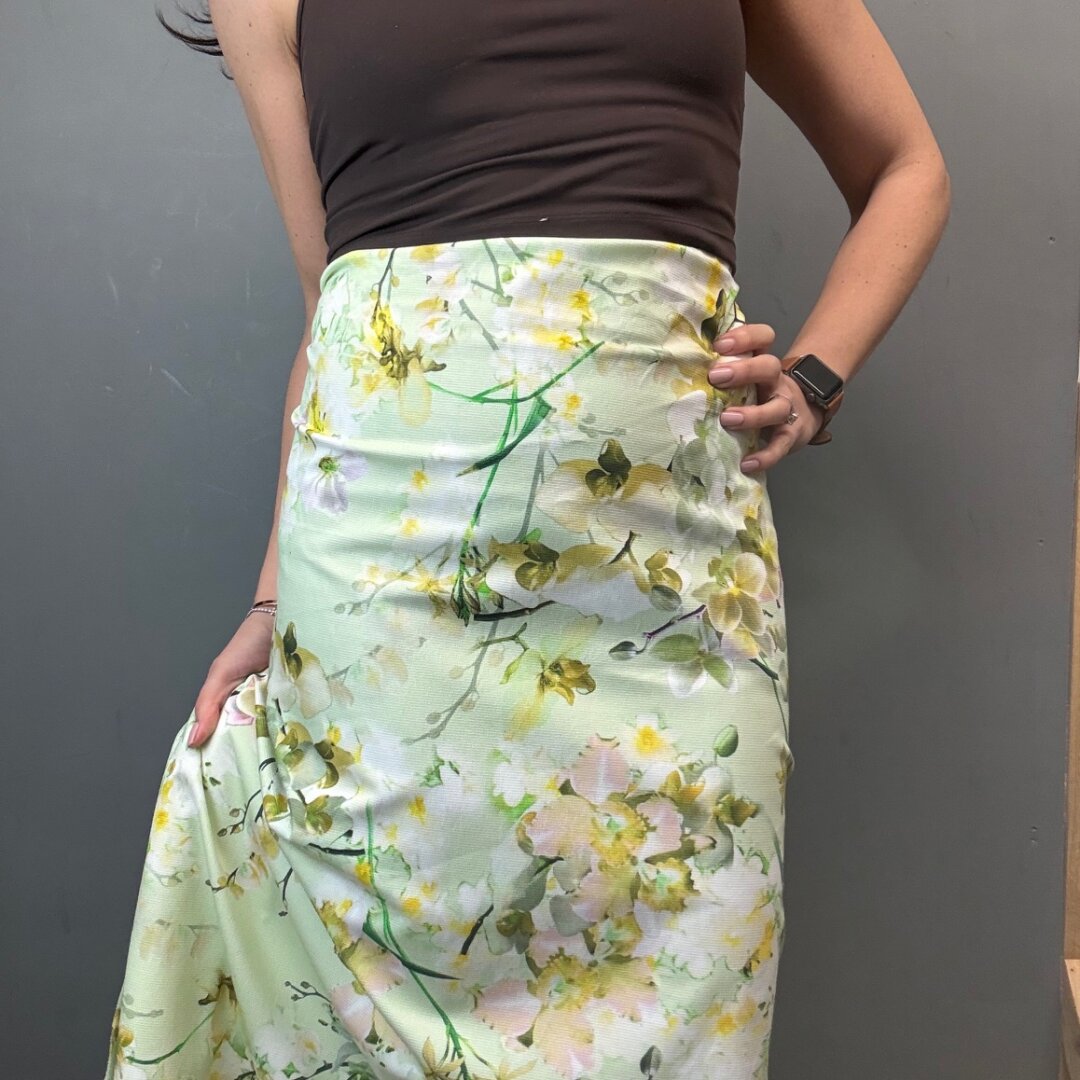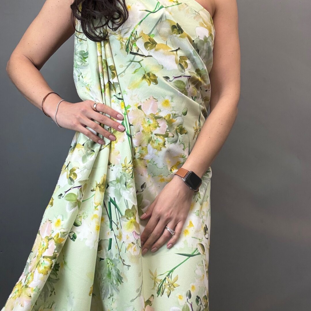 A stunning Italian heavyweight cotton fabric featuring a vibrant lime-toned floral design. Structured yet easy to sew, this fabric holds its shape beautifully, making it perfect for more tailored and statement pieces.
