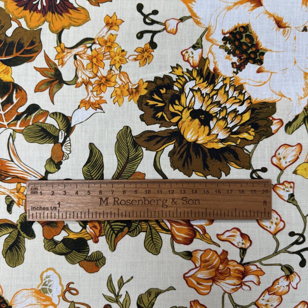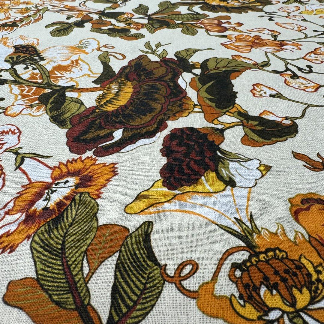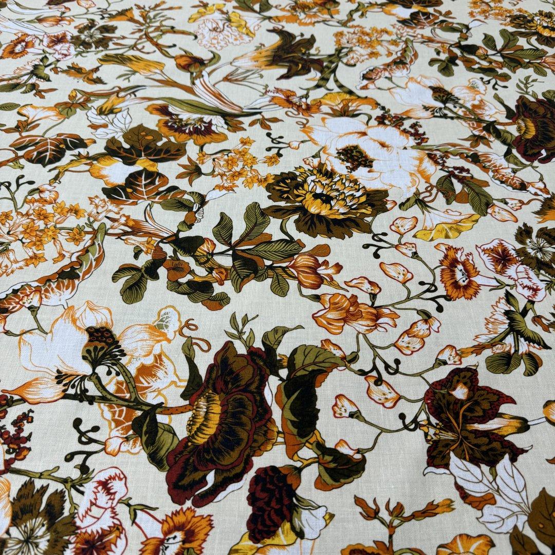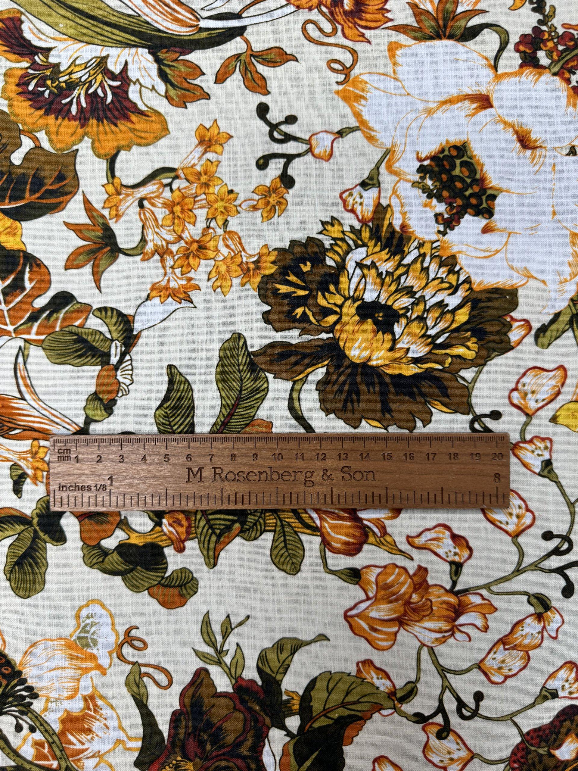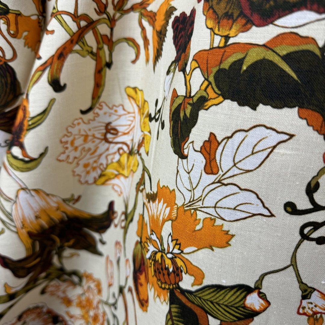 Italian Linen and Rayon Autumn Life is 150cm wide. This is the most stunning fabric that I have fallen inlove with. Italian Linen and Rayon is a wonderful mix of two natural fibres that will keep you nice and cool in warm weather and won’t crease as much as pure linen.
