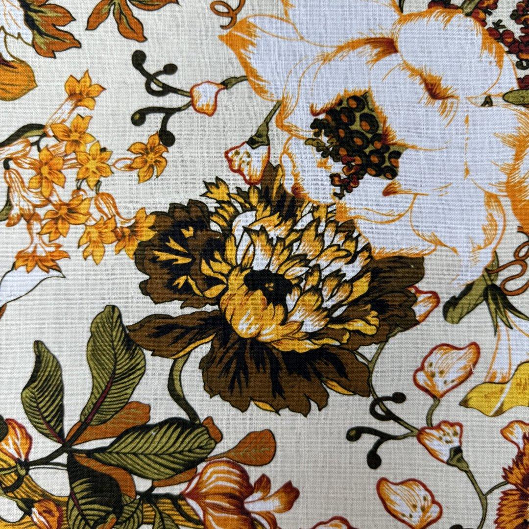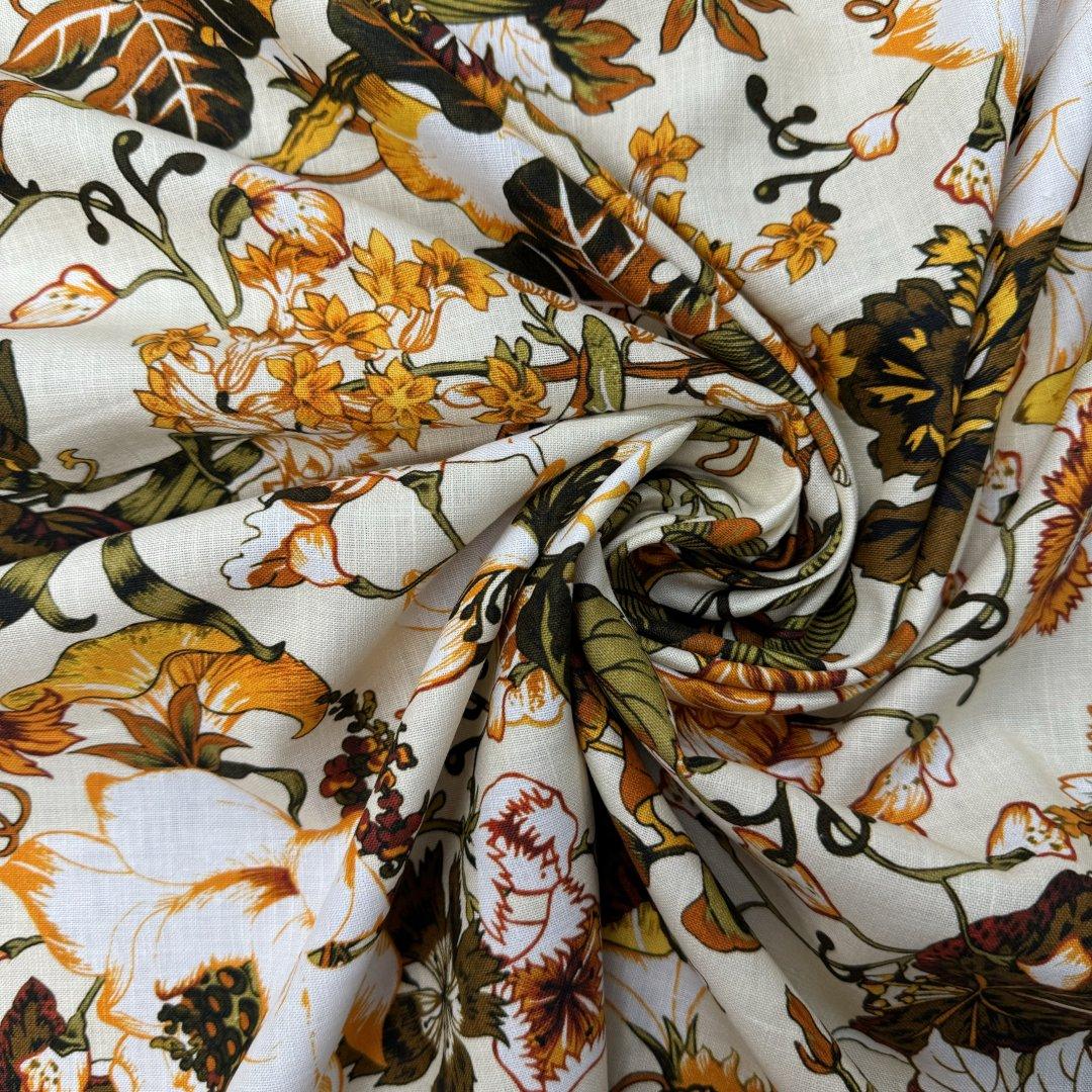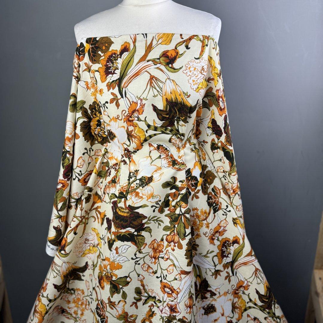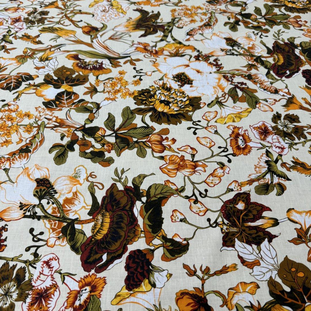 Italian Linen and Rayon Autumn Life is 150cm wide. This is the most stunning fabric that I have fallen inlove with. Italian Linen and Rayon is a wonderful mix of two natural fibres that will keep you nice and cool in warm weather and won’t crease as much as pure linen.