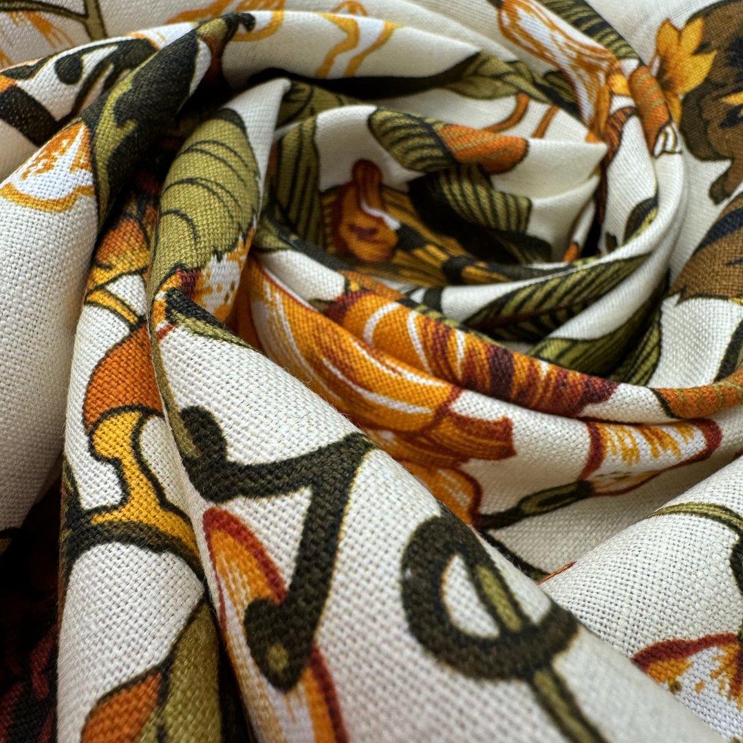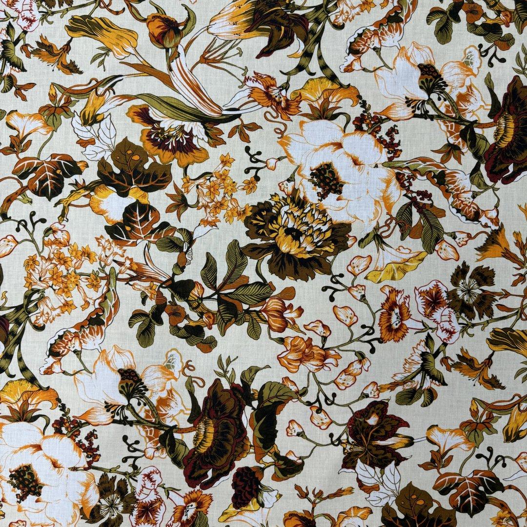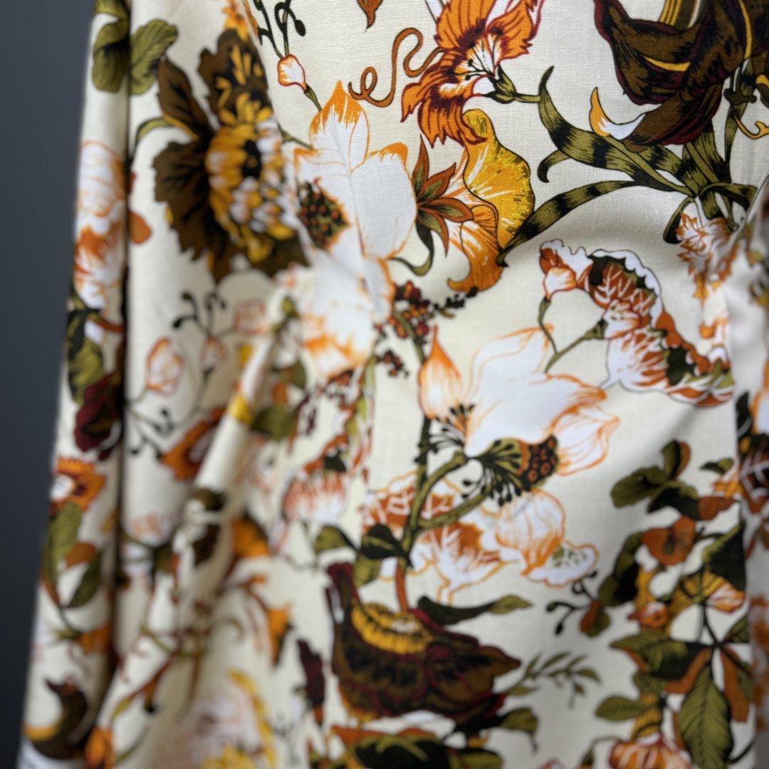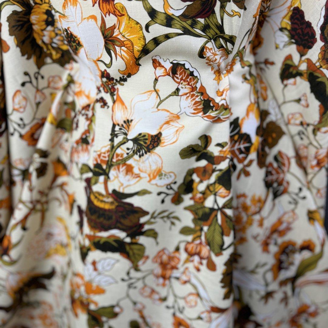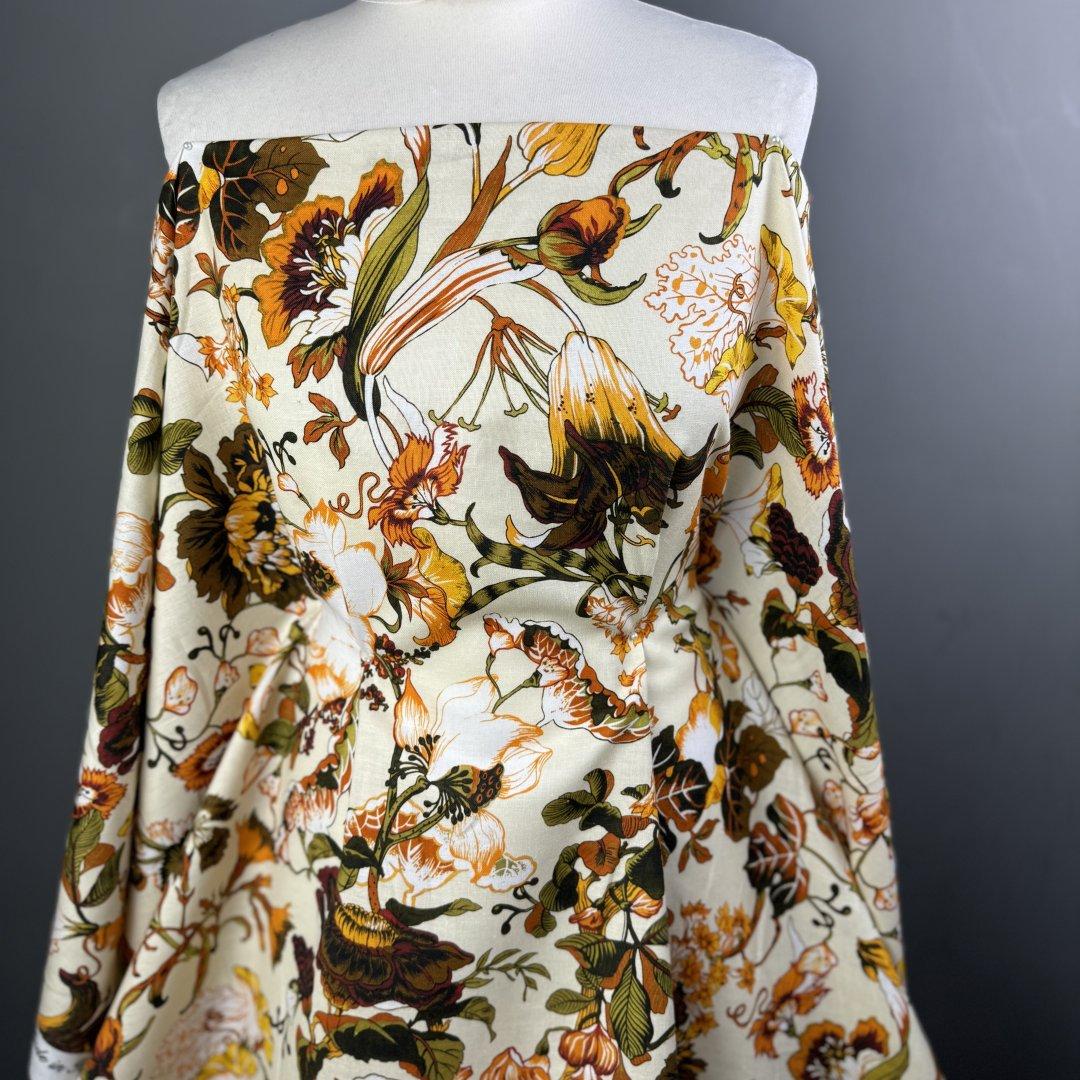 Italian Linen and Rayon Autumn Life is 150cm wide. This is the most stunning fabric that I have fallen inlove with. Italian Linen and Rayon is a wonderful mix of two natural fibres that will keep you nice and cool in warm weather and won’t crease as much as pure linen.