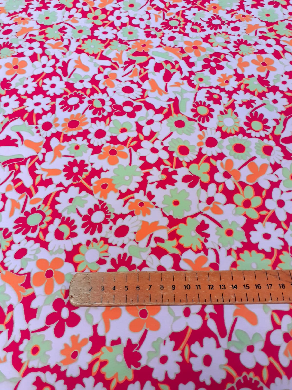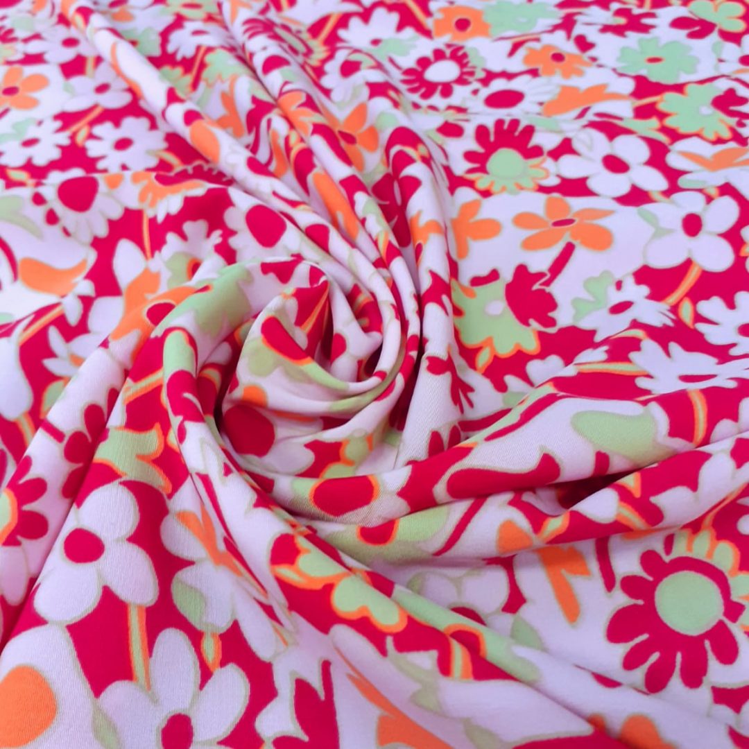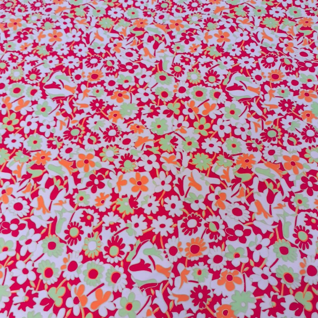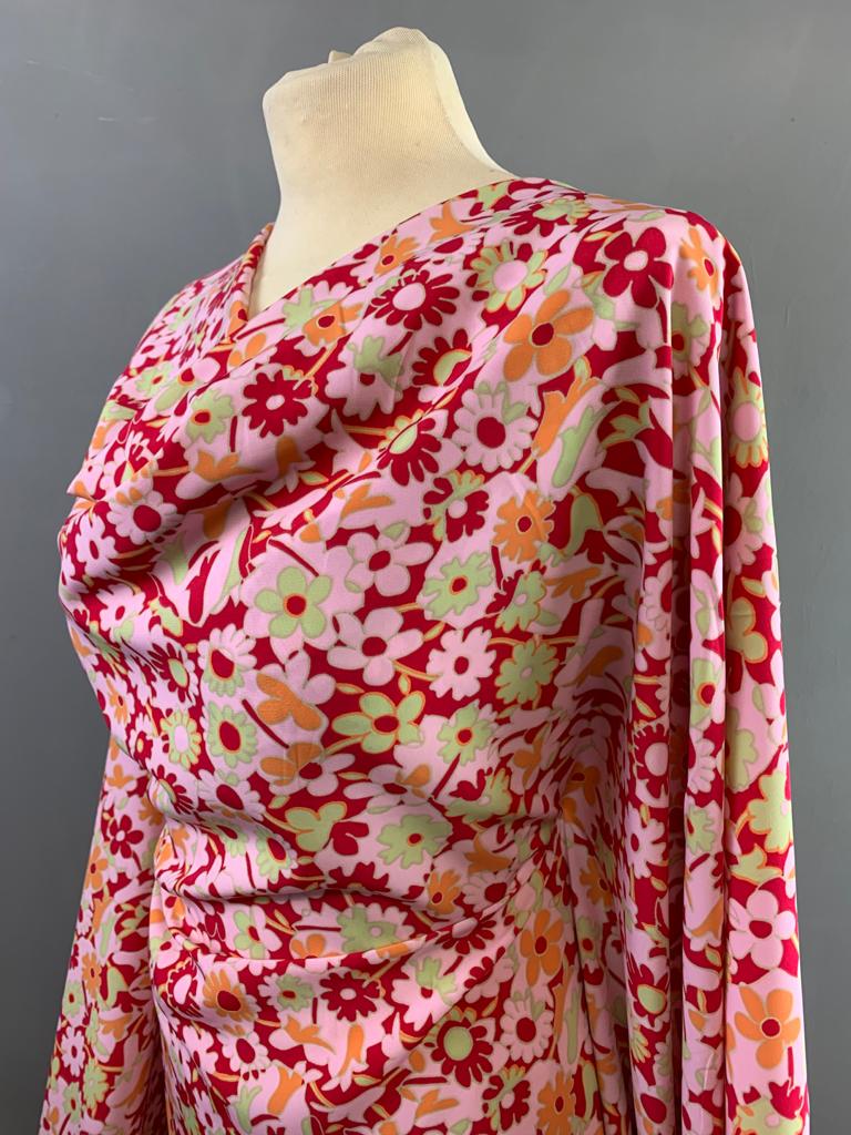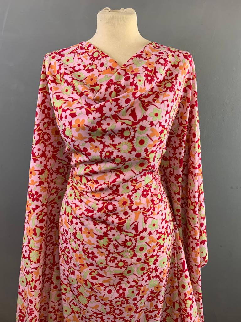 Italian Peach Skin Polyester is 150cm wide. It has a pink background with light green and orange small flowers. It will make lovely summer dresses and skirts.