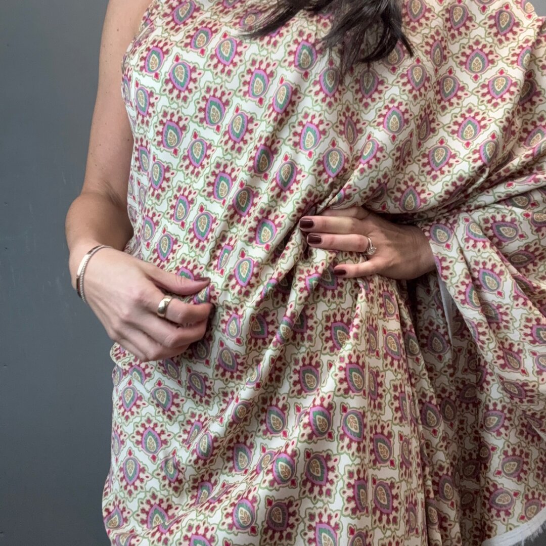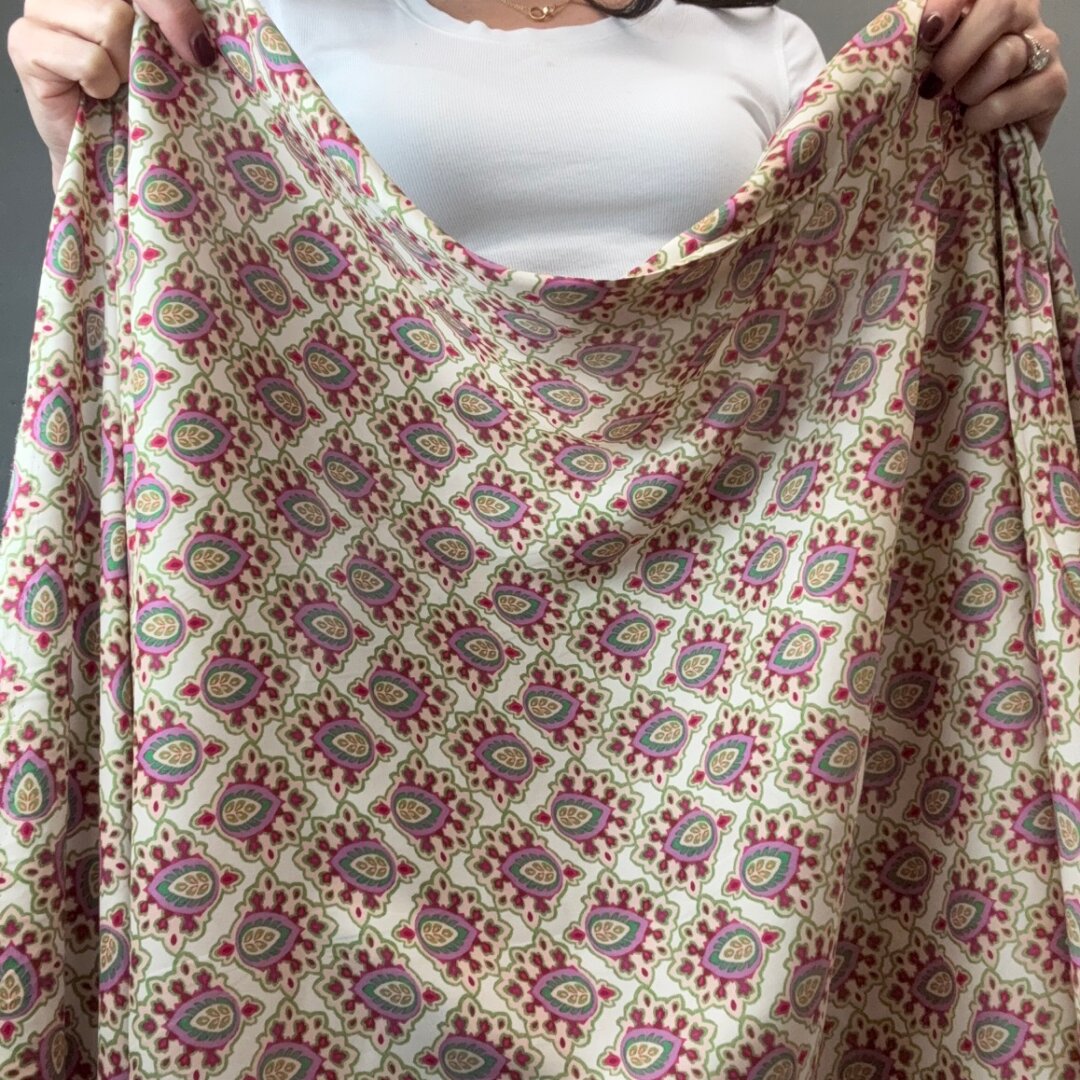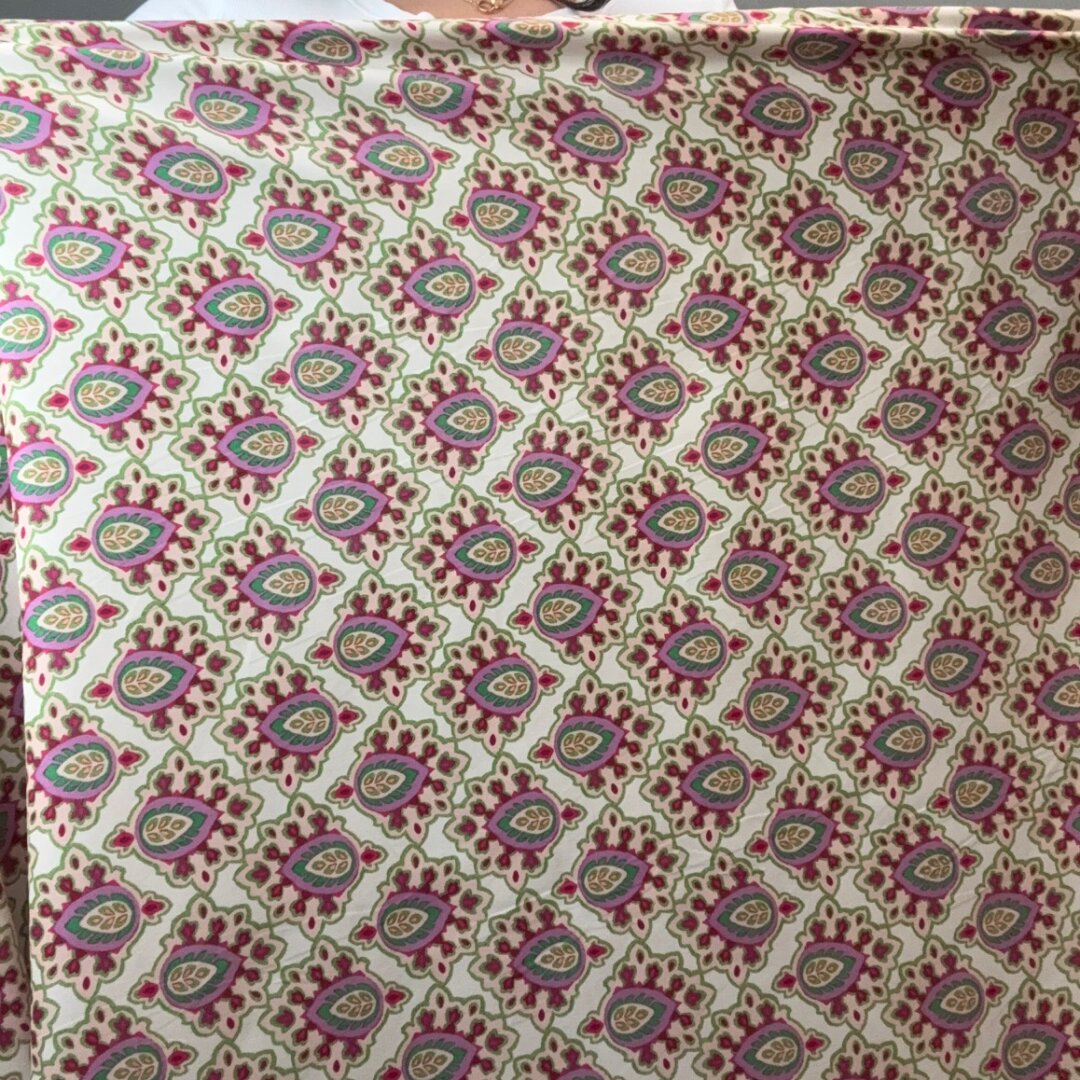 Italian Polyester Crepe de Chine is 150cm wide. This lightweight, fluid fabric is ideal for everyday skirts, dresses, loose-fitting trousers, shirts, tops, and much more. Featuring a stunning print, it’s perfect for welcoming in springtime.