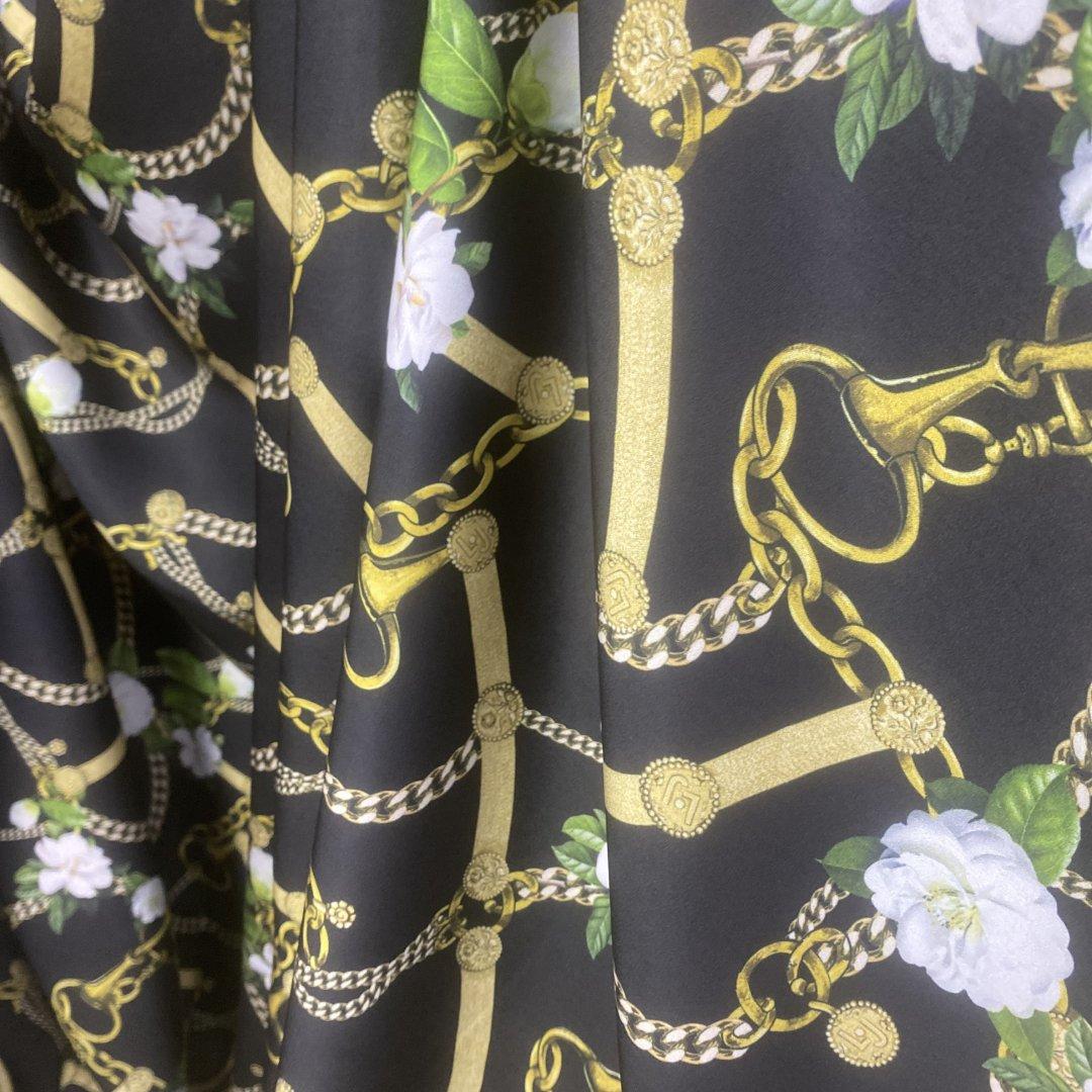 Italian Polyester Gold Chains is 150cm. This is a light weight glamorous polyester with a fluid drape ideal for floaty maxi dresses, straight skirts, shirts, tops, trousers, shift dresses and so much more. This fabric will create statement garments that are suitable for special occasions. This is a quality polyester with a stunning print.
