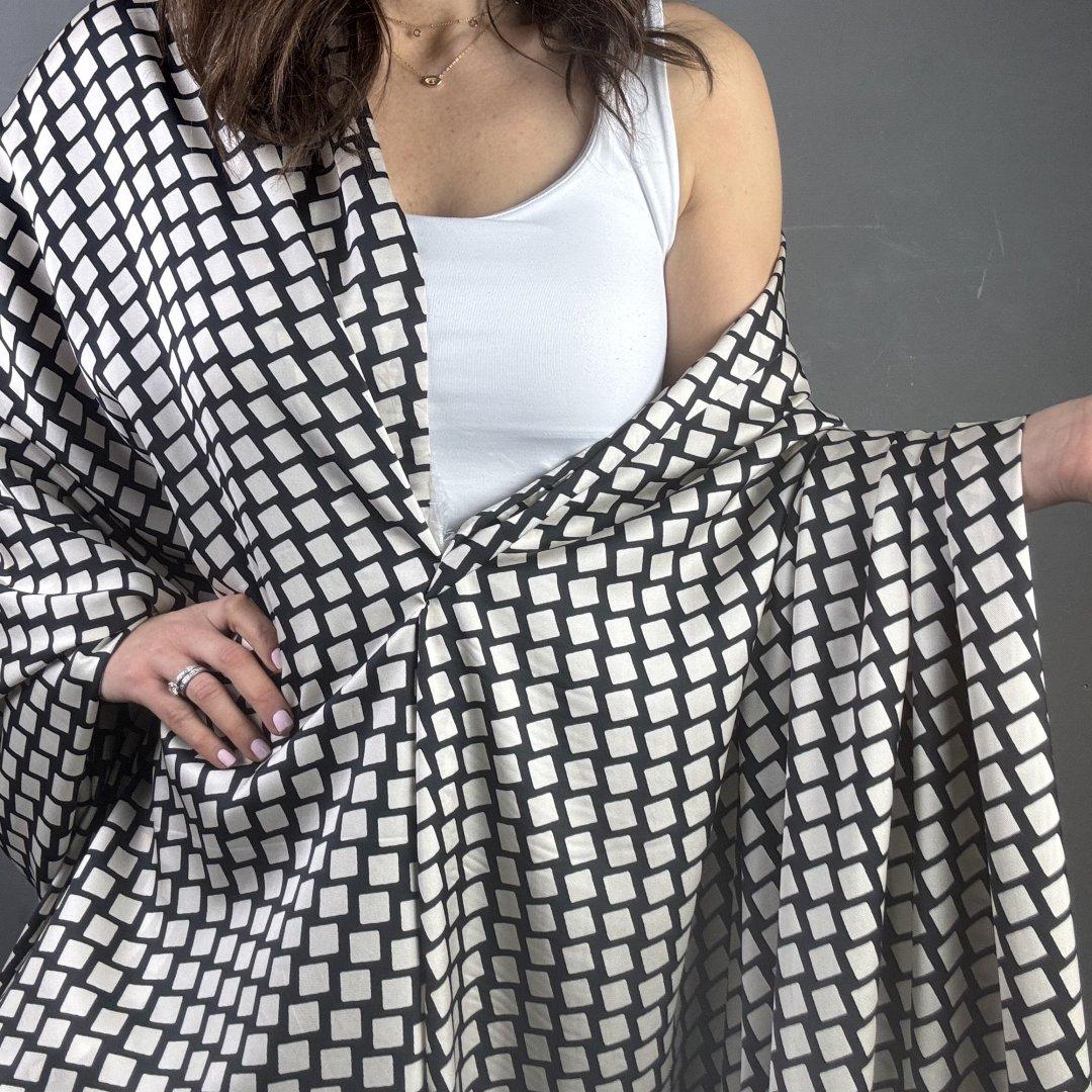 Italian Polyester Twill Fancy is 145cm wide. This is a truly gorgeous cloth in every sense of the word. The base cloth itself is a fantastic quality polyester that will move and glide with elegance and grace showing off how beautiful Italian Polyester really is. And the print is simple, chic and timeless. No matter what garment you make the fabric will leave you feeling comfortable and looking beautiful.