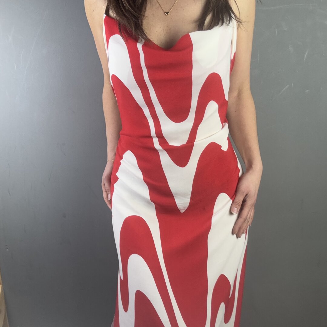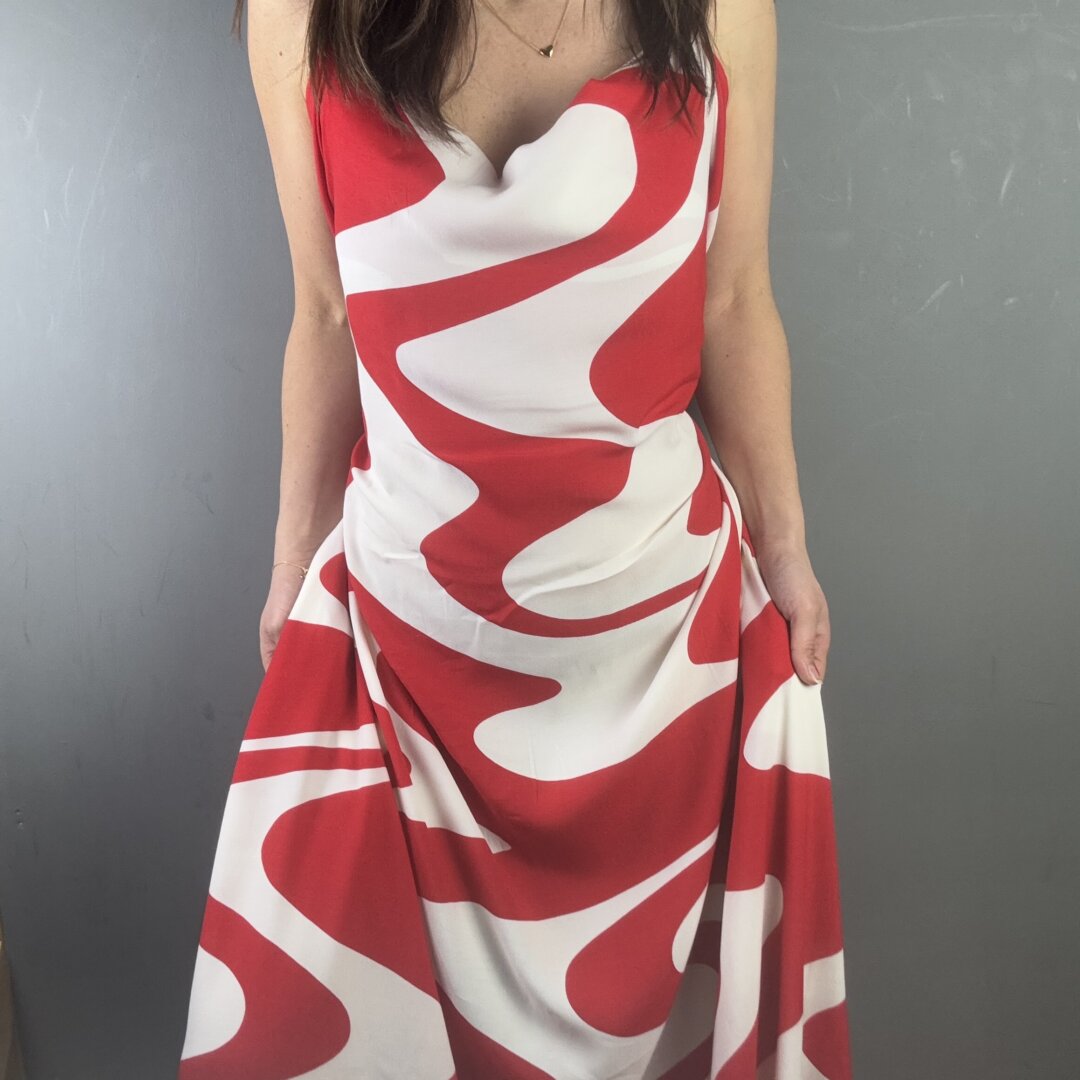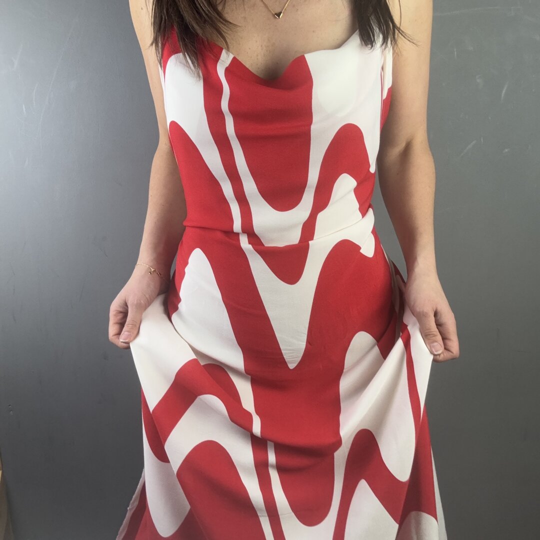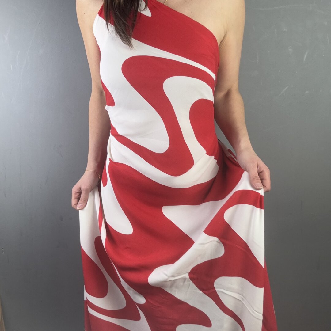 Italian Red Rayon is a beautifully lightweight fabric, 145cm wide, featuring a bold and playful abstract print that feels fresh and full of character. It has a soft, fluid drape that moves effortlessly, making it a dream to sew and wear.